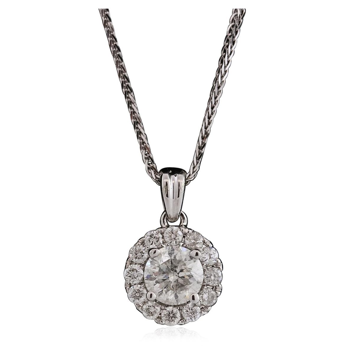 One electronically tested 14KT white gold ladies combination cast & assembled diamond pendant & chain 18.0" long, medium fancy cable with a lobster claw clasp with a bright polish finish. Identified with markings of "14K". Condition is new. Containing: One prong set round brilliant cut diamond, measuring 5.46 - 5.45 x 3.55mm (depth est.) approximate weight of 0.64ct. Clarity: I-2. Color: J, Cut is Good. Twelve prong set round brilliant cut diamonds, measuring 1.80 - 1.80 x 1.08mm (depth est.) approximate total weight of 12 Stones = 0.26ct. Clarity: SI-2 to I-2. Color: H - J, Cut is Good. All diamonds are graded in the mounting, unless otherwise stated. Total Weight of Diamonds 0.90ct. Total Weight of Pendant & Chain 2.70 grams. GGL Appraised at $3,890.00.