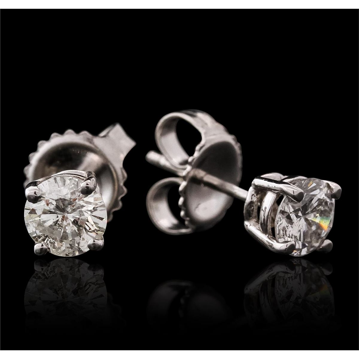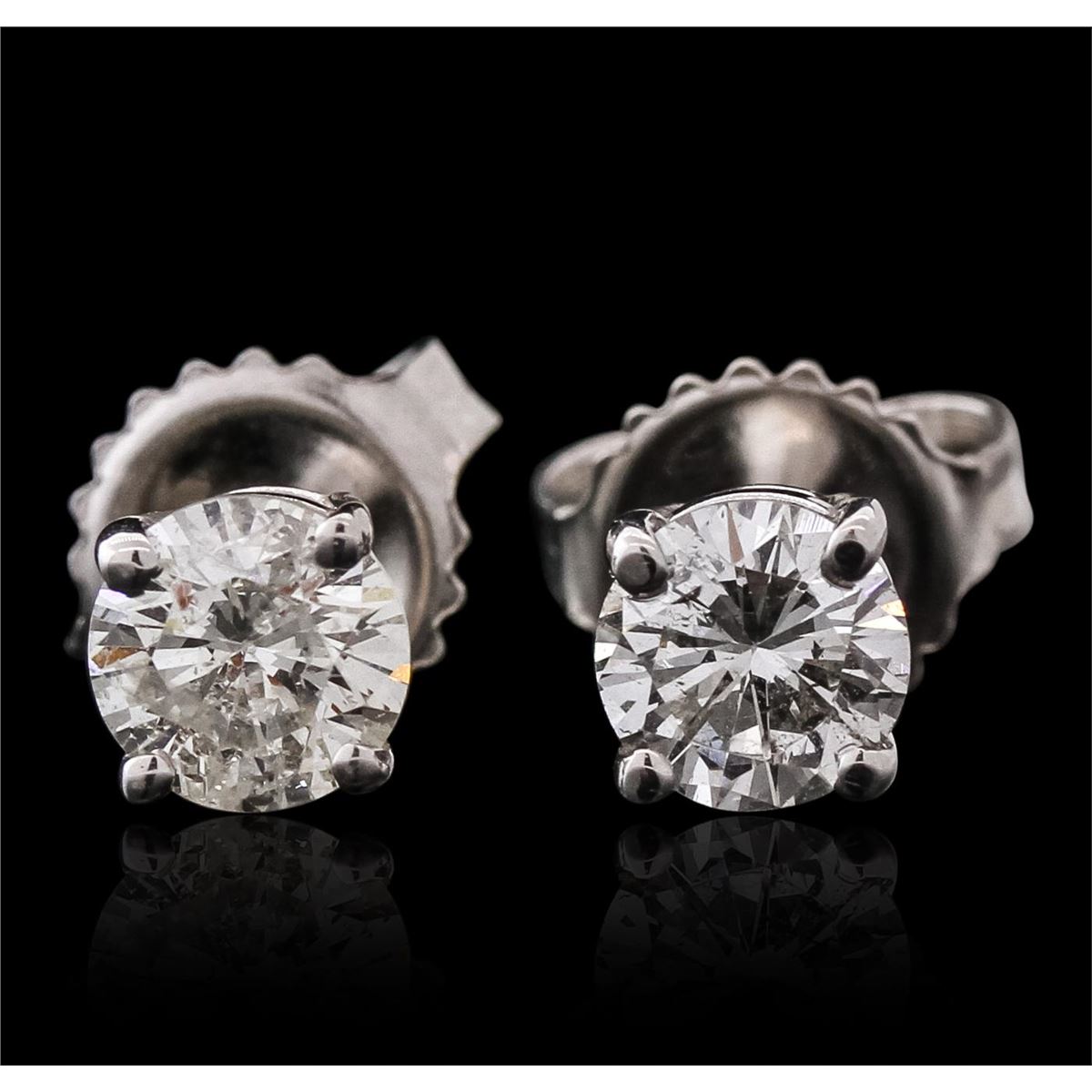 One pair electronically tested 14KT white gold cast & assembled diamond solitaire earrings with standard backs. Condition is new, good workmanship. Containing: One prong set round brilliant cut diamond, measuring 4.90 - 4.90 x 3.00mm (depth est.), 3.00% GTCF approximate weight of 0.45ct. Graded in the setting. Clarity: I-1. Color: I. Depth 61.2%. Table 61.6%. One prong set round brilliant cut diamond, measuring 5.00 - 5.00 x 2.98mm (depth est.) approximate weight of 0.45ct with a medium blue fluorescence. Graded in the setting. Clarity: I-2. Color: 59.6%. Table 55.6%. Total Weight of Diamonds 0.90ct. Total Weight of Earrings 1.15 grams. AIG Appraised at $2,780.00.