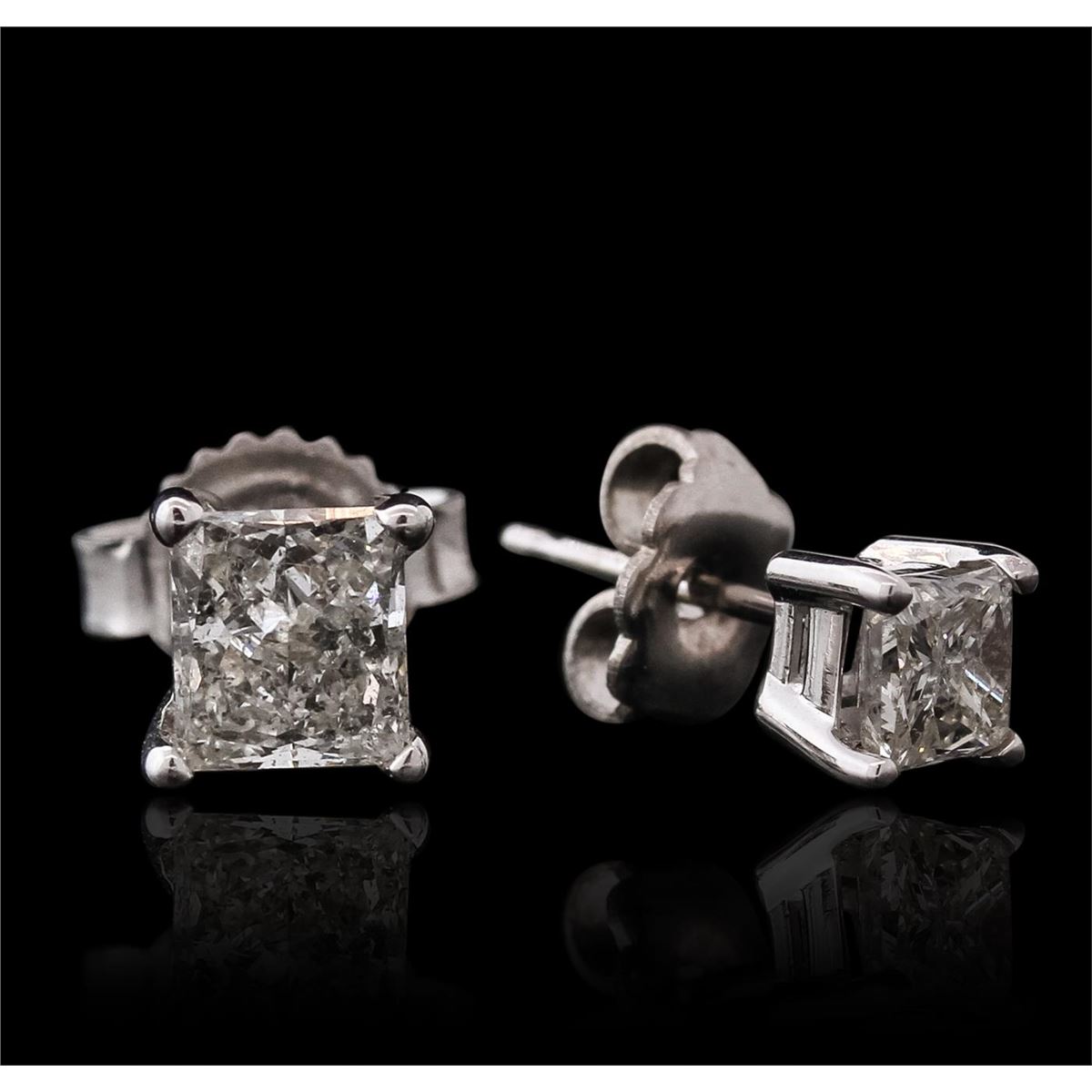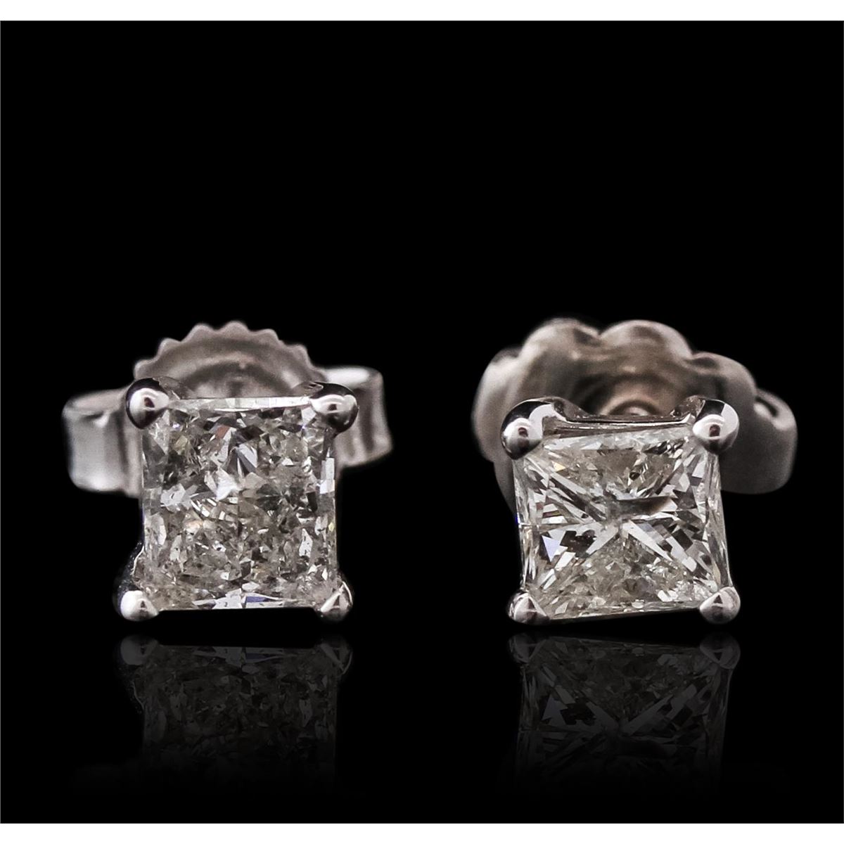 One pair electronically tested 14KT white gold cast & assembled diamond solitaire earrings with standard backs. Identified with markings of "14K". Condition is new, good workmanship. Containing: One prong set princess cut diamond, measuring 4.40 x 3.95 x 2.81mm (depth est.), 14.00% GTCF approximate weight of 0.45ct with a faint blue fluorescence. Graded in the setting. Clarity: I-1. Color: I. Depth 71.1%. Table 81.0%. One prong set princess cut diamond, measuring 4.20 x 3.75 x 3.00mm (depth est.), 14.00% GTCF approximate weight of 0.45ct. Naturally occurring internal & external characteristics are present, including iridescence. Graded in the setting. Clarity: I-1. Color: 80.0%. Table 84.0%. Total Weight of Diamonds 0.90ct. Total Weight of Earrings 1.04 grams. AIG Appraised at $2,800.00.