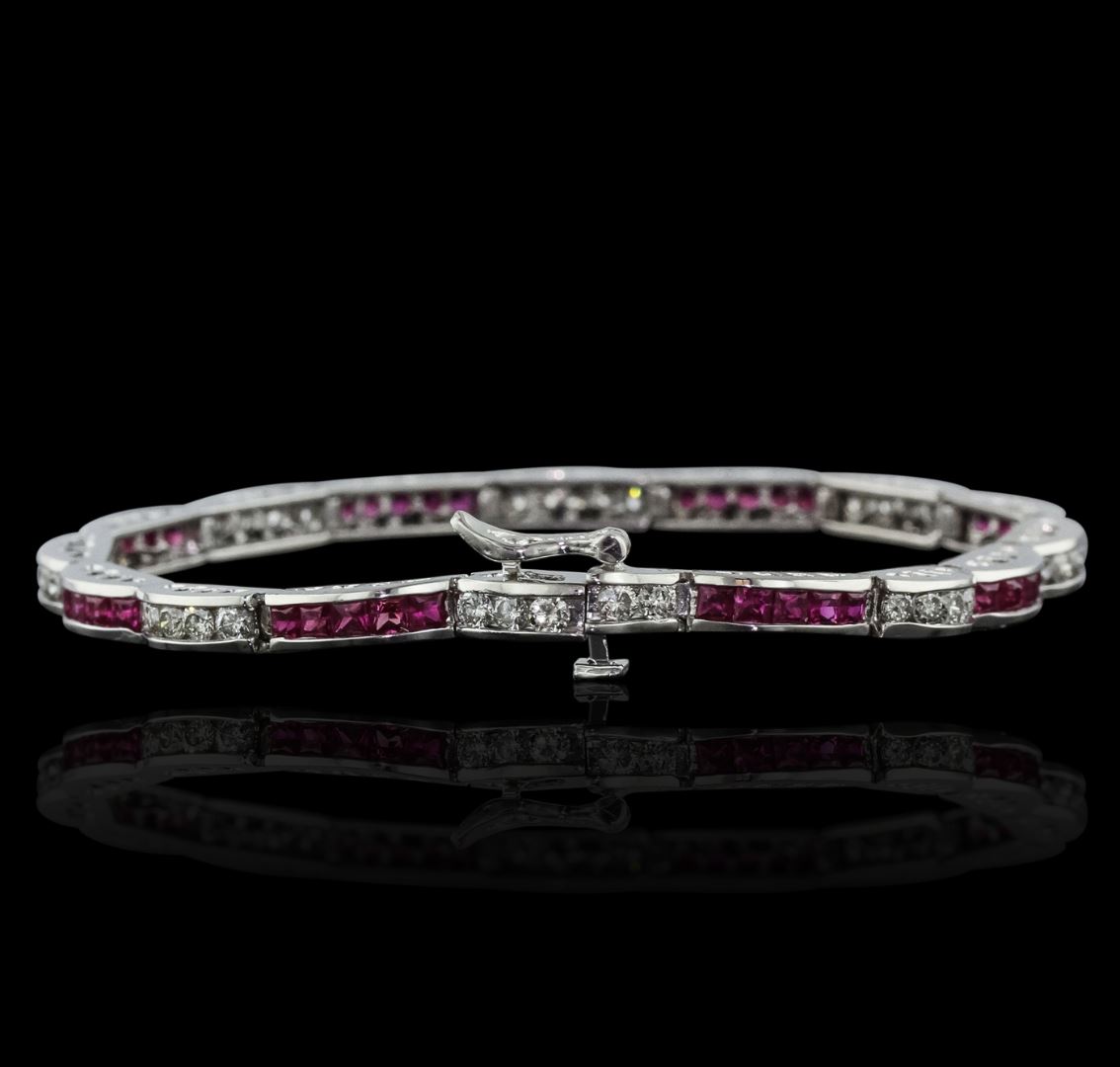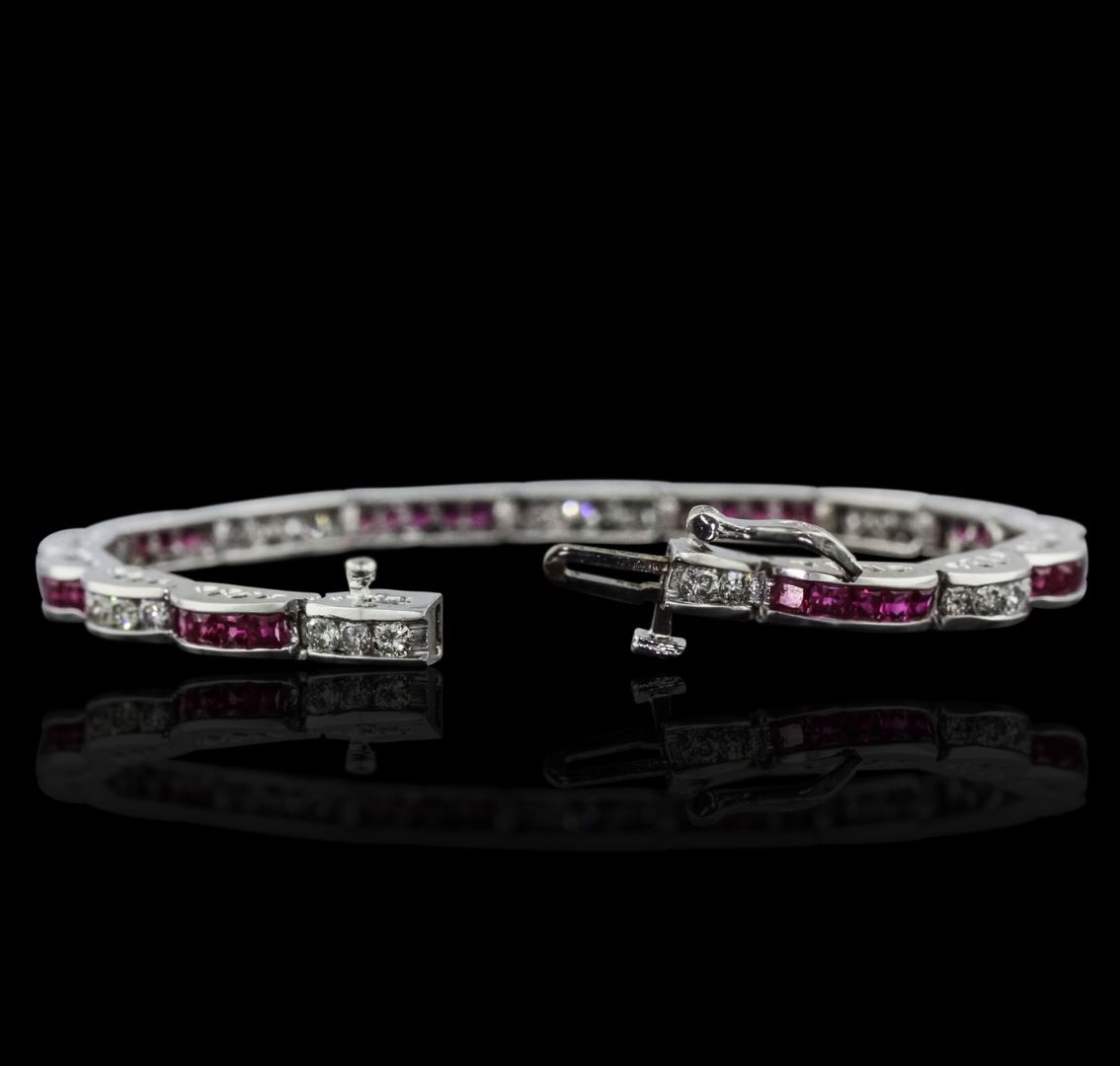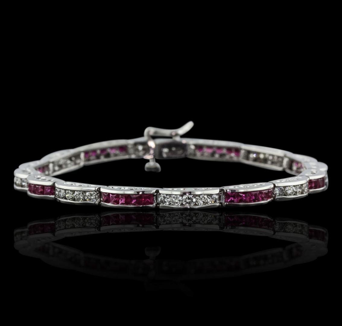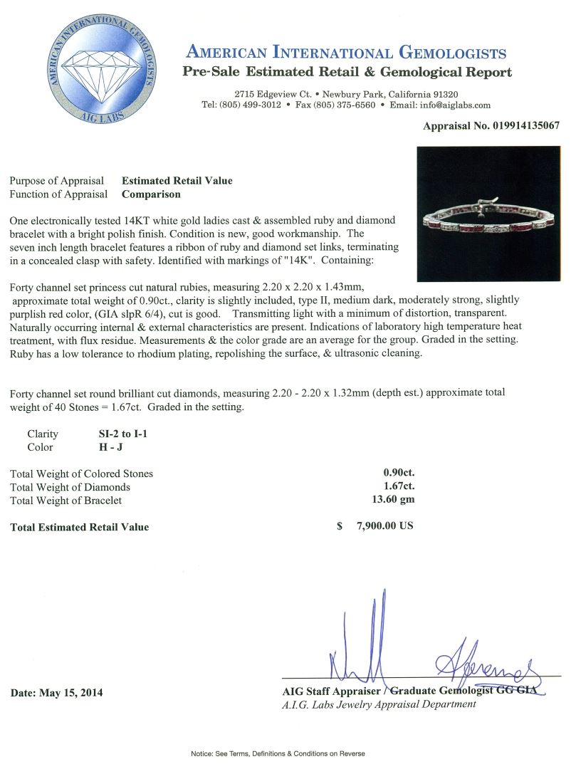 One electronically tested 14KT white gold ladies cast & assembled ruby and diamond bracelet with a bright polish finish. Condition is new, good workmanship. The seven inch length bracelet features a ribbon of ruby and diamond set links, terminating in a concealed clasp with safety. Identified with markings of "14K". Containing: Forty channel set princess cut natural rubies, measuring 2.20 x 2.20 x 1.43mm, approximate. Total Weight of 0.90ct., clarity is slightly included, type II, medium dark, moderately strong, slightly purplish red color, (GIA slpR 6/4), cut is good. Transmitting light with a minimum of distortion, transparent. Naturally occurring internal & external characteristics are present. Indications of laboratory high temperature heat treatment, with flux residue. Measurements & the color grade are an average for the group. Graded in the setting. Ruby has a low tolerance to rhodium plating, repolishing the surface, & ultrasonic cleaning. Forty channel set round brilliant cut diamonds, measuring 2.20 - 2.20 x 1.32mm (depth est.) approximate. Total Weight of 40 Stones = 1.67ct. Graded in the setting. Clarity: SI-2 to I-1. Color: H - J. Total Weight of Colored Stones 0.90ct. Total Weight of Diamonds 1.67ct. Total Weight of Bracelet 13.60 grams. AIG Appraised at $7,900.00.