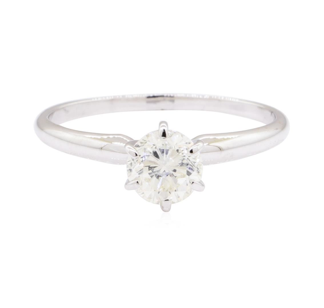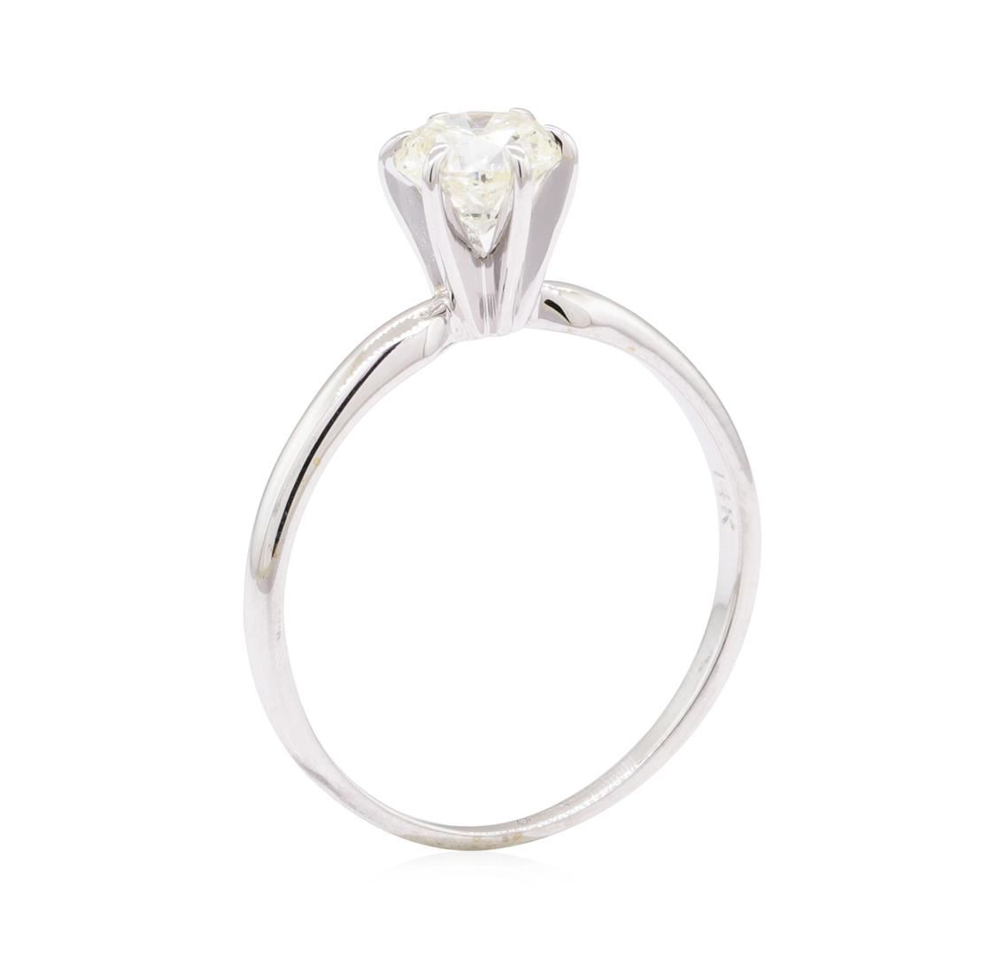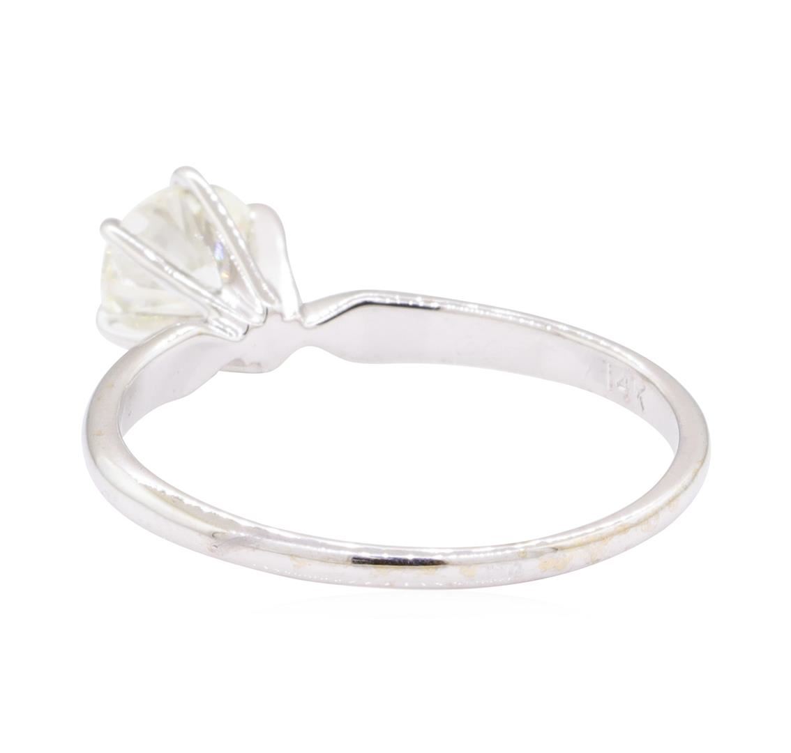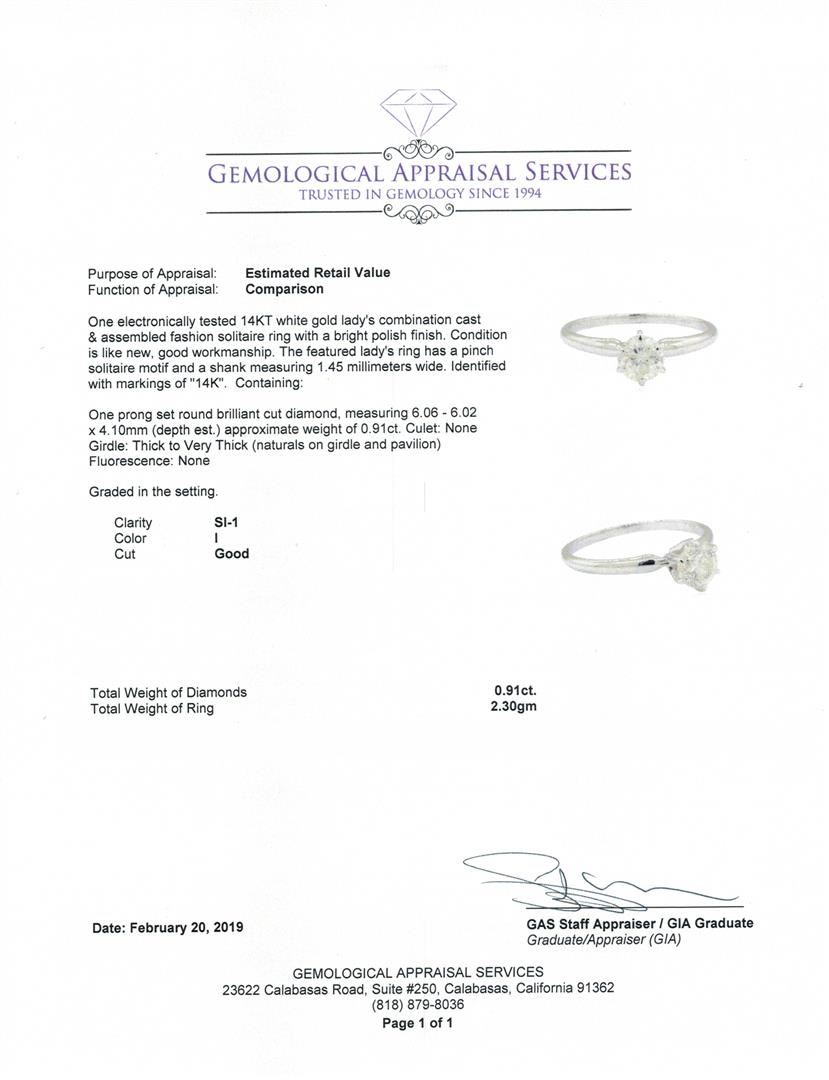 One electronically tested 14KT white gold lady's combination cast & assembled fashion solitaire ring with a bright polish finish. The featured lady's ring has a pinch solitaire motif and a shank measuring 1.45 millimeters wide. Identified with markings of '14K'. Condition is like new, good workmanship. Containing: One prong set round brilliant cut diamond, measuring 6.06 - 6.02 x 4.10mm (depth est.) approximate weight of 0.91ct. Culet: NoneGirdle: Thick to Very Thick (naturals on girdle and pavilion)Fluorescence: NoneGraded in the setting. Color I, Clarity SI-1, Cut Good. Total Weight of Diamonds 0.91ct. Total Weight of Ring 2.30gm. GAS Appraised.