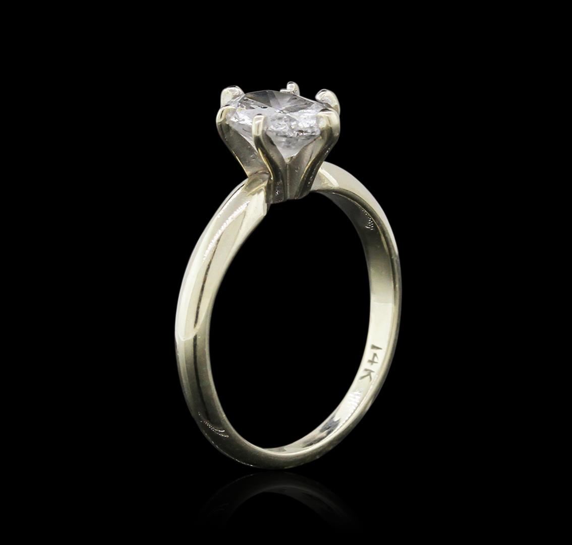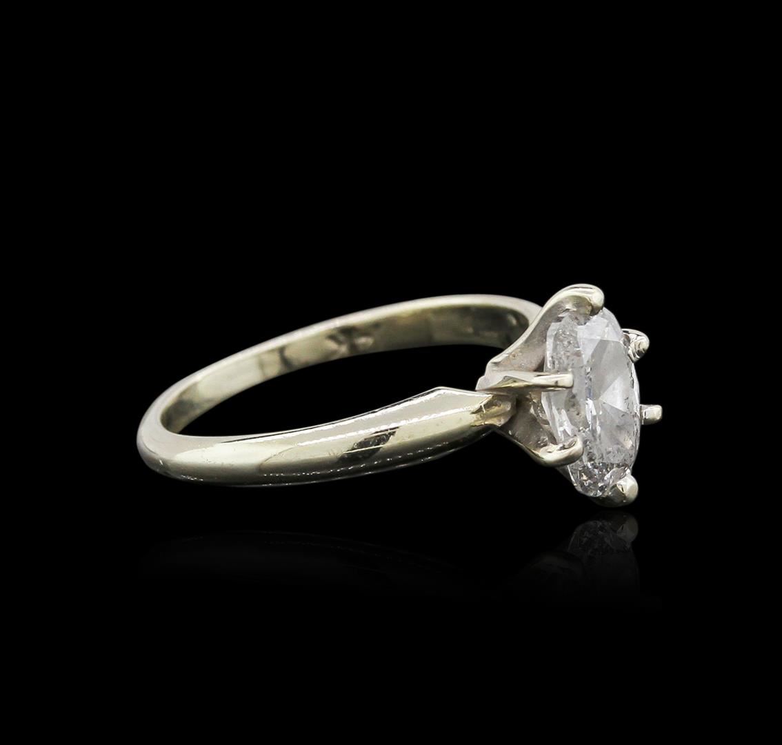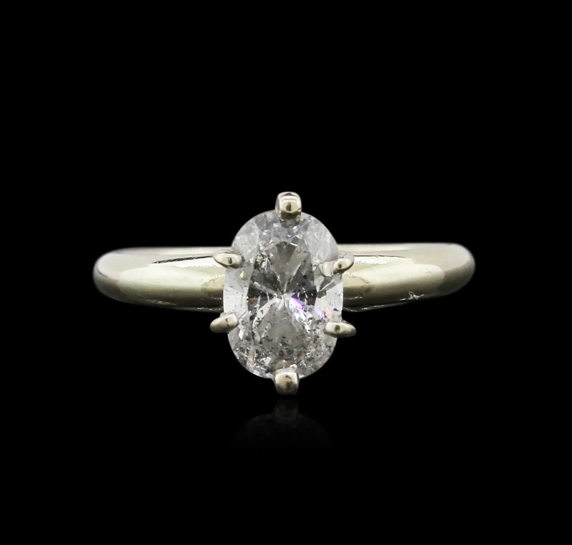 One electronically tested 14KT white gold ladies cast diamond solitaire ring with a bright polish finish. Identified with markings of "14K". Condition is good. Containing: One prong set oval shaped cut diamond, measuring 7.50 x 5.50 x 3.47mm (depth est.) approximate weight of 0.91ct. Clarity: I-3. Color: G, Cut is Good. All diamonds are graded in the mounting, unless otherwise stated. Total Weight of Diamonds 0.91ct. Total Weight of Solitaire Ring 2.20 grams. GGL Appraised at $2,285.00.