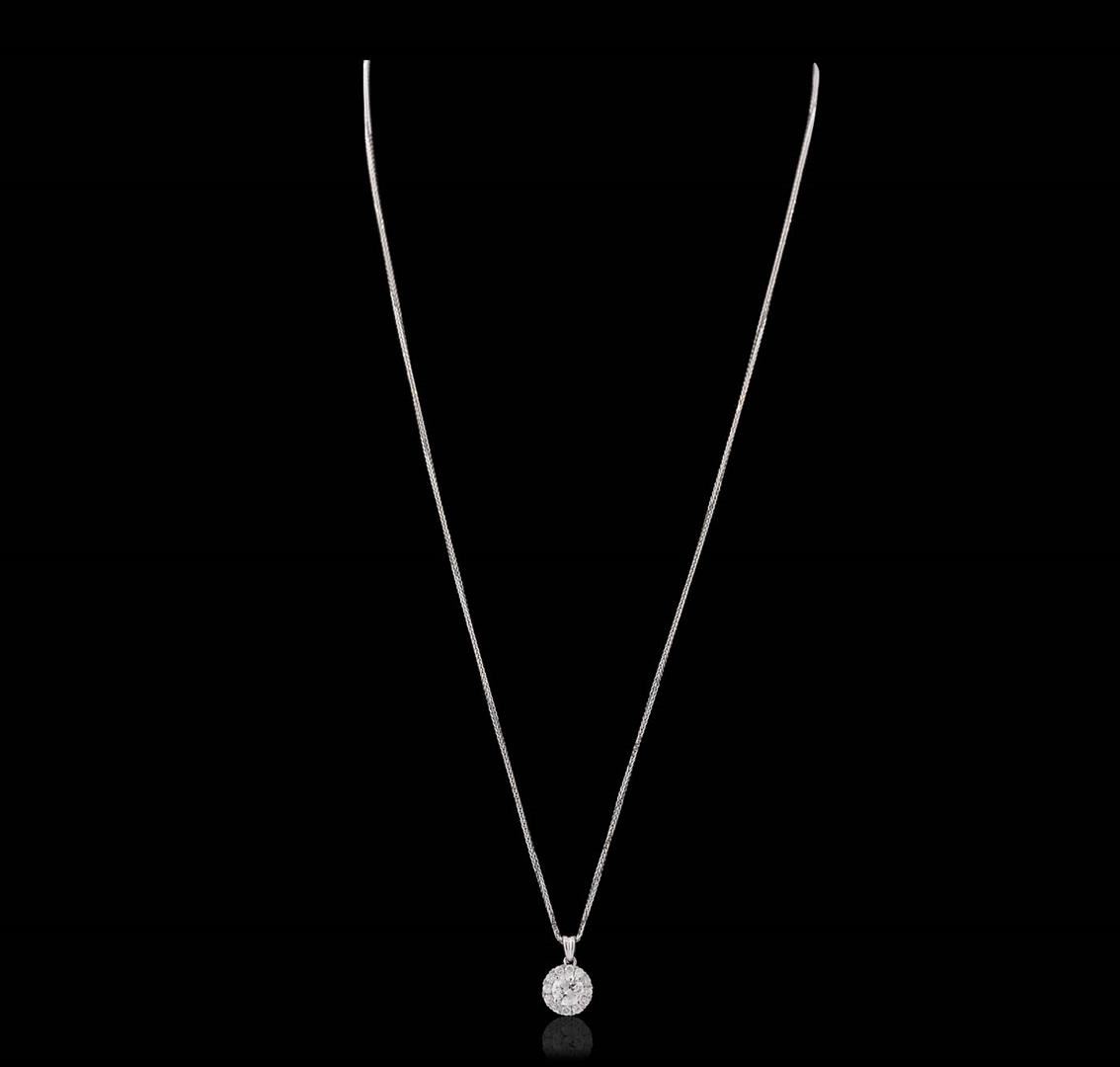 One electronically tested 14KT white gold ladies combination cast & assembled diamond pendant & chain 18.0" long, medium fancy cable with a lobster claw clasp with a bright polish finish. Identified with markings of "14K". Condition is new. Containing: One prong set round brilliant cut diamond, measuring 5.68 - 5.67 x 3.40mm (depth est.) approximate weight of 0.67ct. Clarity: I-2. Color: G, Cut is Good. Twelve prong set round brilliant cut diamonds, measuring 1.80 - 1.80 x 1.08mm (depth est.) approximate total weight of 12 Stones = 0.26ct. Clarity: SI-2 to I-2. Color: H - I, Cut is Good. All diamonds are graded in the mounting, unless otherwise stated. Total Weight of Diamonds 0.92ct. Total Weight of Pendant & Chain 2.60 grams. GGL Appraised at $5,930.00. AIG Appraised at $12,450.00. GGL Appraised at $5,930.00.