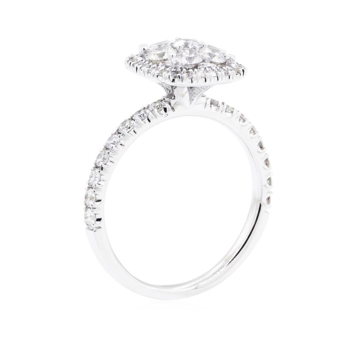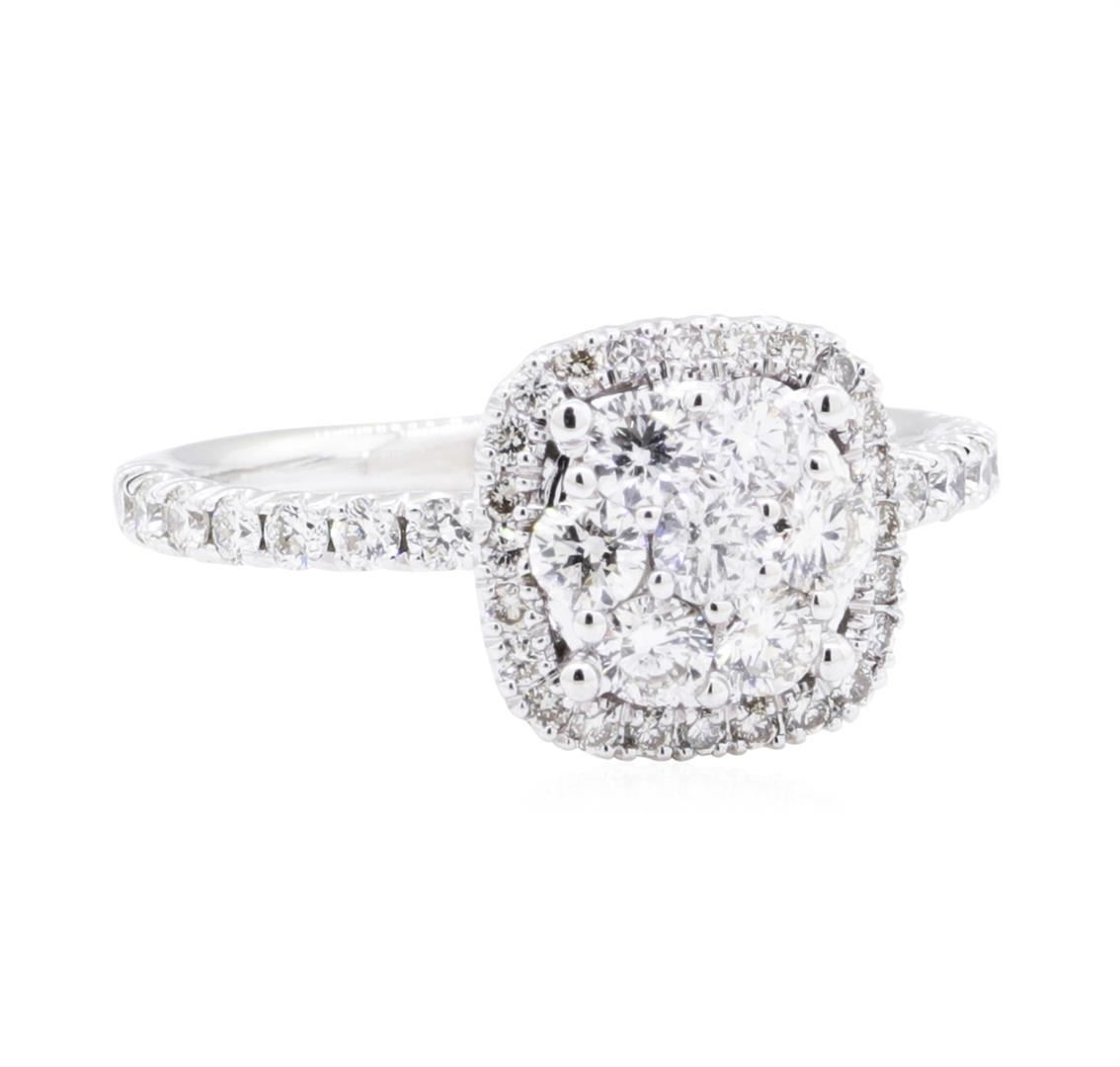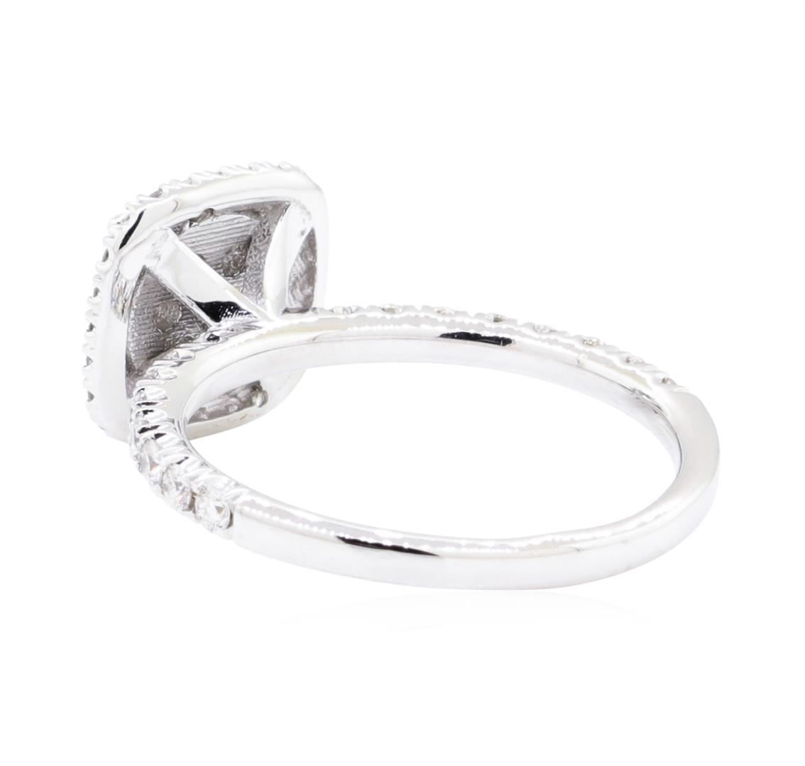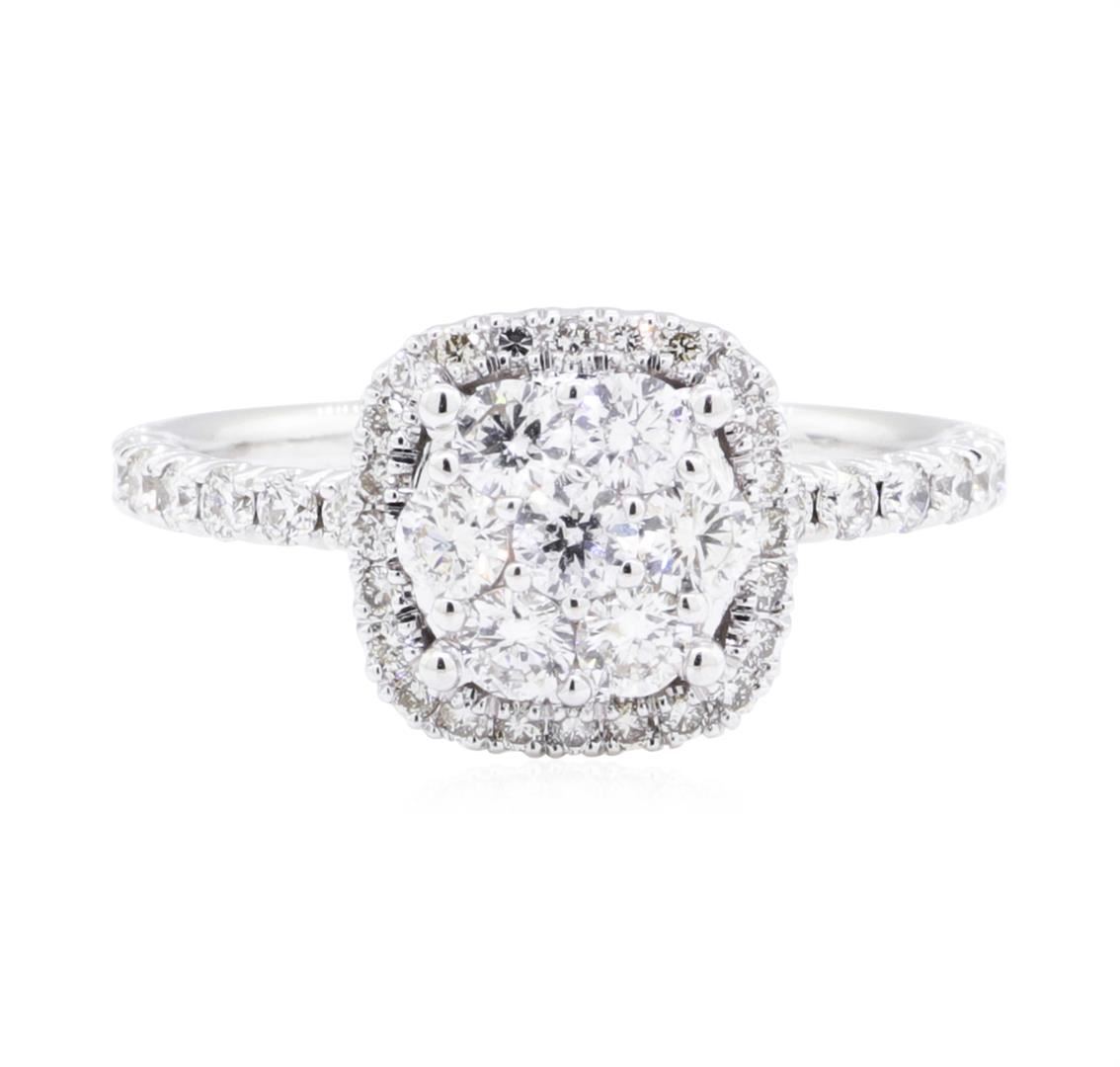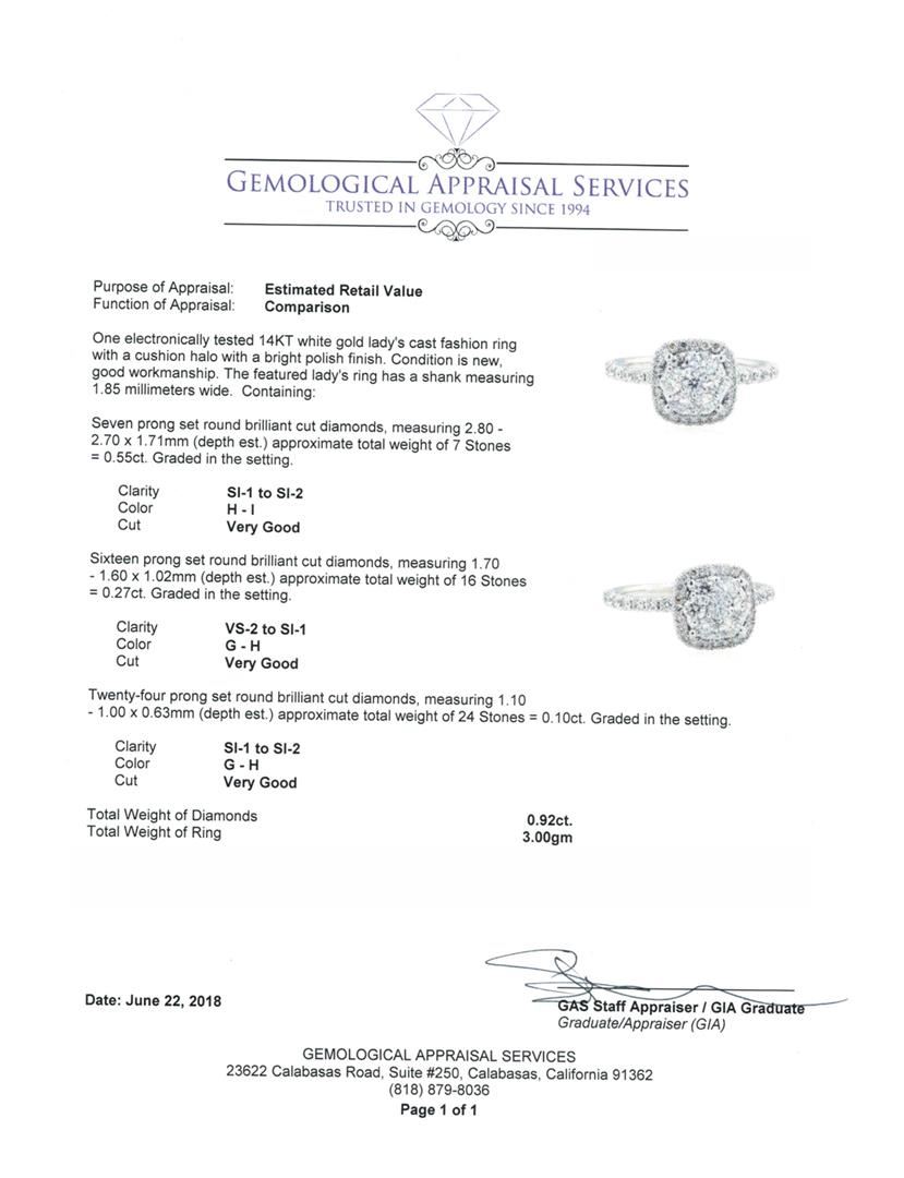 One electronically tested 14KT white gold lady's cast fashion ring with a cushion halo with a bright polish finish. The featured lady's ring has a shank measuring 1.85 millimeters wide. Condition is new, good workmanship. Containing: Seven prong set round brilliant cut diamonds, measuring 2.80 - 2.70 x 1.71mm (depth est.) approximate total weight of 7 Stones = 0.55ct. Graded in the setting. Color H - I Clarity SI-1 to SI-2 Cut Very Good Sixteen prong set round brilliant cut diamonds, measuring 1.70 - 1.60 x 1.02mm (depth est.) approximate total weight of 16 Stones = 0.27ct. Graded in the setting. Color G - H Clarity VS-2 to SI-1 Cut Very Good Twenty-Four prong set round brilliant cut diamonds, measuring 1.10 - 1.00 x 0.63mm (depth est.) approximate total weight of 24 Stones = 0.10ct. Graded in the setting. Color G - H Clarity SI-1 to SI-2 Cut Very Good. Total Weight of Diamonds 0.92ct. Total Weight of Ring 3.00gm. GAS Appraised.