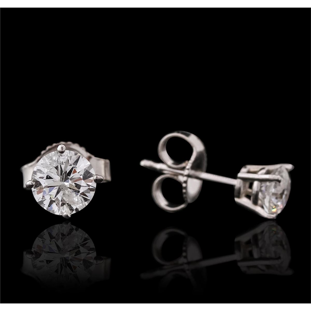 One pair electronically tested 14KT white gold cast & assembled diamond solitaire earrings with standard backs. Identified with markings of "14K". Condition is new, good workmanship. Containing: One prong set round brilliant cut diamond, measuring 4.90 - 4.80 x 3.08mm (depth est.), 3.00% GTCF approximate weight of 0.45ct. Graded in the setting. Clarity: I-2. Color: I. Depth 63.5%. Table 77.3%. One prong set round brilliant cut diamond, measuring 5.15 - 5.10 x 2.90mm (depth est.) approximate weight of 0.47ct. Graded in the setting. Clarity: I-2. Color: I. Depth 56.5%. Table 58.5%. Total Weight of Diamonds 0.92ct. Total Weight of Earrings 0.94 grams. AIG Appraised at $2,400.00.