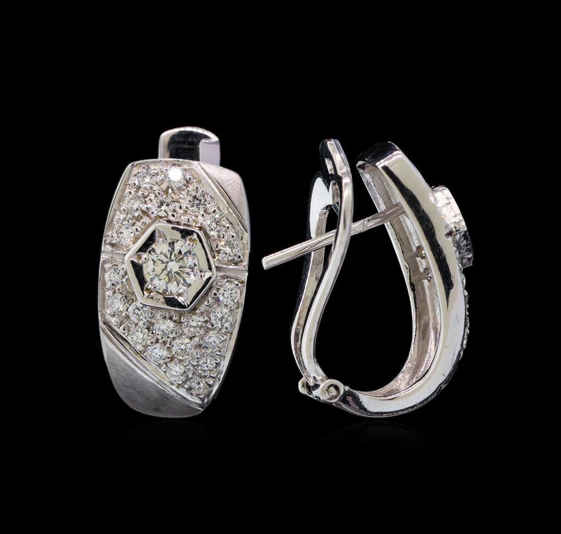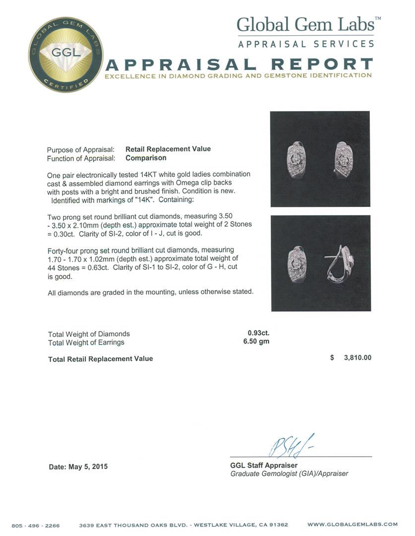 One pair electronically tested 14KT white gold ladies combination cast & assembled diamond earrings with Omega clip backs with posts with a bright and brushed finish. Identified with markings of "14K". Condition is new. Containing: Two prong set round brilliant cut diamonds, measuring 3.50 - 3.50 x 2.10mm (depth est.) approximate total weight of 2 Stones = 0.30ct. Clarity: SI-2. Color: I - J, Cut is Good. Forty-Four prong set round brilliant cut diamonds, measuring 1.70 - 1.70 x 1.02mm (depth est.) approximate total weight of 44 Stones = 0.63ct. Clarity: SI-1 to SI-2. Color: G - H, Cut is Good. All diamonds are graded in the mounting, unless otherwise stated. Total Weight of Diamonds 0.93ct. Total Weight of Earrings 6.50 grams. GGL Appraised at $3,810.00.
