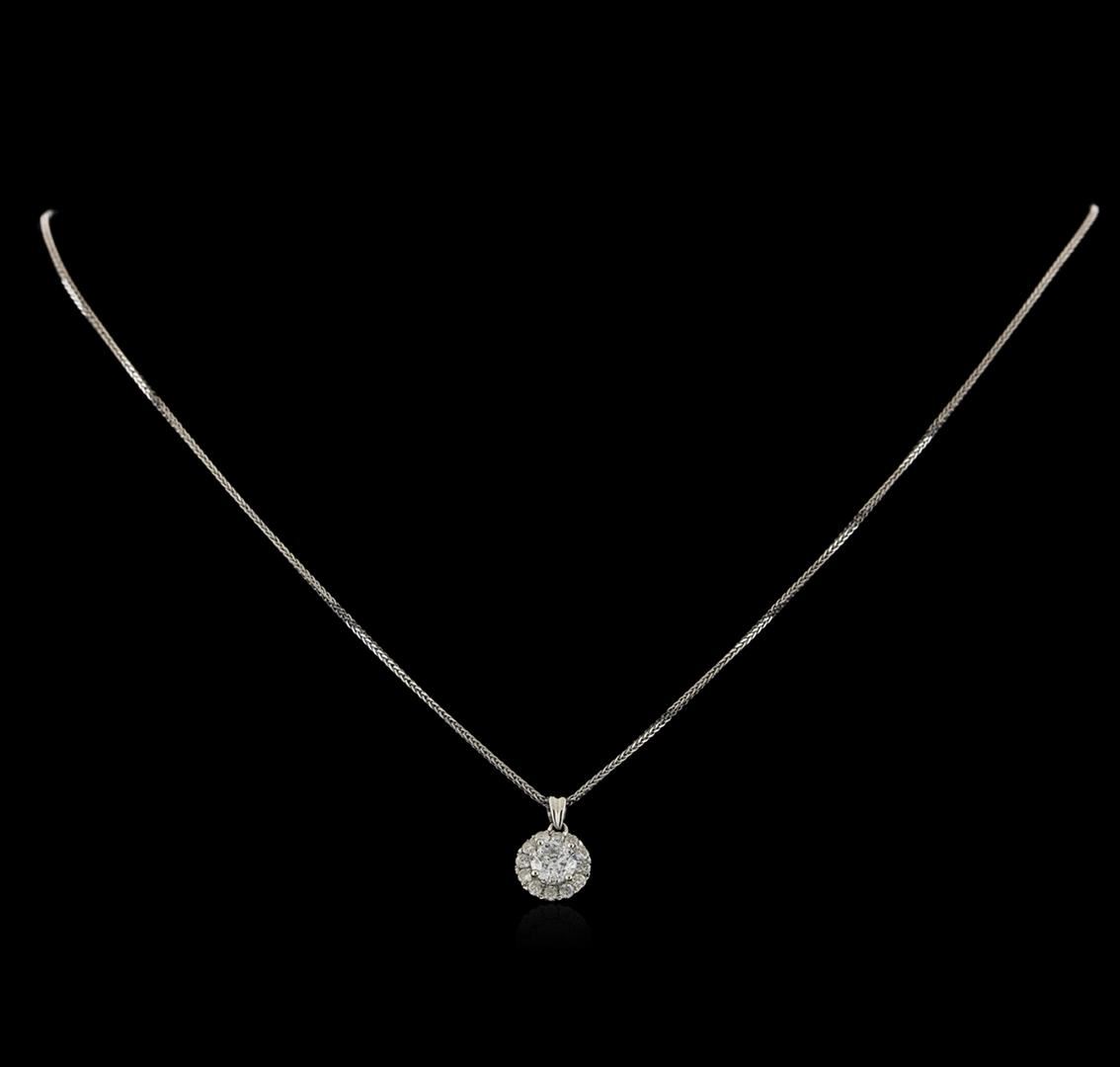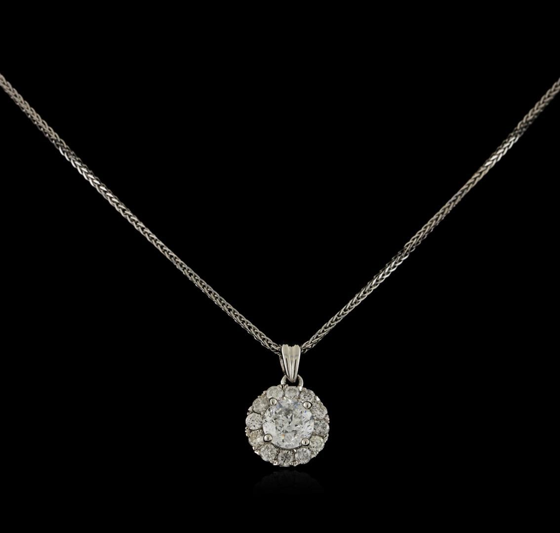 One electronically tested 14KT white gold ladies combination cast & assembled diamond pendant & chain 18.0" long, medium fancy cable with a lobster claw clasp with a bright polish finish. Identified with markings of "14K". Condition is new. Containing: One prong set round brilliant cut diamond, measuring 5.53 - 5.52 x 3.60mm (depth est.) approximate weight of 0.67ct. Clarity: I-3. Color: G, Cut is Good. Twelve prong set round brilliant cut diamonds, measuring 1.80 - 1.80 x 1.08mm (depth est.) approximate total weight of 12 Stones = 0.26ct. Clarity: SI-2 to I-2. Color: H - J, Cut is Good. All diamonds are graded in the mounting, unless otherwise stated. Total Weight of Diamonds 0.93ct. Total Weight of Pendant & Chain 2.70 grams. GGL Appraised at $3,345.00.