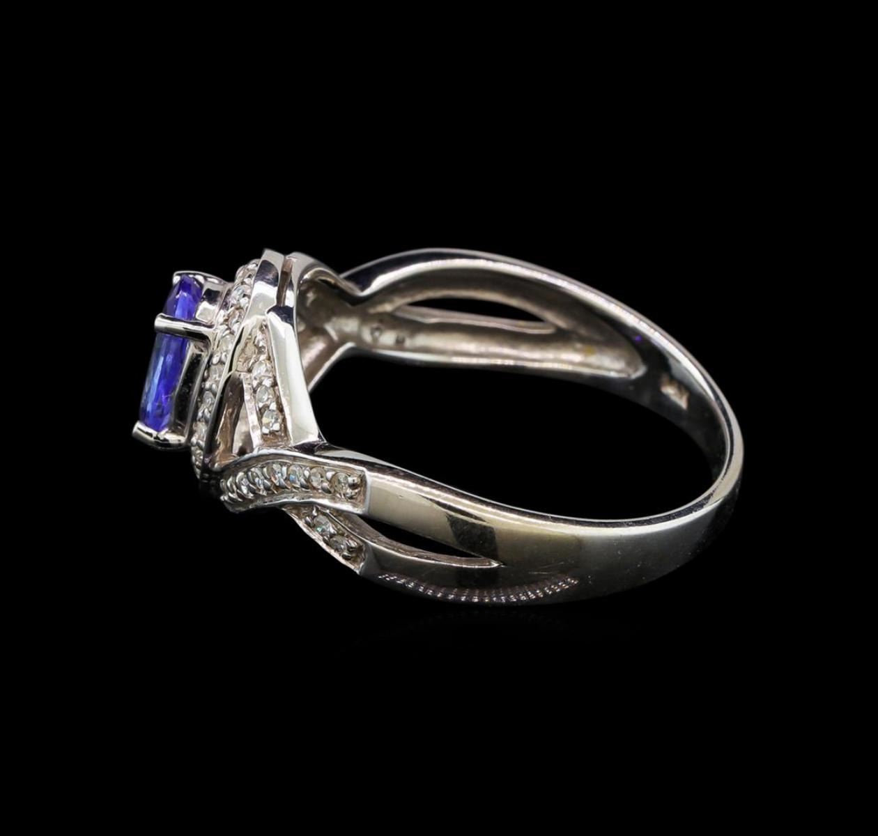 One electronically tested 14KT white gold ladies cast tanzanite and diamond ring with a bright polish finish. The featured tanzanite is set within a diamond bezel supported by intertwining diamond set shoulders, completed by a two and one-half millimeter wide band. Identified with markings of "14K". Condition is new, good workmanship. Containing: One prong set oval mixed cut natural tanzanite, measuring 7.25 x 5.25 x 3.35mm, 6%. bulge factor, approximate weight of 0.93ct., clarity is eye clean, type I, medium dark, very slightly grayish, bluish violet color, (GIA bV 6/3), cut is good. Transmitting light with no distortion, transparent. Graded in the setting. Tanzanite is a very rare gemstone that is only found in the country of Tanzania. Originally discovered in 1967. Tiffany & Company, named the stone Tanzanite. It is found in the Usumburu Mountains that border the Umba Valley of northern Tanzania. Tanzanite occurs in gray, brown, violet, blue, reddish-purple, & green. The gem is interesting because of its exceptional pleochroism. Rotated in different directions a tanzanite will exhibit multiple changes of color. Tanzanite has a low tolerance to ultrasonic cleaning, and should not be cleaned using this method. Forty-Six prong set single cut diamonds, measuring 1.10 - 1.00 x 0.63mm (depth est.) approximate total weight of 46 Stones = 0.24ct. Graded in the setting. Clarity: I-1 to I-2. Color: G - I. Total Weight of Colored Stones 0.93ct. Total Weight of Diamonds 0.24ct. Total Weight of Ring 3.76 grams. AIG Appraised.