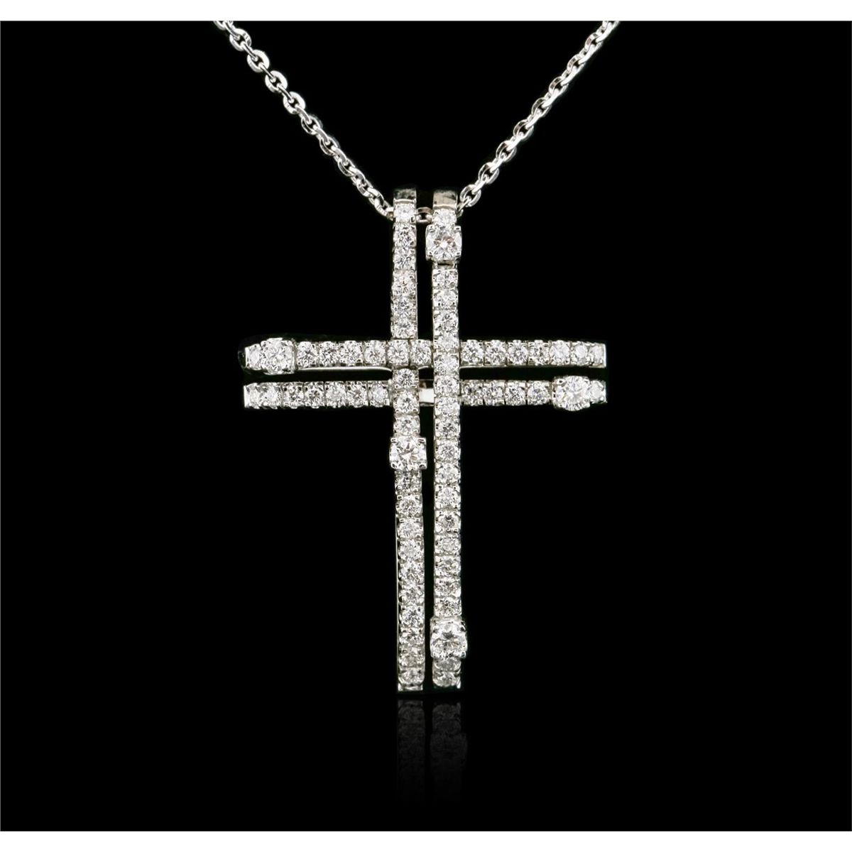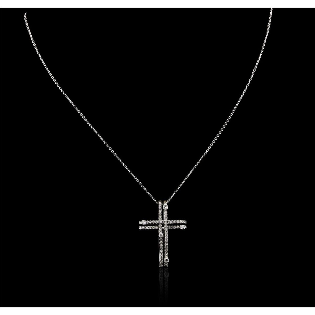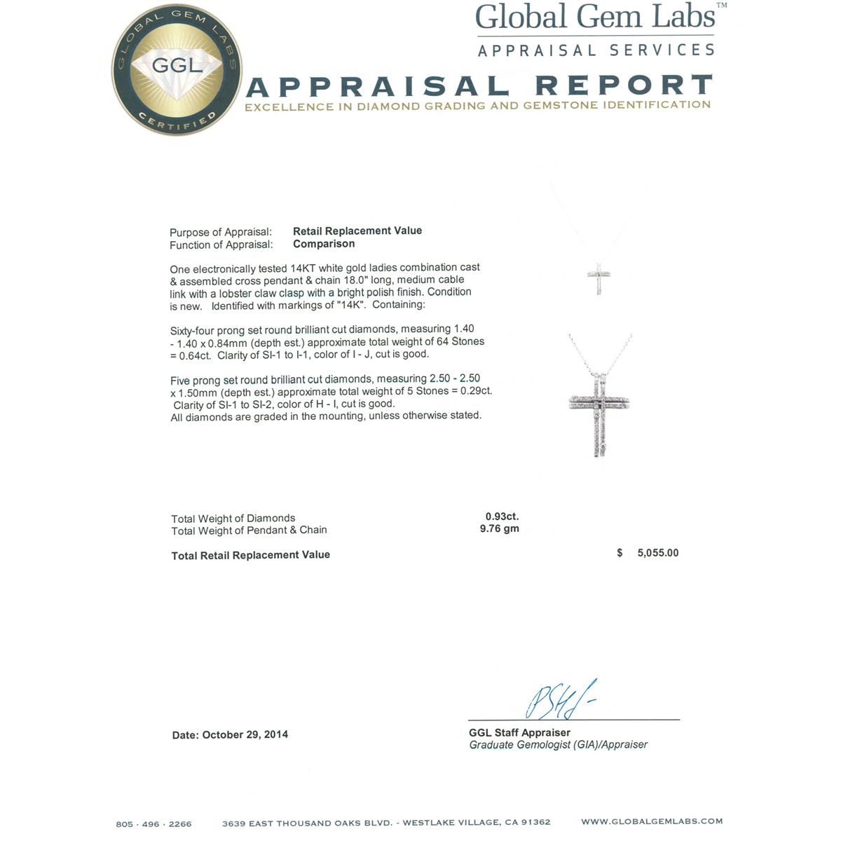 One electronically tested 14KT white gold ladies combination cast & assembled cross pendant & chain 18.0 long, medium cable link with a lobster claw clasp with a bright polish finish. Identified with markings of 14K. Condition is new. Containing: Sixty-Four prong set round brilliant cut diamonds, measuring 1.40 - 1.40 x 0.84mm (depth est.) approximate total weight of 64 Stones = 0.64ct. Clarity: SI-1 to I-1. Color: I - J, Cut is Good. Five prong set round brilliant cut diamonds, measuring 2.50 - 2.50 x 1.50mm (depth est.) approximate total weight of 5 Stones = 0.29ct. Clarity: SI-1 to SI-2. Color: H - I, Cut is Good. All diamonds are graded in the mounting, unless otherwise stated. Total Weight of Diamonds 0.93ct. Total Weight of Pendant & Chain 9.76 grams. GGL Appraised at $5,055.00.