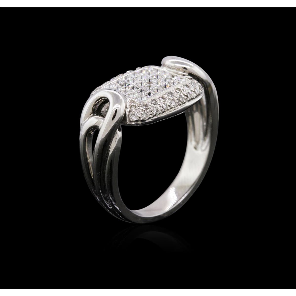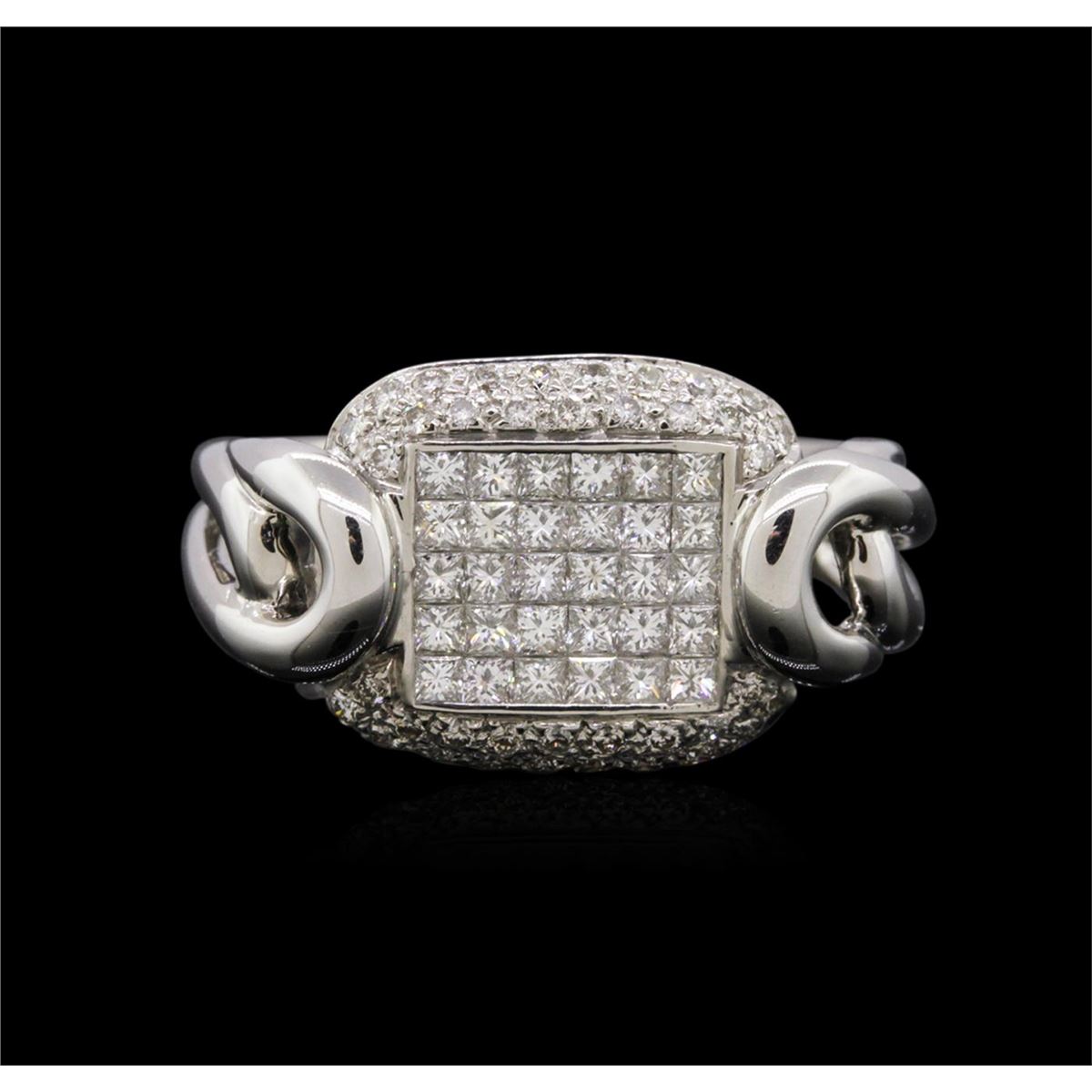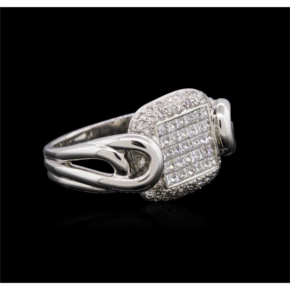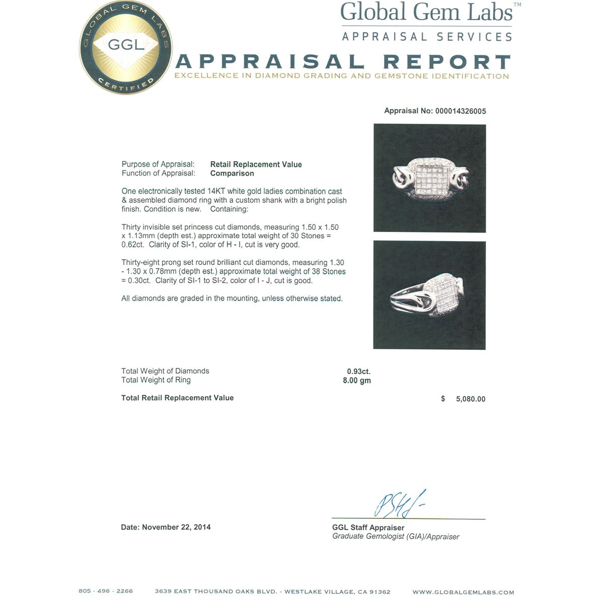 One electronically tested 14KT white gold ladies combination cast & assembled diamond ring with a custom shank with a bright polish finish. Condition is new. Containing: Thirty invisible set princess cut diamonds, measuring 1.50 x 1.50 x 1.13mm (depth est.) approximate total weight of 30 Stones = 0.62ct. Clarity: SI-1. Color: H - I, Cut is Very Good. Thirty-Eight prong set round brilliant cut diamonds, measuring 1.30 - 1.30 x 0.78mm (depth est.) approximate total weight of 38 Stones = 0.30ct. Clarity: SI-1 to SI-2. Color: I - J, Cut is Good. All diamonds are graded in the mounting, unless otherwise stated. Total Weight of Diamonds 0.93ct. Total Weight of Ring 8.00 grams. GGL Appraised at $5,080.00.