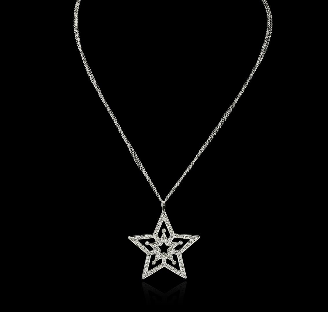 One electronically tested 14KT white gold ladies cast diamond star pendant & chain 16.0" long, with a lobster claw clasp with a bright polish finish. Identified with markings of "14K". Condition is new. Containing: Seventy-Six prong set round brilliant cut diamonds, measuring 1.50 - 1.50 x 0.90mm (depth est.) approximate total weight of 76 Stones = 0.94ct. Clarity: SI-1 to I-1. Color: I - J, Cut is Good. All diamonds are graded in the mounting, unless otherwise stated. Total Weight of Diamonds 0.94ct. Total Weight of Pendant & Chain 13.70 grams. GGL Appraised at $4,370.00.