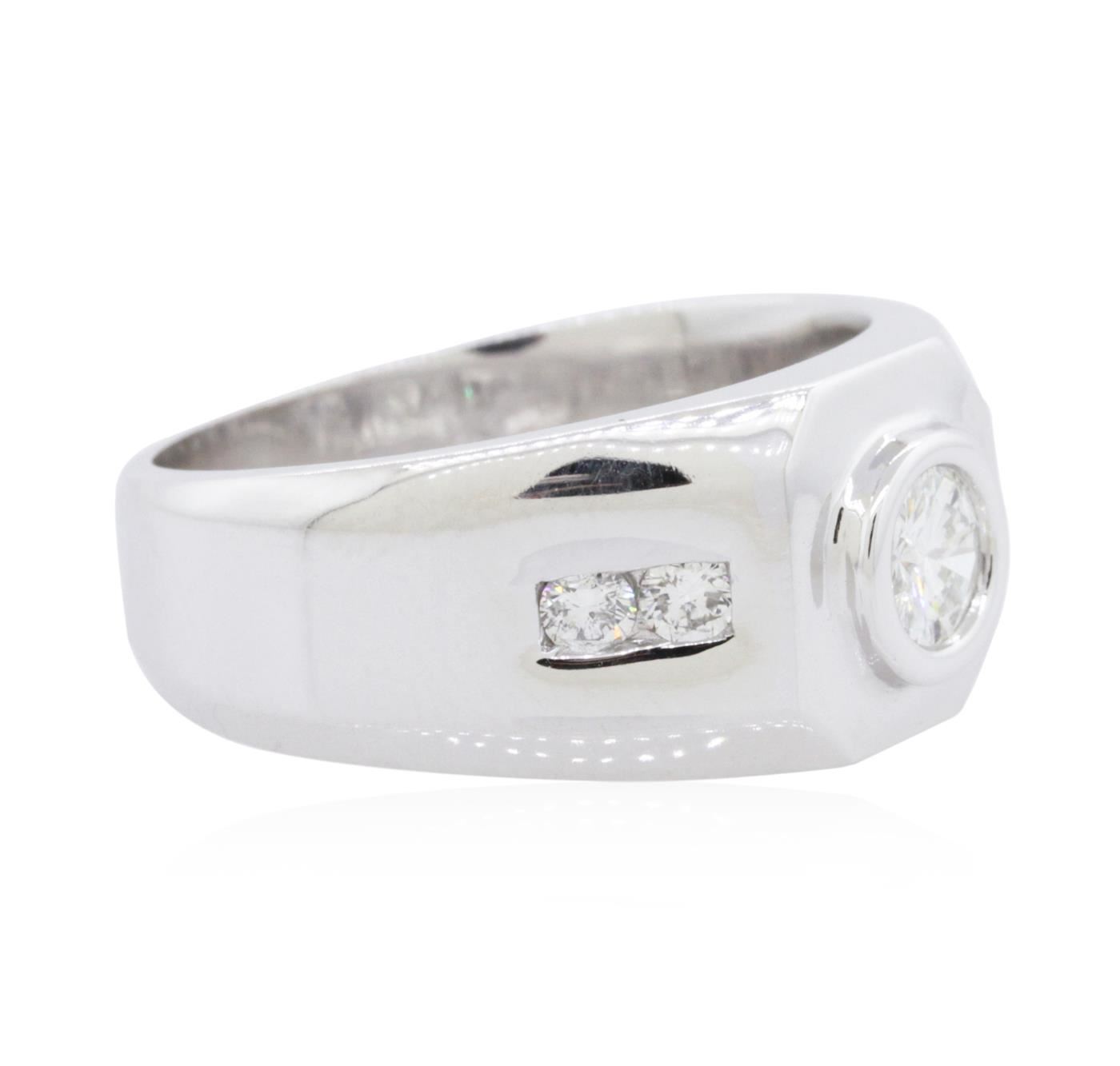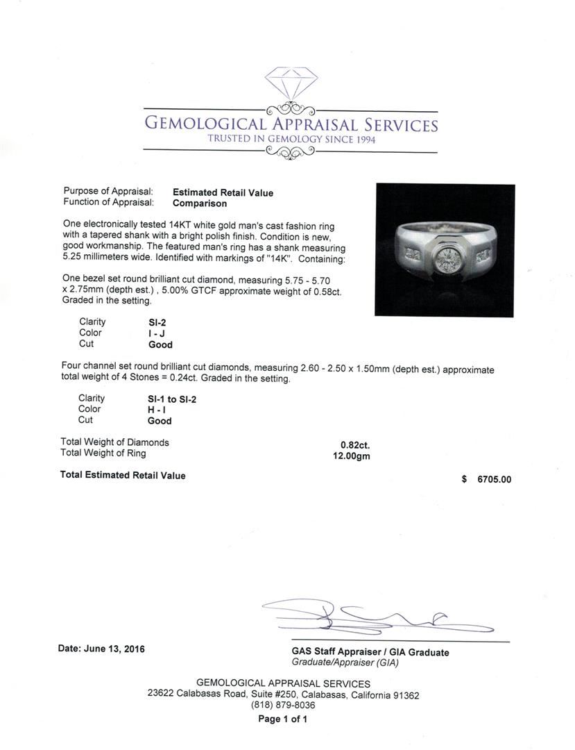 One electronically tested 14KT white gold mens combination cast & assembled diamond ring with a bright polish finish. Identified with markings of "K14". Condition is new. Containing: One bezel set round brilliant cut diamond, measuring 5.80 - 5.80 x 3.48mm (depth est.) approximate weight of 0.71ct. Clarity: SI-2. Color: J, Cut is Good. Four channel set round brilliant cut diamonds, measuring 2.50 - 2.50 x 1.50mm (depth est.) approximate total weight of 4 Stones = 0.23ct. Clarity: SI-1 to SI-2. Color: J, Cut is Good. All diamonds are graded in the mounting, unless otherwise stated. Total Weight of Diamonds 0.94ct. Total Weight of Ring 11.90 grams. GGL Appraised at $8,165.00.
