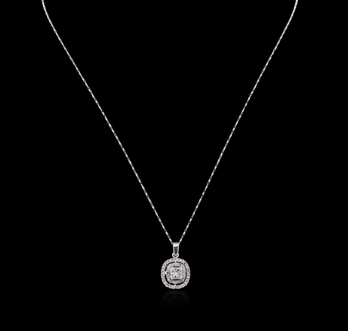 One electronically tested 14KT white gold ladies cast diamond pendant & chain 18.0" long, with a lobster claw clasp with a bright polish finish. Identified with markings of "14K". Condition is new. Containing: One prong set princess cut diamond, measuring 4.80 x 4.80 x 3.60mm (depth est.) approximate weight of 0.70ct. Clarity: I-2. Color: J, Cut is Good. Forty-Four prong set round brilliant cut diamonds, measuring 1.20 - 1.20 x 0.72mm (depth est.) approximate total weight of 44 Stones = 0.25ct. Clarity: I-1 to I-2. Color: I - J, Cut is Good. Diamonds are graded in the mounting, unless otherwise stated. Total Weight of Diamonds 0.95ct. Total Weight of Pendant & Chain 5.30 grams. GGL Appraised.