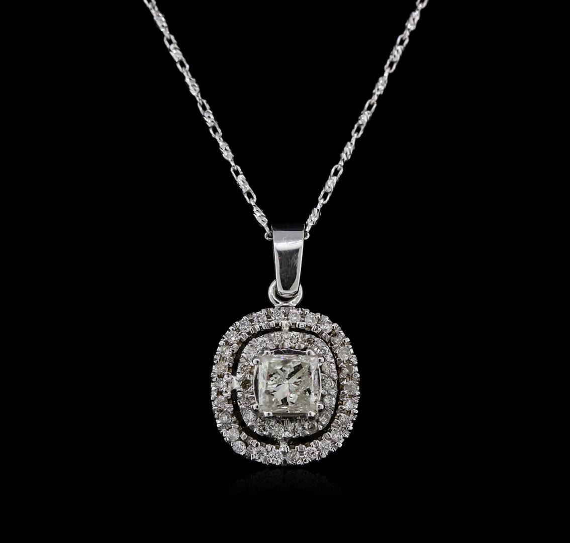 One electronically tested 14KT white gold ladies cast diamond pendant & chain 18.0" long, with a lobster claw clasp with a bright polish finish. Identified with markings of "14K". Condition is new. Containing: One prong set princess cut diamond, measuring 4.80 x 4.80 x 3.60mm (depth est.) approximate weight of 0.70 ct. Clarity: I-2. Color: J, Cut is Good. Forty-Four prong set round brilliant cut diamonds, measuring 1.20 - 1.20 x 0.72mm (depth est.) approximate total weight of 44 Stones = 0.25ct. Clarity: I-1 to I-2. Color: I - J, Cut is Good. Diamonds are graded in the mounting, unless otherwise stated. Total Weight of Diamonds 0.95ct. Total Weight of Pendant & Chain 5.30 grams. GGL Appraised.