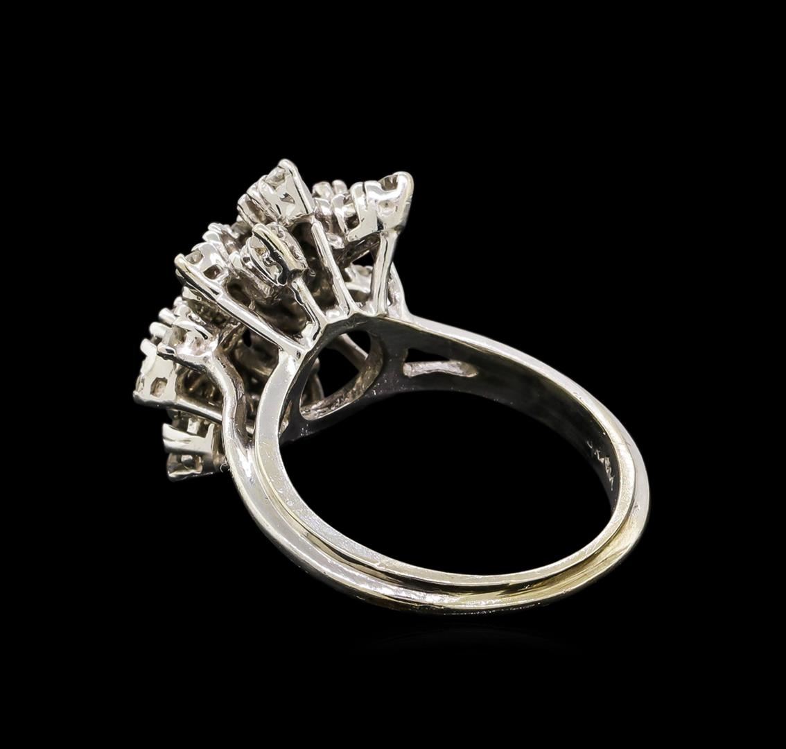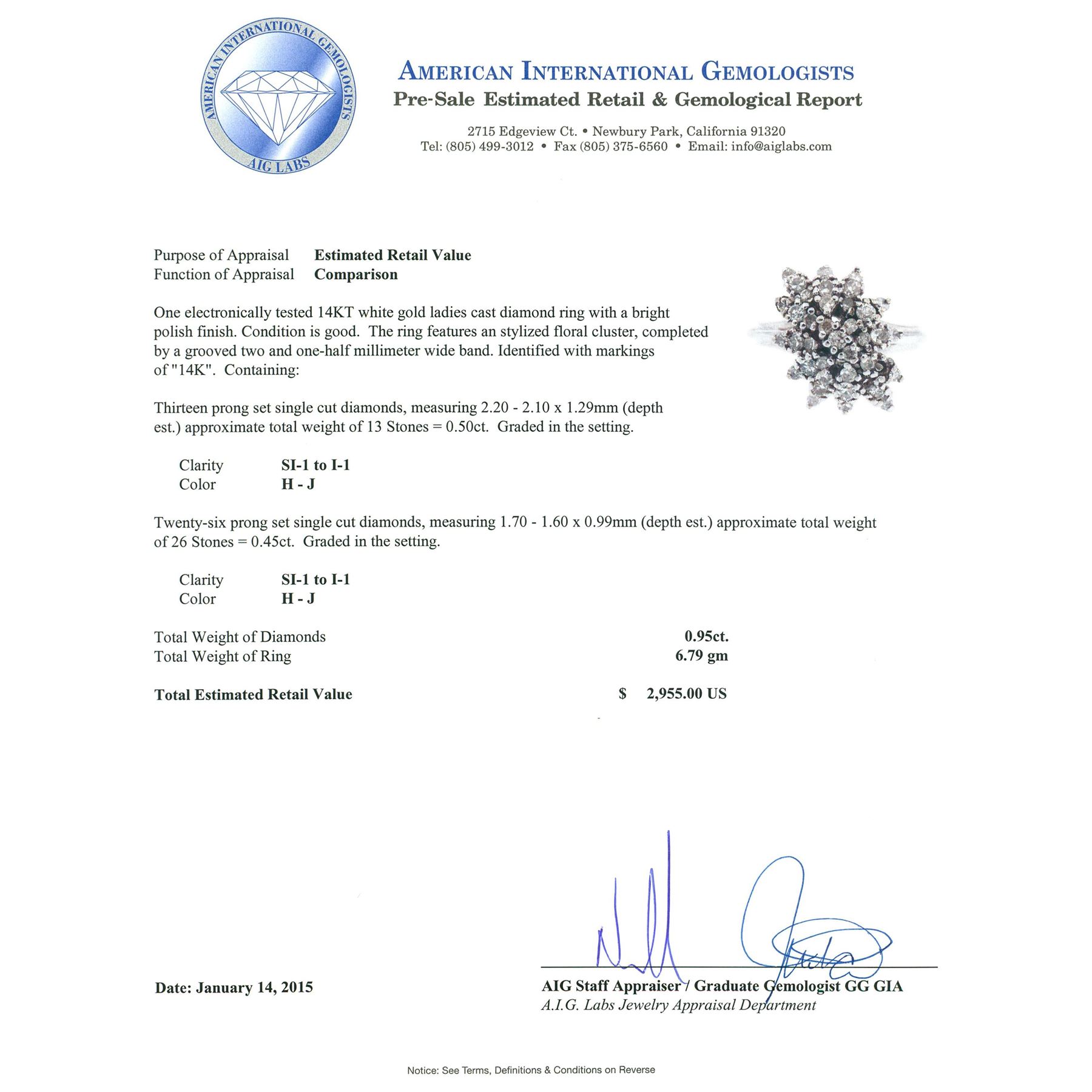One electronically tested 14KT white gold ladies cast diamond ring with a bright polish finish. The ring features an stylized floral cluster, completed by a grooved two and one-half millimeter wide band. Identified with markings of "14K". Condition is good. Containing: Thirteen prong set single cut diamonds, measuring 2.20 - 2.10 x 1.29mm (depth est.) approximate total weight of 13 Stones = 0.50 ct. Graded in the setting. Clarity: SI-1 to I-1. Color: H - J Twenty-Six prong set single cut diamonds, measuring 1.70 - 1.60 x 0.99mm (depth est.) approximate total weight of 26 Stones = 0.45ct. Graded in the setting. Clarity: SI-1 to I-1. Color: H - J. Total Weight of Diamonds 0.95ct. Total Weight of Ring 6.79 grams. AIG Appraised.