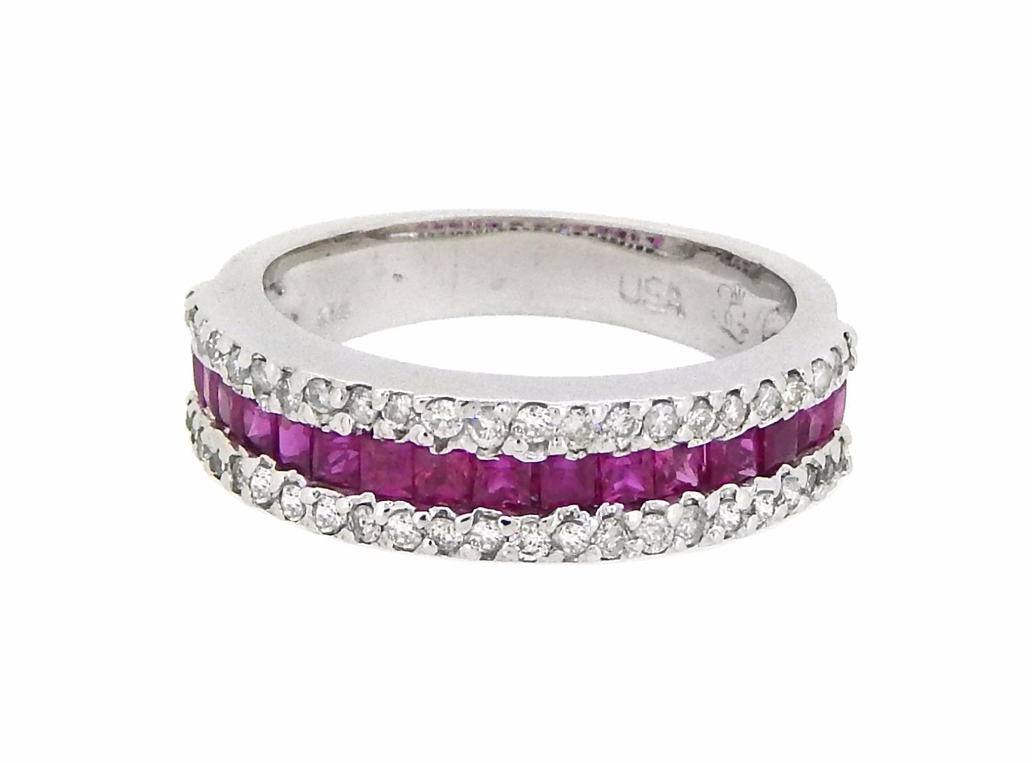 One 14KT White Gold 0.95ctw Ruby and Diamond Ring. (16) Rubies with a total weight of 0.95cts. (44) Diamonds with a total weight of 0.44cts. Total weight of this ring is 4.1 grams.