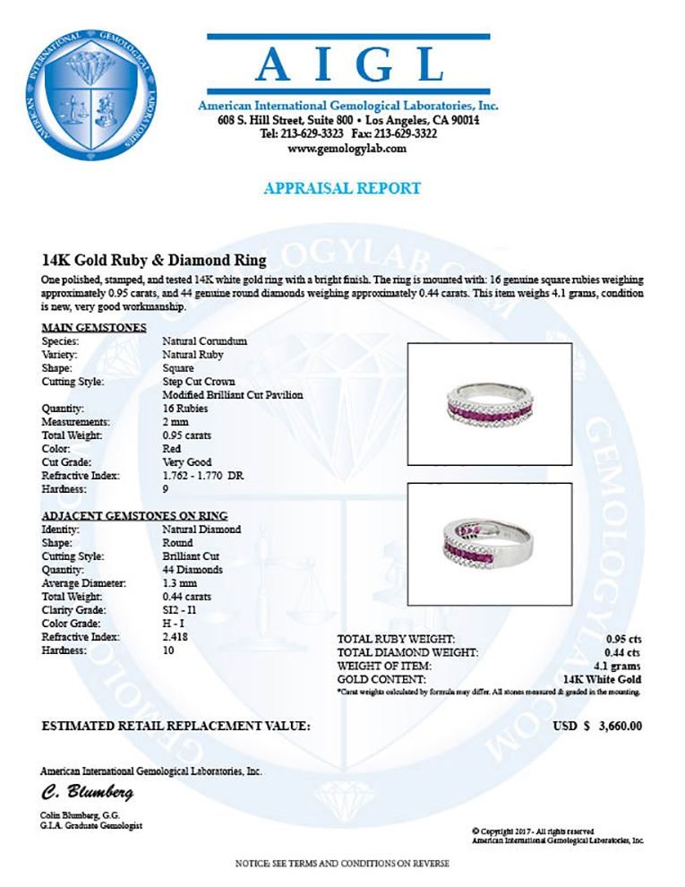 One 14KT White Gold 0.95ctw Ruby and Diamond Ring. (16) Rubies with a total weight of 0.95cts. (44) Diamonds with a total weight of 0.44cts. Total weight of this ring is 4.1 grams.