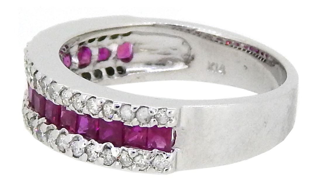 One 14KT White Gold 0.95ctw Ruby and Diamond Ring. (16) Rubies with a total weight of 0.95cts. (44) Diamonds with a total weight of 0.44cts. Total weight of this ring is 4.1 grams.