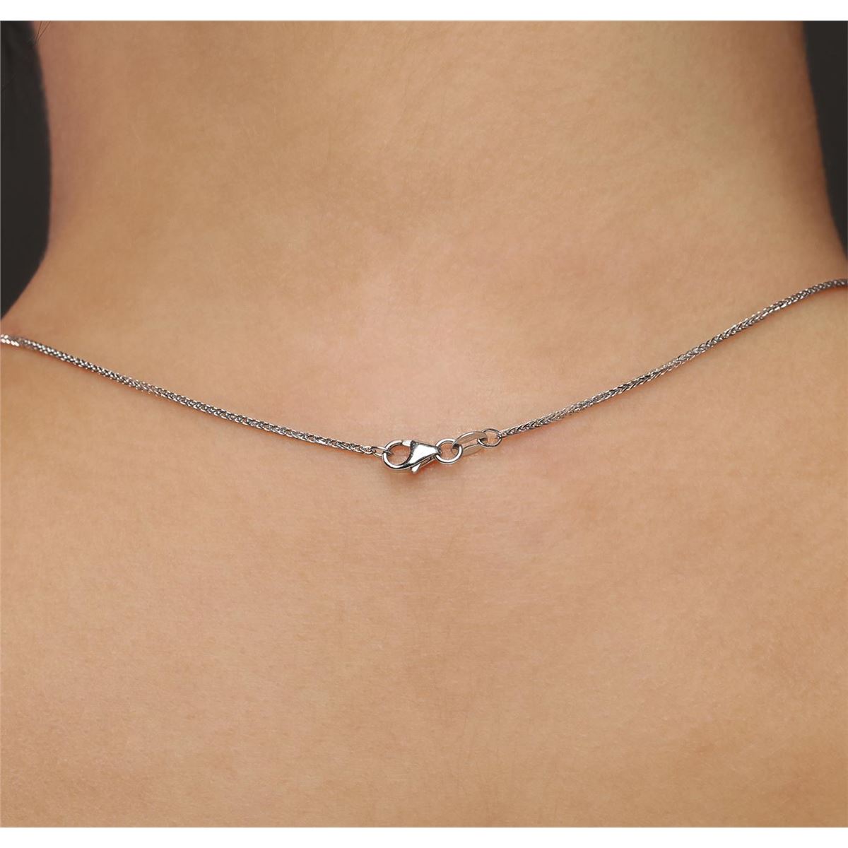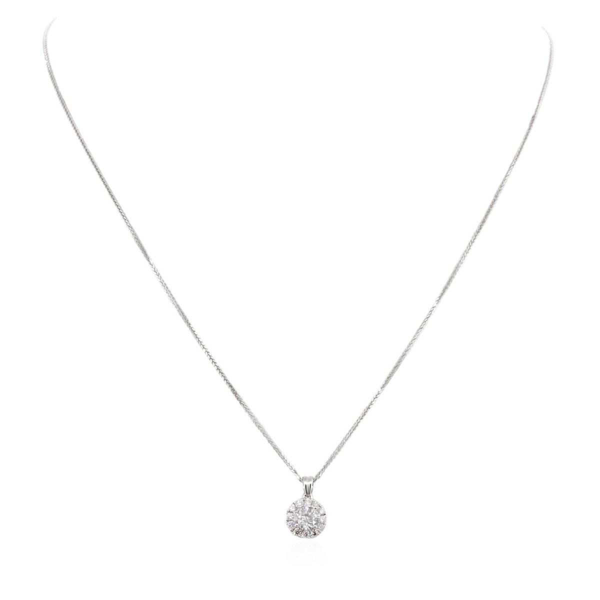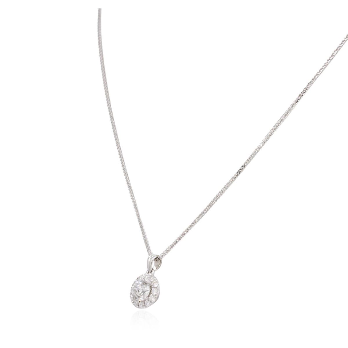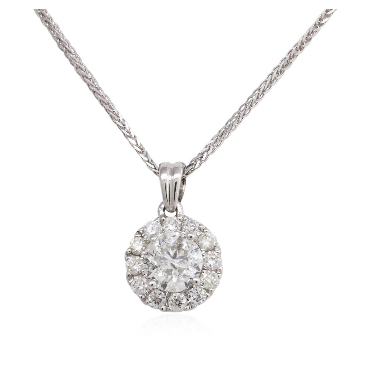 One electronically tested 14KT white gold ladies combination cast & assembled diamond pendant & chain 18.0" long, medium fancy cable with a lobster claw clasp with a bright polish finish. Identified with markings of "14K". Condition is new. Containing: One prong set round brilliant cut diamond, measuring 5.62 - 5.61 x 3.65mm (depth est.) approximate weight of 0.70ct. Clarity: I-3. Color: I, Cut is Good. Twelve prong set round brilliant cut diamonds, measuring 1.80 - 1.80 x 1.08mm (depth est.) approximate total weight of 12 Stones = 0.26ct. Clarity: SI-2 to I-2. Color: H - J, Cut is Good. All diamonds are graded in the mounting, unless otherwise stated. Total Weight of Diamonds 0.96ct. Total Weight of Pendant & Chain 2.70 grams. GGL Appraised at $3,725.00.