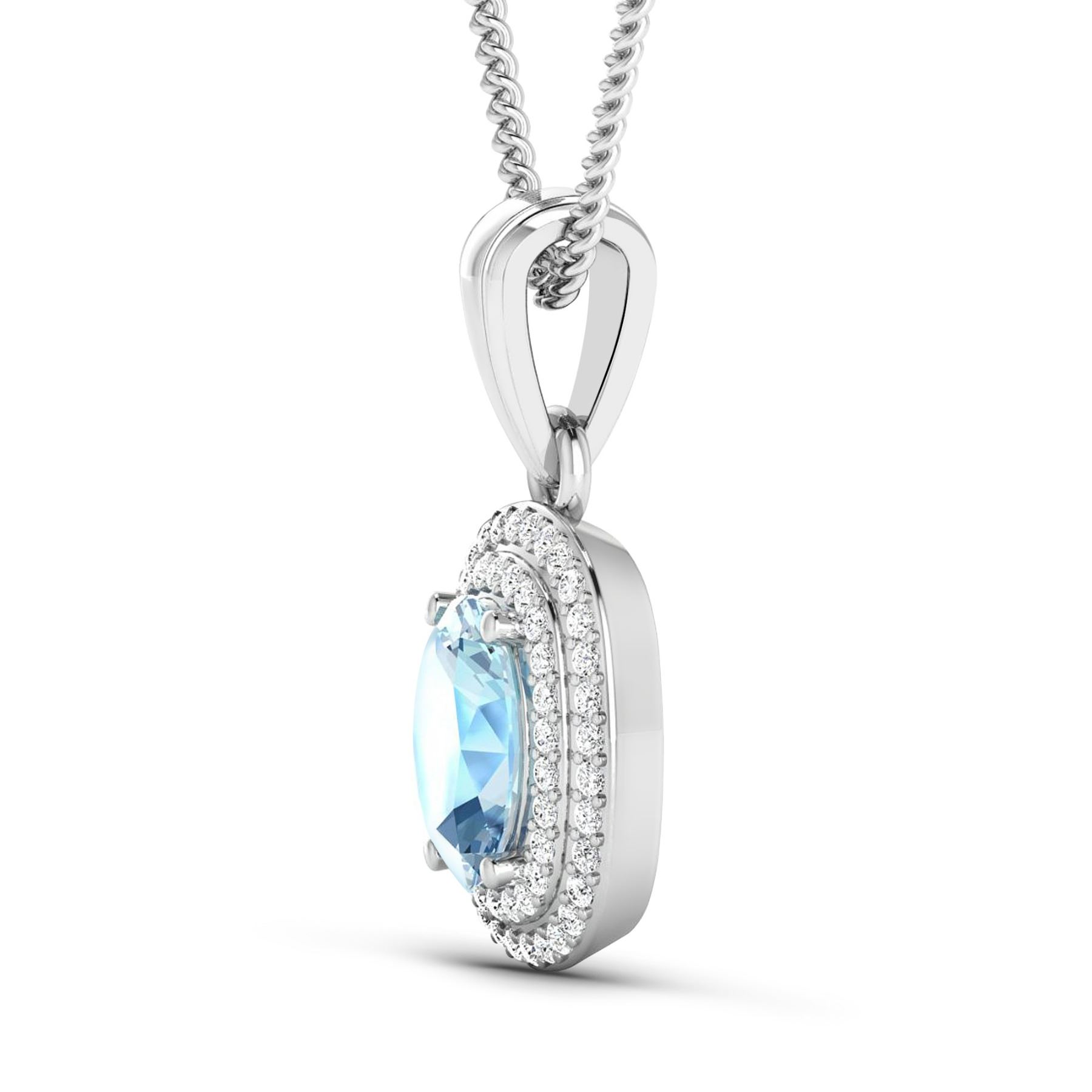 (1) Oval Aquamarine stone with a total weight of 0.96cts. (58) round Diamonds with a total weight of 0.26cts with a color of (i) and a clarity of i1-i2. Total weight of this pendant with chain is 2.88 grams. 16 inch chain.