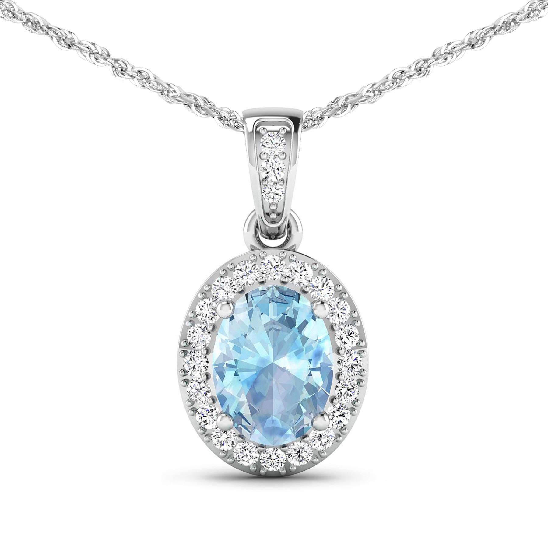 1 Aquamarine stone with a total weight of 0.96cts. Aquamarine (AA+) Oval 8x6mm - 1Pc + White Diamond F/C Round 1.20mm - 22Pcs + White Diamond F/C Round 1.10mm - 1Pc ( I1-I2/I color ). Diamonds with a total weight of 0.18cts. Total weight of pendant with chain is 1.59 grams. 16inch chain.