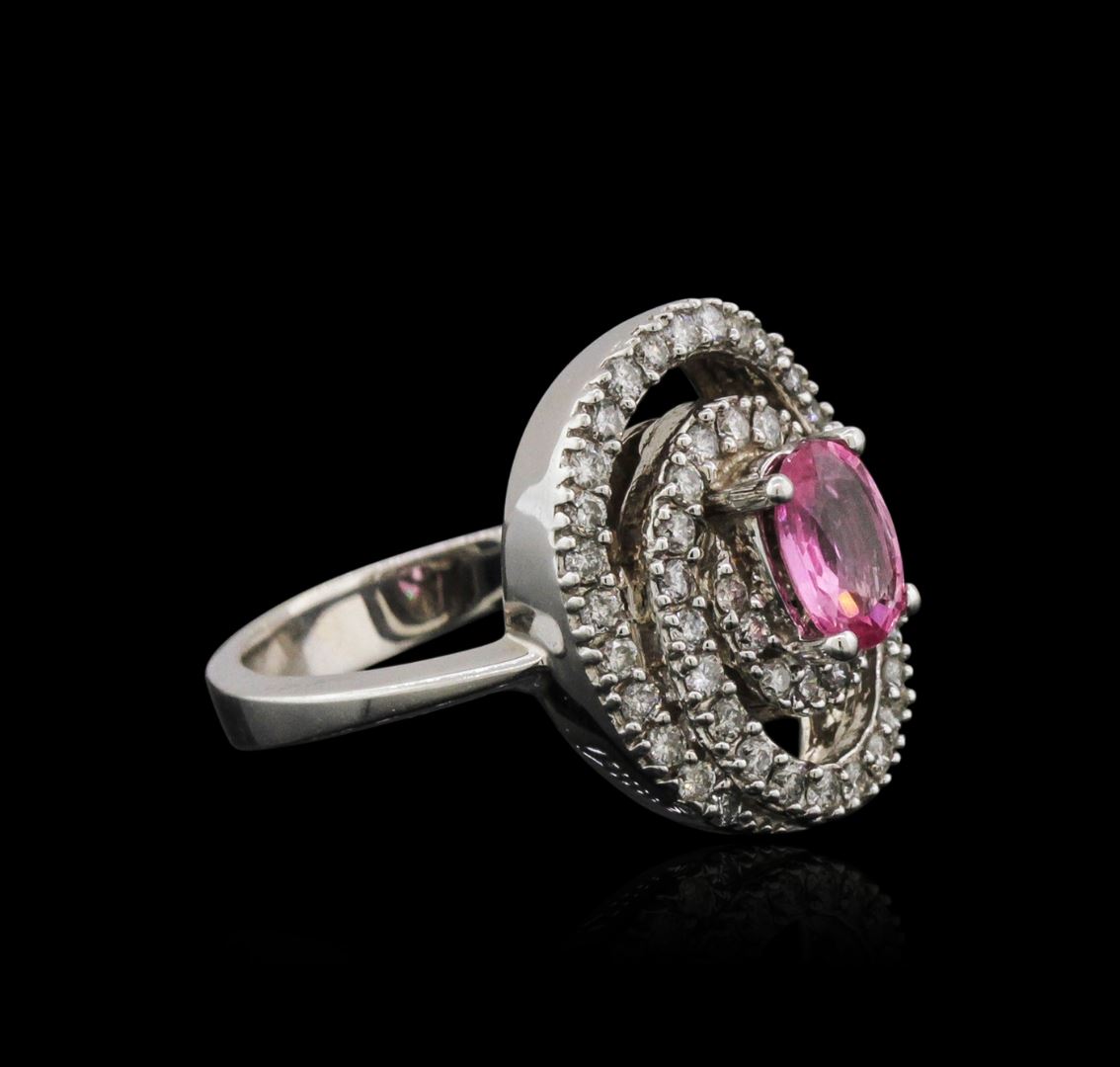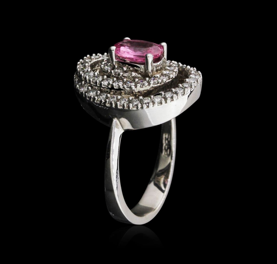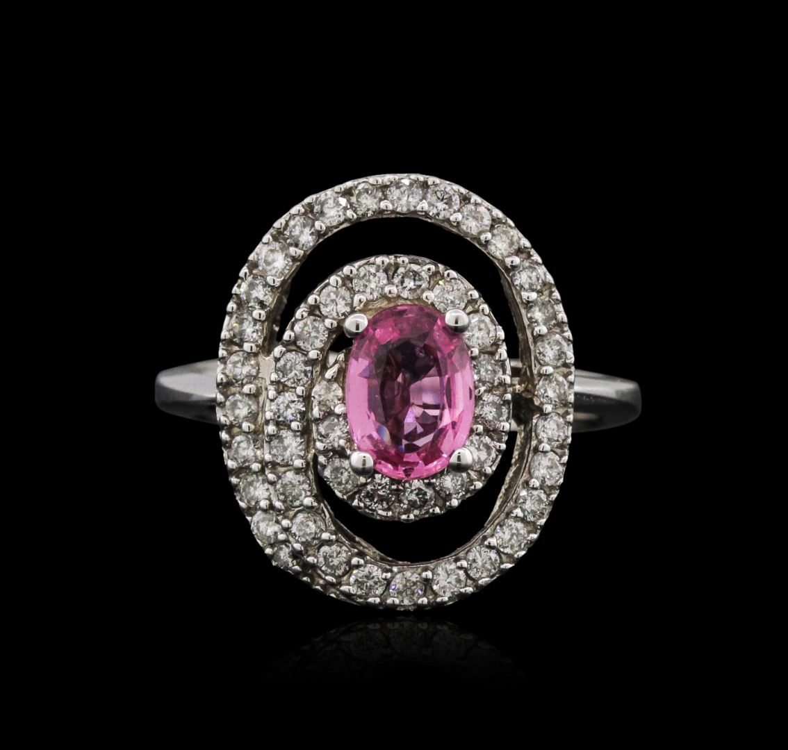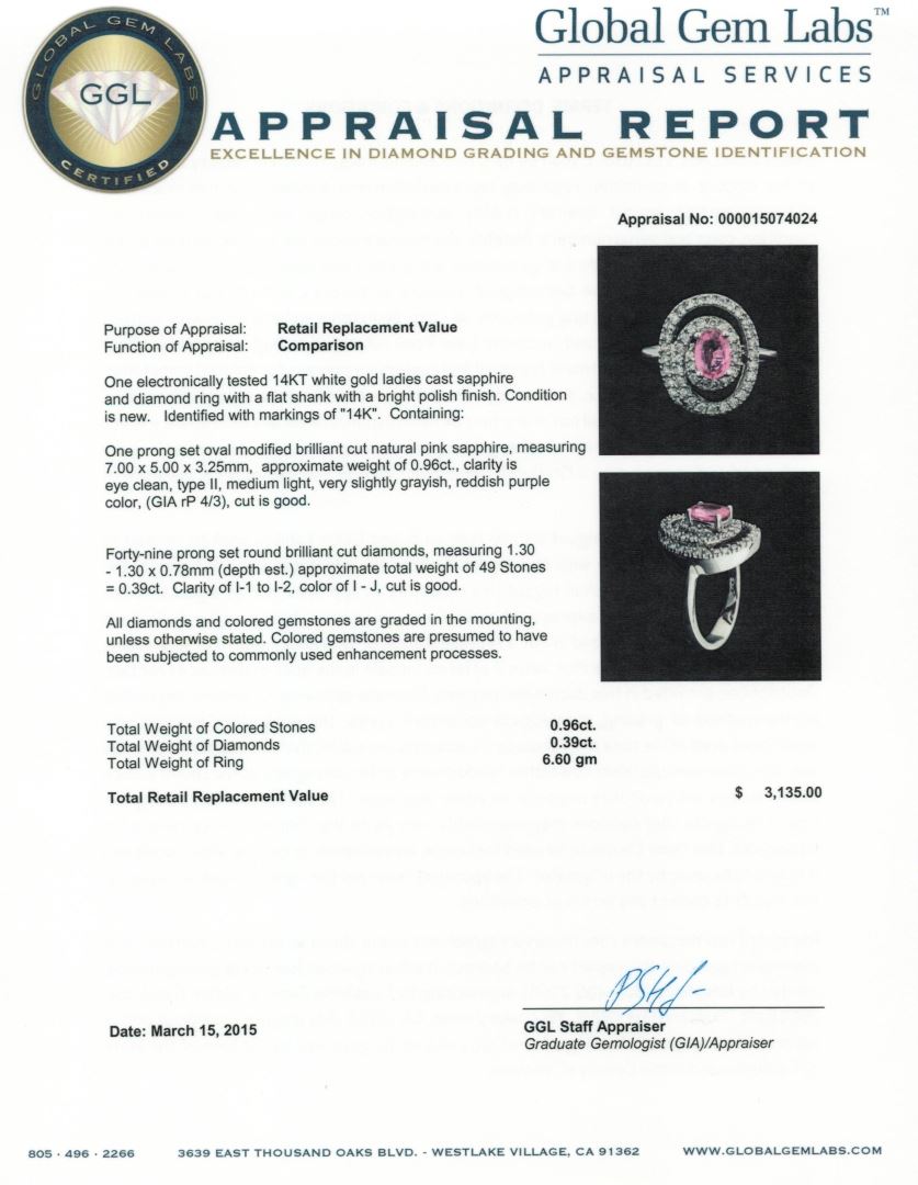 One electronically tested 14KT white gold ladies cast sapphire and diamond ring with a flat shank with a bright polish finish. Identified with markings of "14K". Condition is new. Containing: One prong set oval modified brilliant cut natural pink sapphire, measuring 7.00 x 5.00 x 3.25mm, approximate weight of 0.96ct., clarity is eye clean, type II, medium light, very slightly grayish, reddish purple color, (GIA rP 4/3), cut is good. Forty-Nine prong set round brilliant cut diamonds, measuring 1.30 - 1.30 x 0.78mm (depth est.) approximate total weight of 49 Stones = 0.39ct. Clarity of I-1 to I-2, Color of I - J, Cut is Good. All diamonds and colored gemstones are graded in the mounting, unless otherwise stated. Colored gemstones are presumed to have been subjected to commonly used enhancement processes. Total Weight of Colored Stones 0.96ct. Total Weight of Diamonds 0.39ct. Total Weight of Ring 6.60 grams. GGL Appraised at $3,135.00.