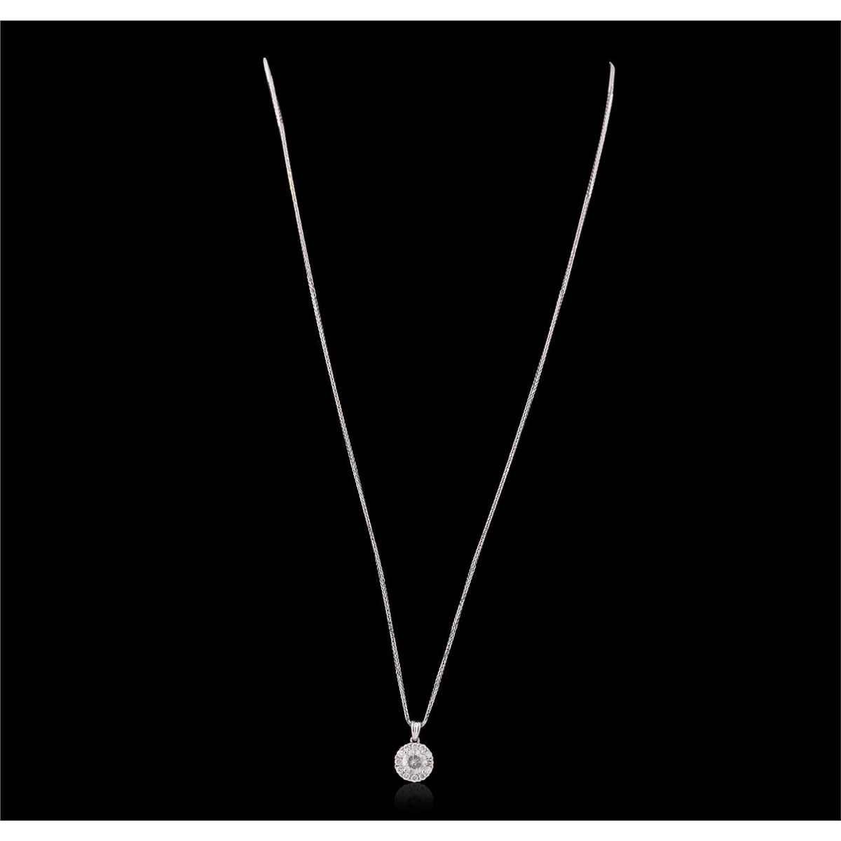 One electronically tested 14KT white gold ladies combination cast & assembled diamond pendant & chain 18.0" long, medium fancy cable with a lobster claw clasp with a bright polish finish. Identified with markings of "14K". Condition is new. Containing: One prong set round brilliant cut diamond, measuring 5.77 - 5.76 x 3.45mm (depth est.) approximate weight of 0.70ct. Clarity: I-3. Color: G, Cut is Good. Twelve prong set round brilliant cut diamonds, measuring 1.80 - 1.80 x 1.08mm (depth est.) approximate total weight of 12 Stones = 0.26ct. Clarity: SI-2 to I-2. Color: H - I, Cut is Good. All diamonds are graded in the mounting, unless otherwise stated. Total Weight of Diamonds 0.96ct. Total Weight of Pendant & Chain 2.70 grams. GGL Appraised at $3,375.00.