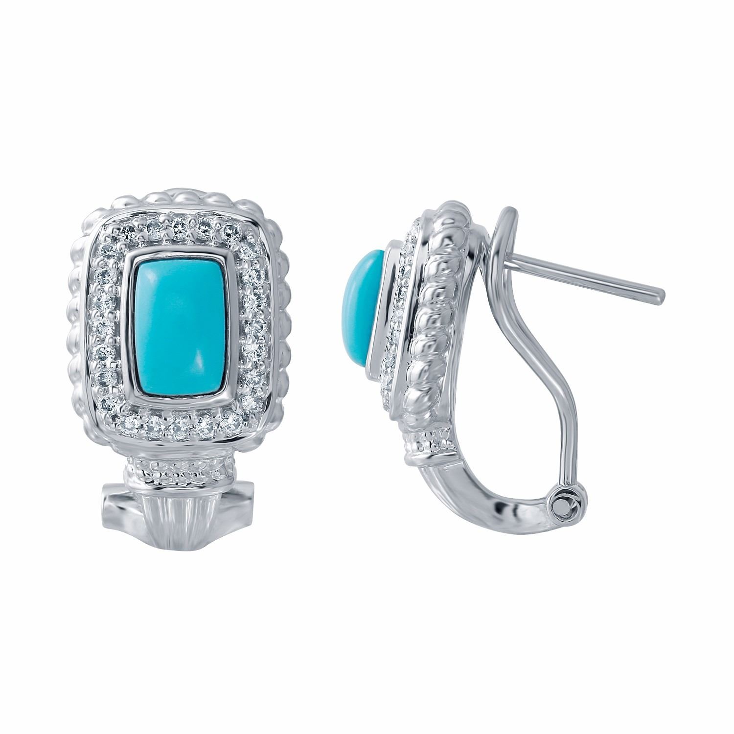 One 14KT White Gold 0.96ctw Turquoise and Diamond Earrings. (2) Turquoise stones with a total weight of 0.96cts. (48) Diamonds with a total weight of 0.27cts. Total weight of these earrings are 7.03 grams.