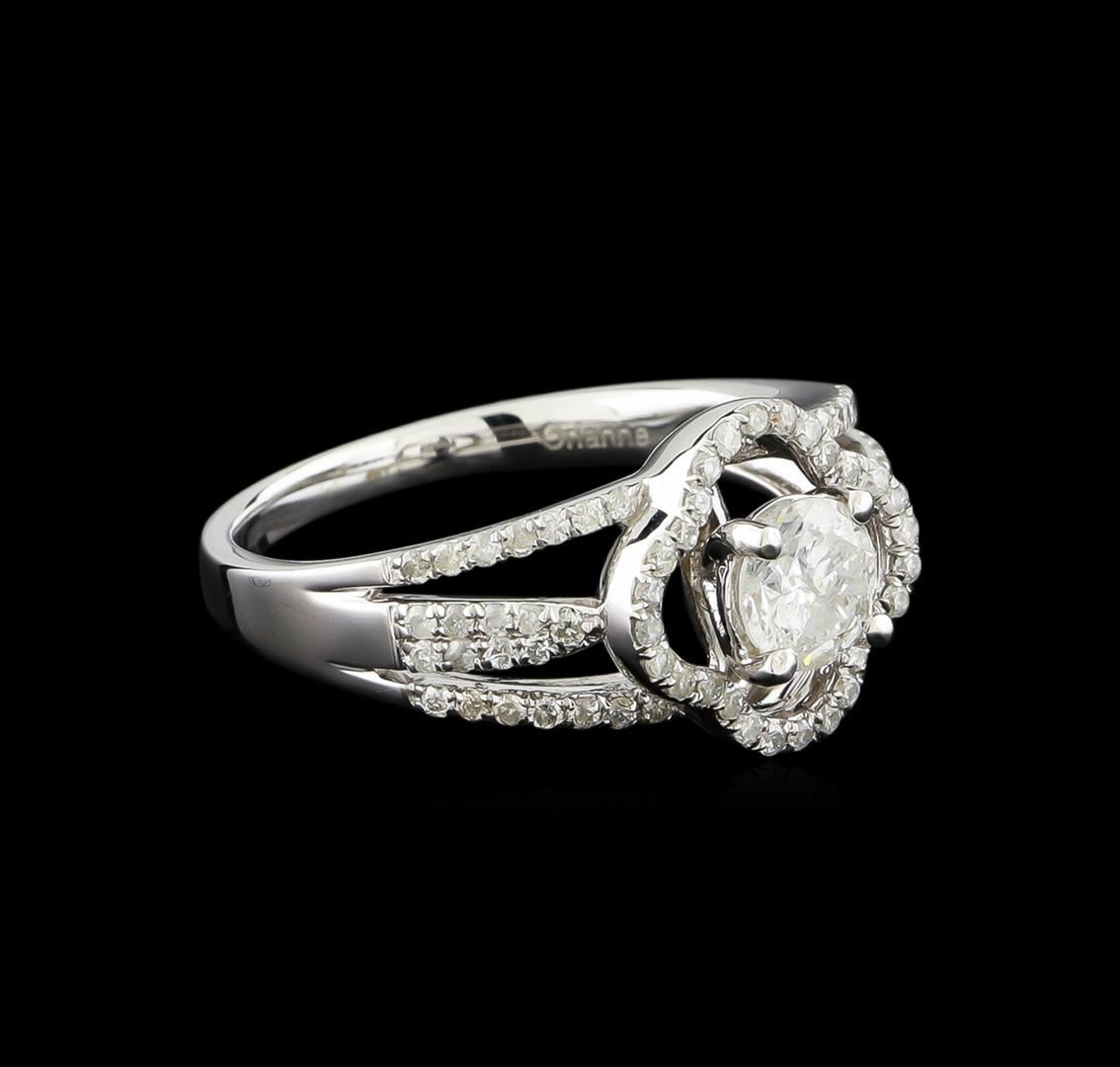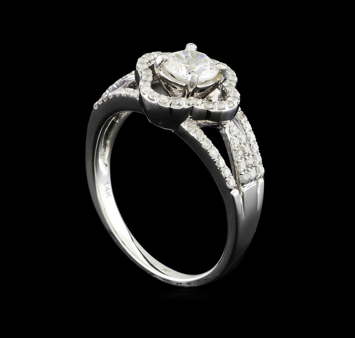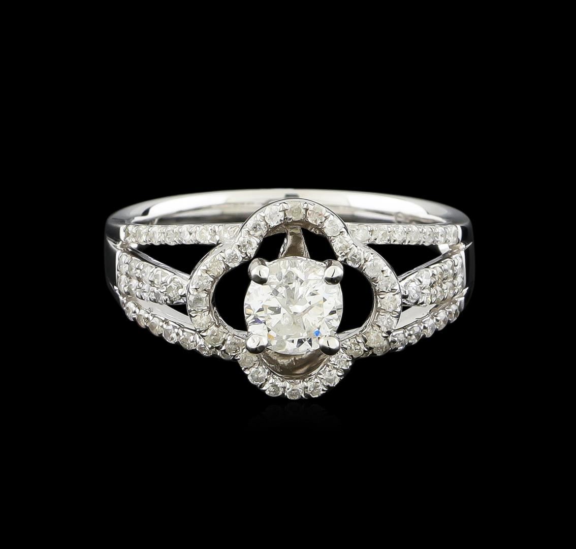 One electronically tested 14KT white gold ladies combination cast & assembled engagement ring with a split shank with a bright polish finish. Identified with markings of "14K". Condition is new. Containing: One prong set round brilliant cut diamond, measuring 5.40 - 5.40 x 3.07mm (depth est.) approximate weight of 0.55ct. Clarity: I-1. Color: H, Cut is Good. One Hundred Two prong set round brilliant cut diamonds, measuring 1.10 - 1.00 x 0.63mm (depth est.) approximate total weight of 102 Stones = 0.43ct. Clarity: I-1 to I-2. Color: H - I, Cut is Good. All diamonds are graded in the mounting, unless otherwise stated. Total Weight of Diamonds 0.97ct. Total Weight of Ring 4.30 grams. GGL Appraised at $6,225.00.
