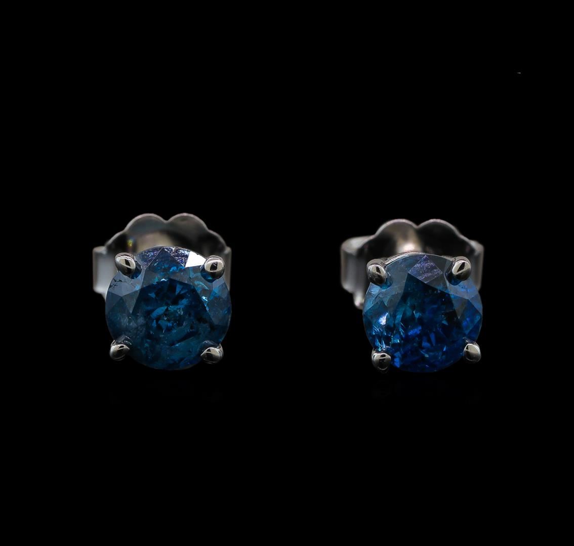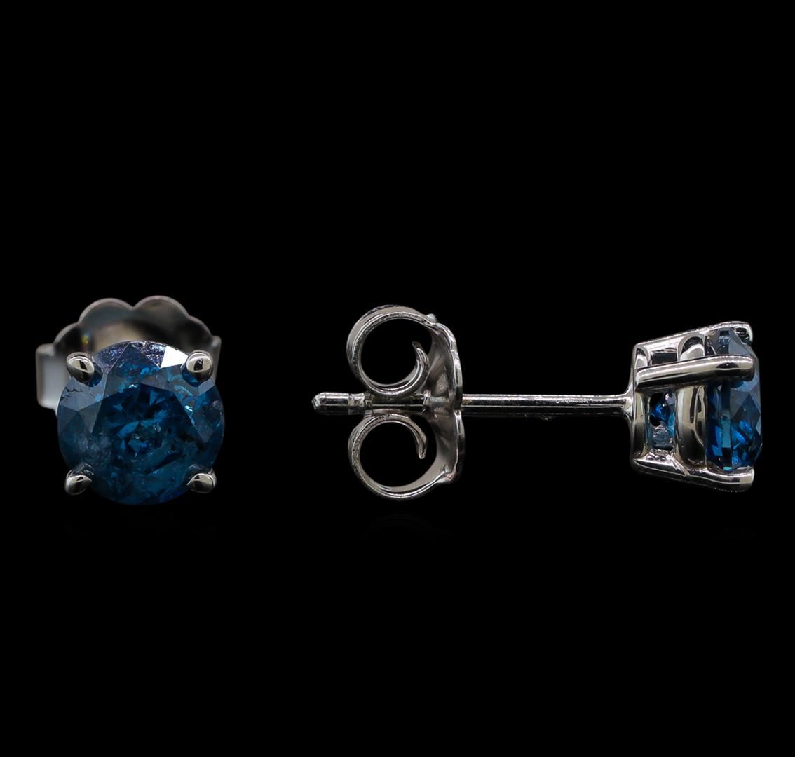 One pair electronically tested 14KT white gold ladies cast diamond stud earrings with friction posts with a bright polish finish. Identified with markings of "14K". Condition is new. Containing: Two prong set round brilliant cut diamonds, measuring 5.10 - 5.10 x 3.06mm (depth est.) approximate total weight of 2 Stones = 0.97ct. Clarity: I-2, Cut is Good. Color of the stones has been treated. Diamonds are graded in the mounting, unless otherwise stated. Total Weight of Diamonds 0.97ct. Total Weight of Stud Earrings 1.00 grams. GGL Appraised at $1,380.00.