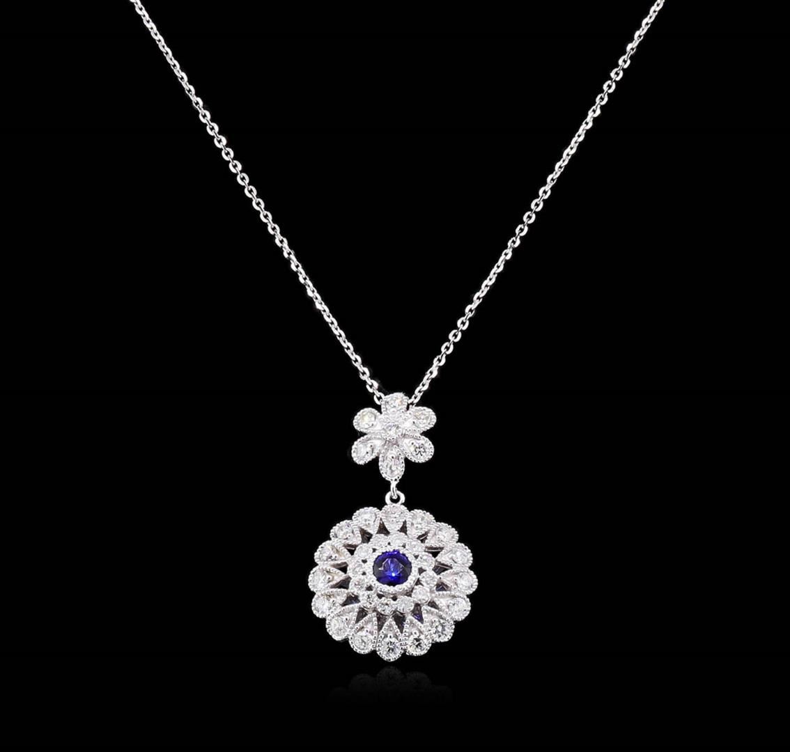 One pendant with chain featuring: 14KT white gold weighing 3.95 grams containing one sapphire weighing 0.26ct and diamonds weighing 0.71ctw. The chain measures approximately eighteen inches in length.