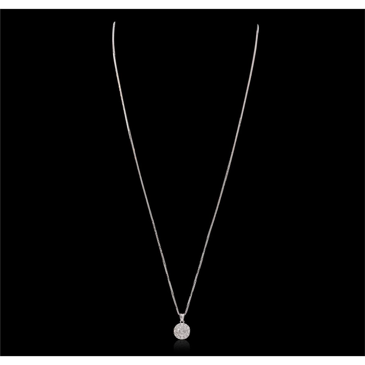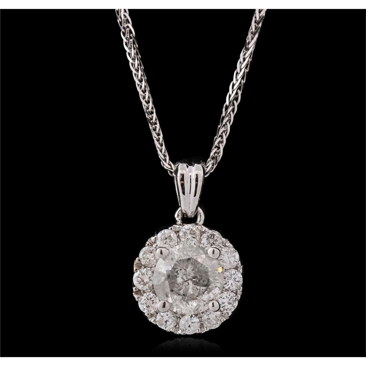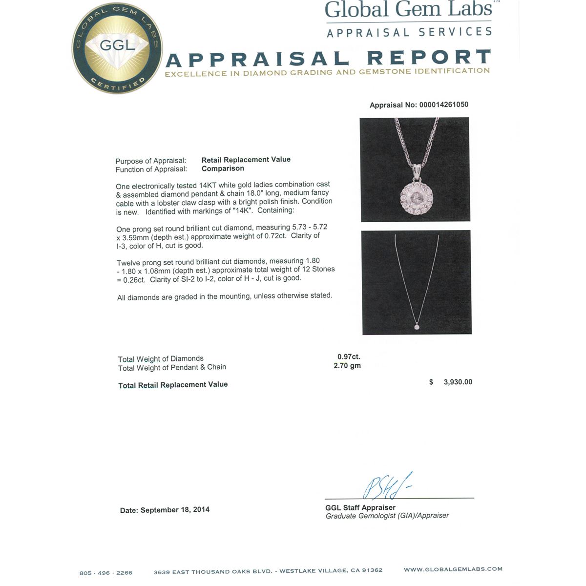One electronically tested 14KT white gold ladies combination cast & assembled diamond pendant & chain 18.0" long, medium fancy cable with a lobster claw clasp with a bright polish finish. Identified with markings of "14K". Condition is new. Containing: One prong set round brilliant cut diamond, measuring 5.73 - 5.72 x 3.59mm (depth est.) approximate weight of 0.72ct. Clarity: I-3. Color: H, Cut is Good. Twelve prong set round brilliant cut diamonds, measuring 1.80 - 1.80 x 1.08mm (depth est.) approximate total weight of 12 Stones = 0.26ct. Clarity: SI-2 to I-2. Color: H - J, Cut is Good. All diamonds are graded in the mounting, unless otherwise stated. Total Weight of Diamonds 0.97ct. Total Weight of Pendant & Chain 2.70 grams. GGL Appraised at $3,930.00.