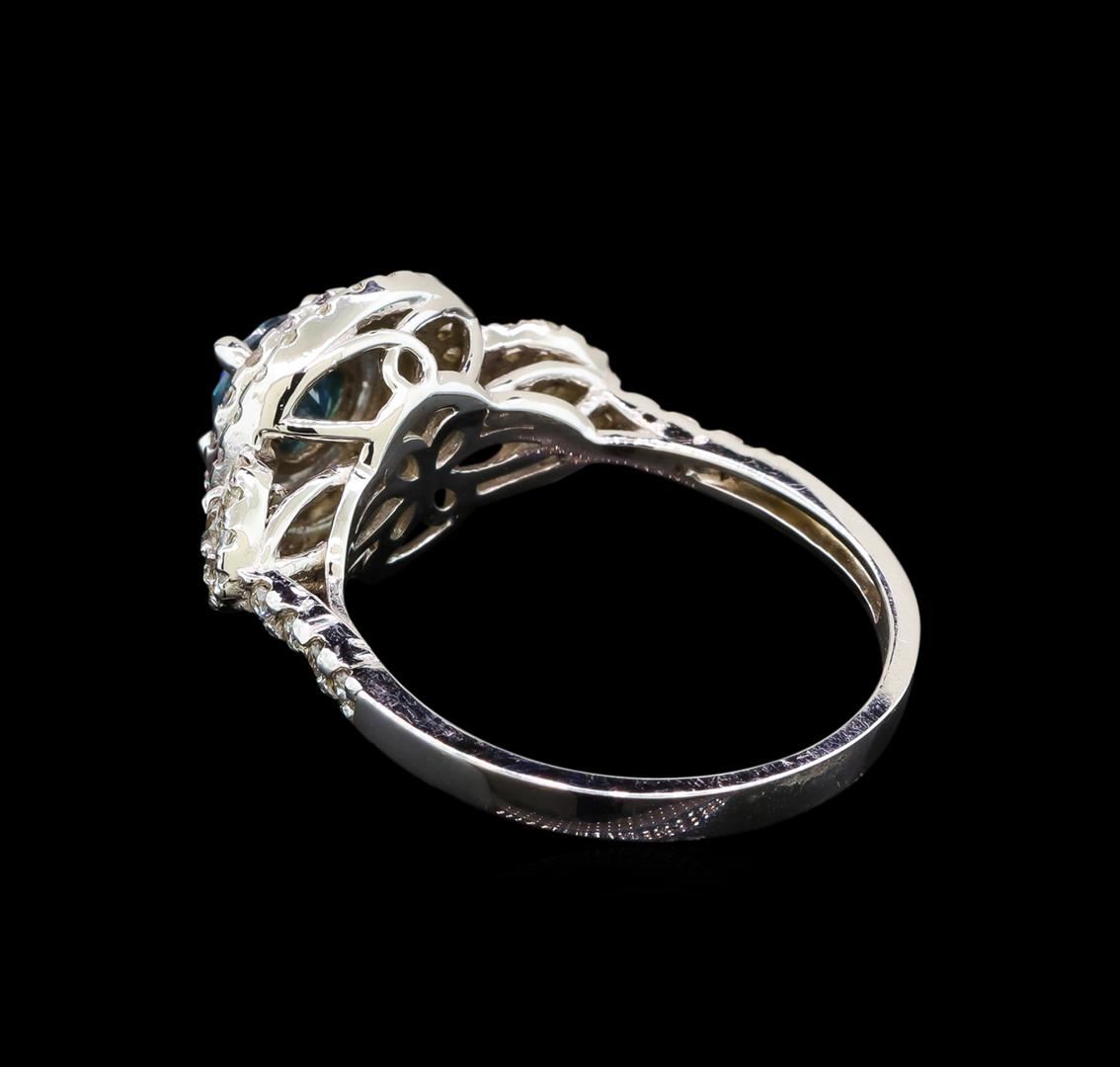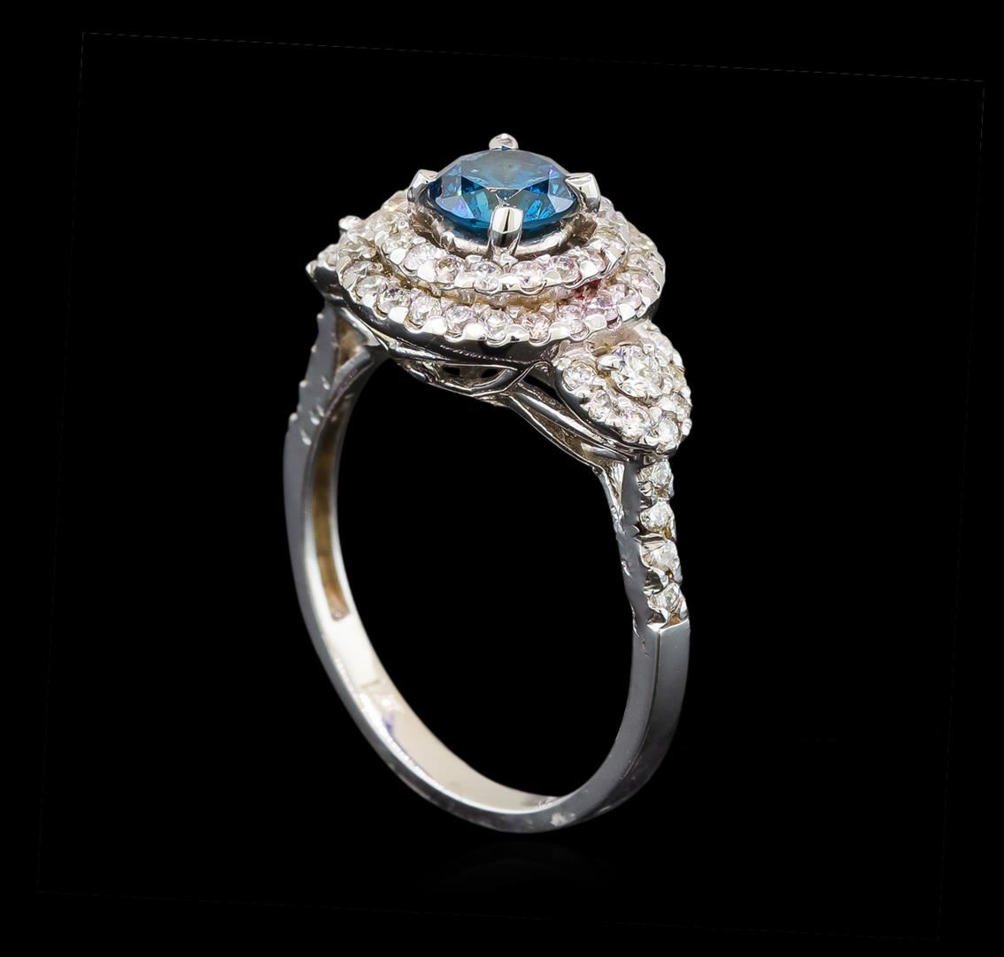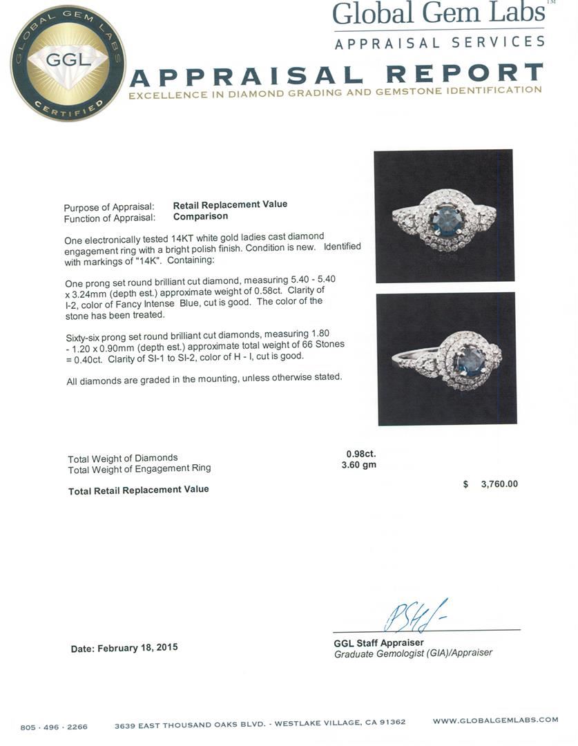 One electronically tested 14KT white gold ladies cast diamond engagement ring with a bright polish finish. Identified with markings of "14K". Condition is new. Containing: One prong set round brilliant cut diamond, measuring 5.40 - 5.40 x 3.24mm (depth est.) approximate weight of 0.58ct. Clarity: I-2, Cut is Good. The color of the stone has been treated. Sixty-Six prong set round brilliant cut diamonds, measuring 1.80 - 1.20 x 0.90mm (depth est.) approximate total weight of 66 Stones = 0.40ct. Clarity: SI-1 to SI-2. Color: H - I, Cut is Good. All diamonds are graded in the mounting, unless otherwise stated. Total Weight of Diamonds 0.98ct. Total Weight of Engagement Ring 3.60 grams. GGL Appraised at $3,760.00.