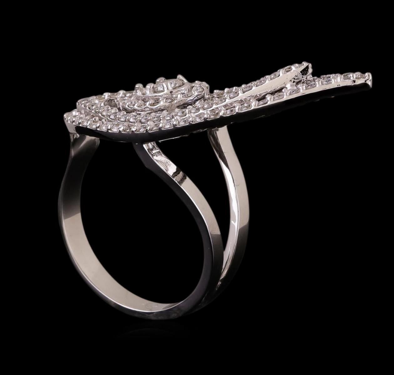 One electronically tested 14KT white gold ladies cast diamond ring with a bright polish finish. Identified with markings of "K14". Condition is new. Containing: One prong set round brilliant cut diamond, measuring 2.80 - 2.80 x 1.68mm (depth est.) approximate weight of 0.08ct. Clarity: I-1. Color: I, Cut is Good. One Hundred Twelve prong set round brilliant cut diamonds, measuring 1.50 - 1.10 x 0.78mm (depth est.) approximate total weight of 112 Stones = 0.90 ct. Clarity: I-1 to I-2. Color: I - J, Cut is Good. All diamonds are graded in the mounting, unless otherwise stated. Total Weight of Diamonds 0.98ct. Total Weight of Ring 5.80 grams. GGL Appraised.