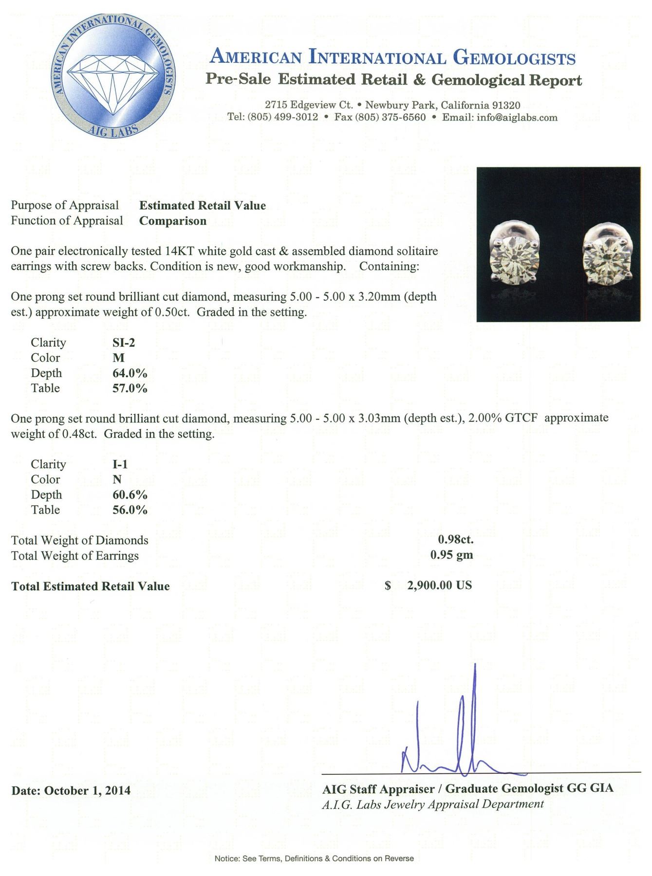 One pair electronically tested 14KT white gold cast & assembled diamond solitaire earrings with screw backs. Condition is new, good workmanship. Containing: One prong set round brilliant cut diamond, measuring 5.00 - 5.00 x 3.20mm (depth est.) approximate weight of 0.50ct. Graded in the setting. Clarity: SI-2. Color: M. Depth 64.0%. Table 57.0%. One prong set round brilliant cut diamond, measuring 5.00 - 5.00 x 3.03mm (depth est.), 2.00% GTCF approximate weight of 0.48ct. Graded in the setting. Clarity: I-1. Color: 60.6%. Table 56.0%. Total Weight of Diamonds 0.98ct. Total Weight of Earrings 0.95 grams. AIG Appraised at $2,900.00.