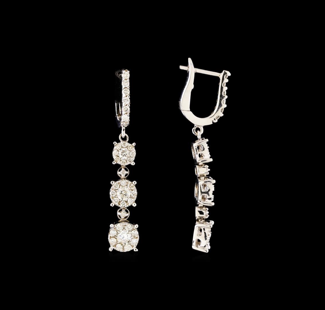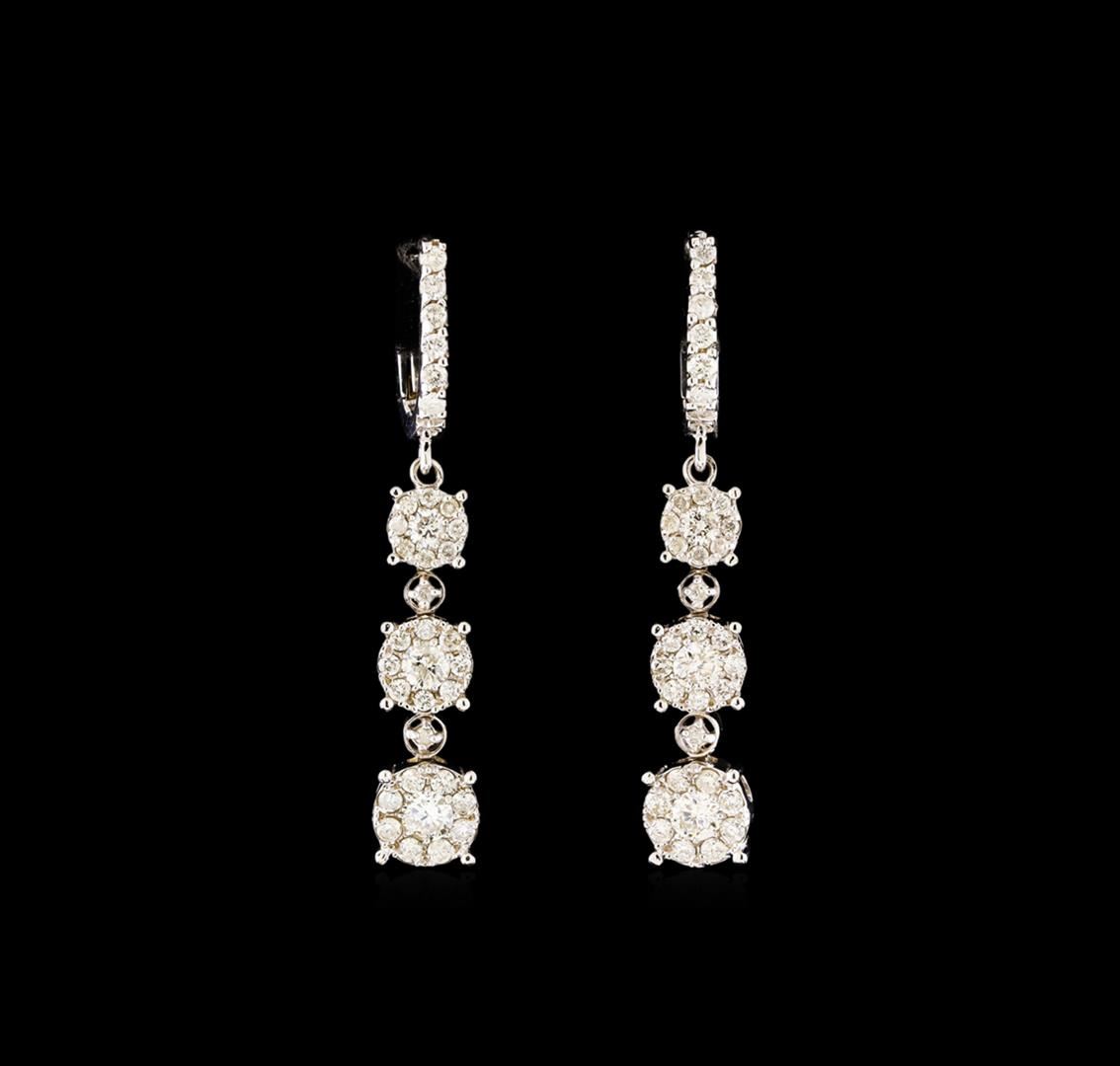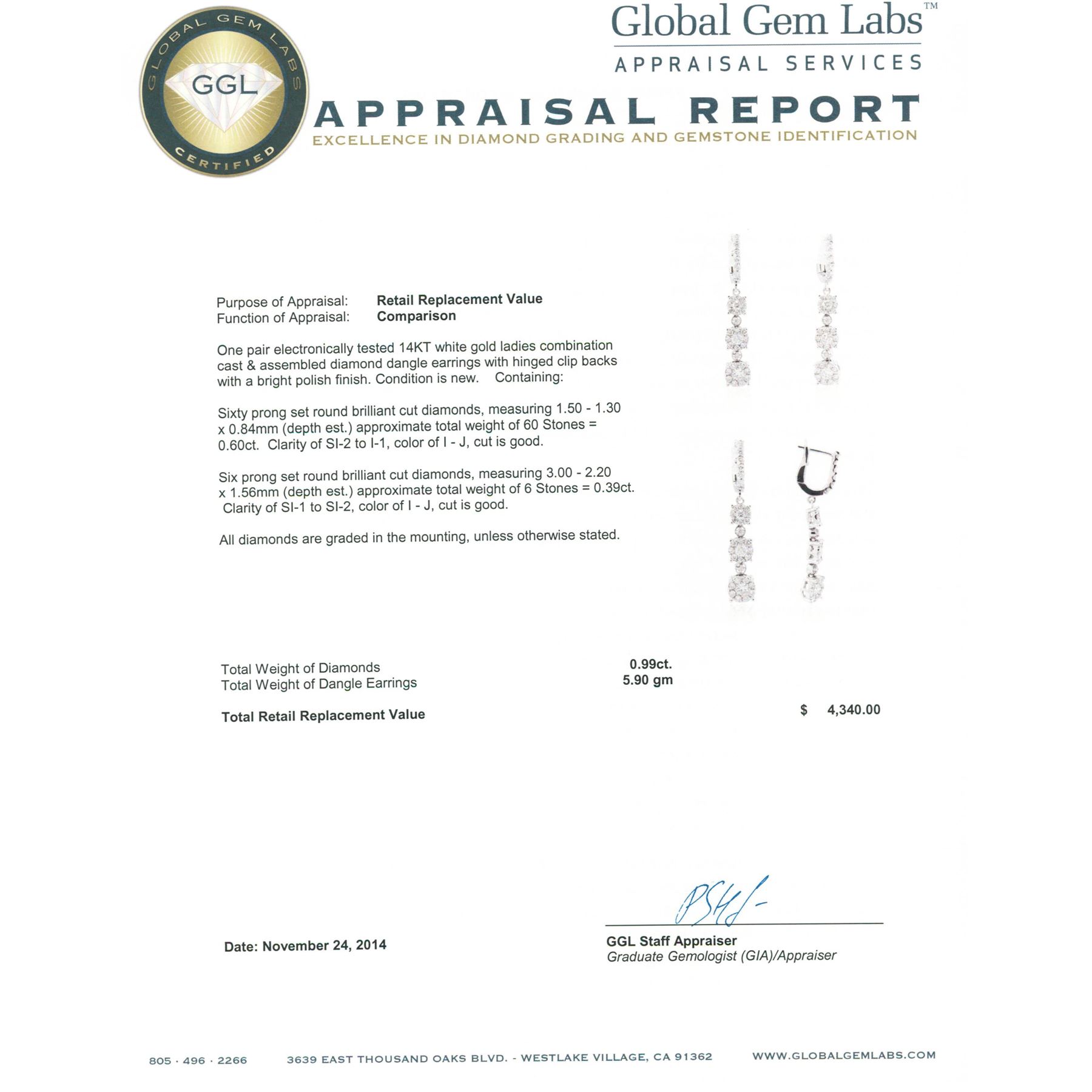 One pair electronically tested 14KT white gold ladies combination cast & assembled diamond dangle earrings with hinged clip backs with a bright polish finish. Condition is new. Containing: Sixty prong set round brilliant cut diamonds, measuring 1.50 - 1.30 x 0.84mm (depth est.) approximate total weight of 60 Stones = 0.60ct. . Clarity: SI-2 to I-1. Color: I - J, Cut is Good. Six prong set round brilliant cut diamonds, measuring 3.00 - 2.20 x 1.56mm (depth est.) approximate total weight of 6 Stones = 0.39ct. . Clarity: SI-1 to SI-2. Color: I - J, Cut is Good. All diamonds are graded in the mounting, unless otherwise stated. Total Weight of Diamonds 0.99ct. Total Weight of Dangle Earrings 5.90 grams. GGL Appraised at $4,340.00.