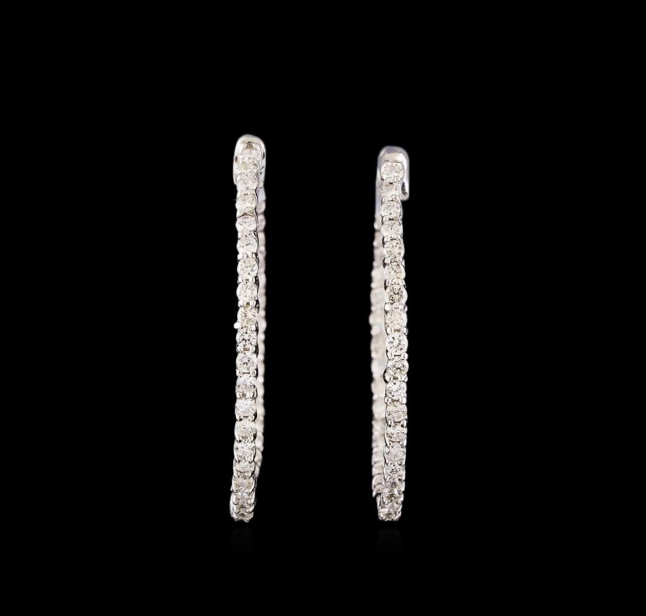 One pair electronically tested 14KT white gold ladies combination cast & assembled hoop earrings with hinged clip backs with a bright polish finish. Condition is new. Containing: Eighty prong set round brilliant cut diamonds, measuring 1.50 - 1.50 x 0.90mm (depth est.) approximate total weight of 80 Stones = 0.99ct. Clarity: SI-2 to I-1. Color: I - J, Cut is Good. All diamonds are graded in the mounting, unless otherwise stated. Total Weight of Diamonds 0.99ct. Total Weight of Earrings 7.00 grams. GGL Appraised at $4,930.00.