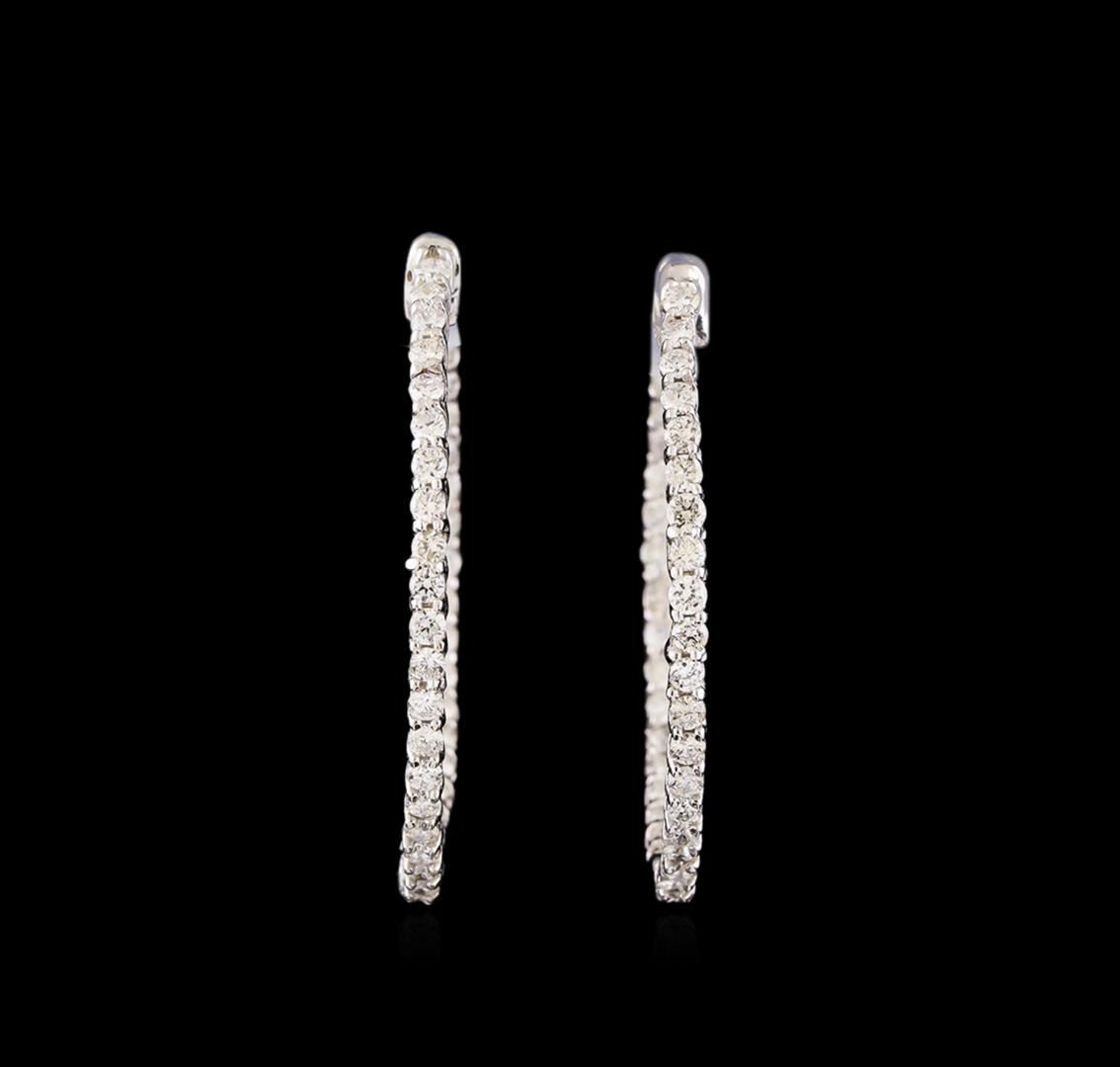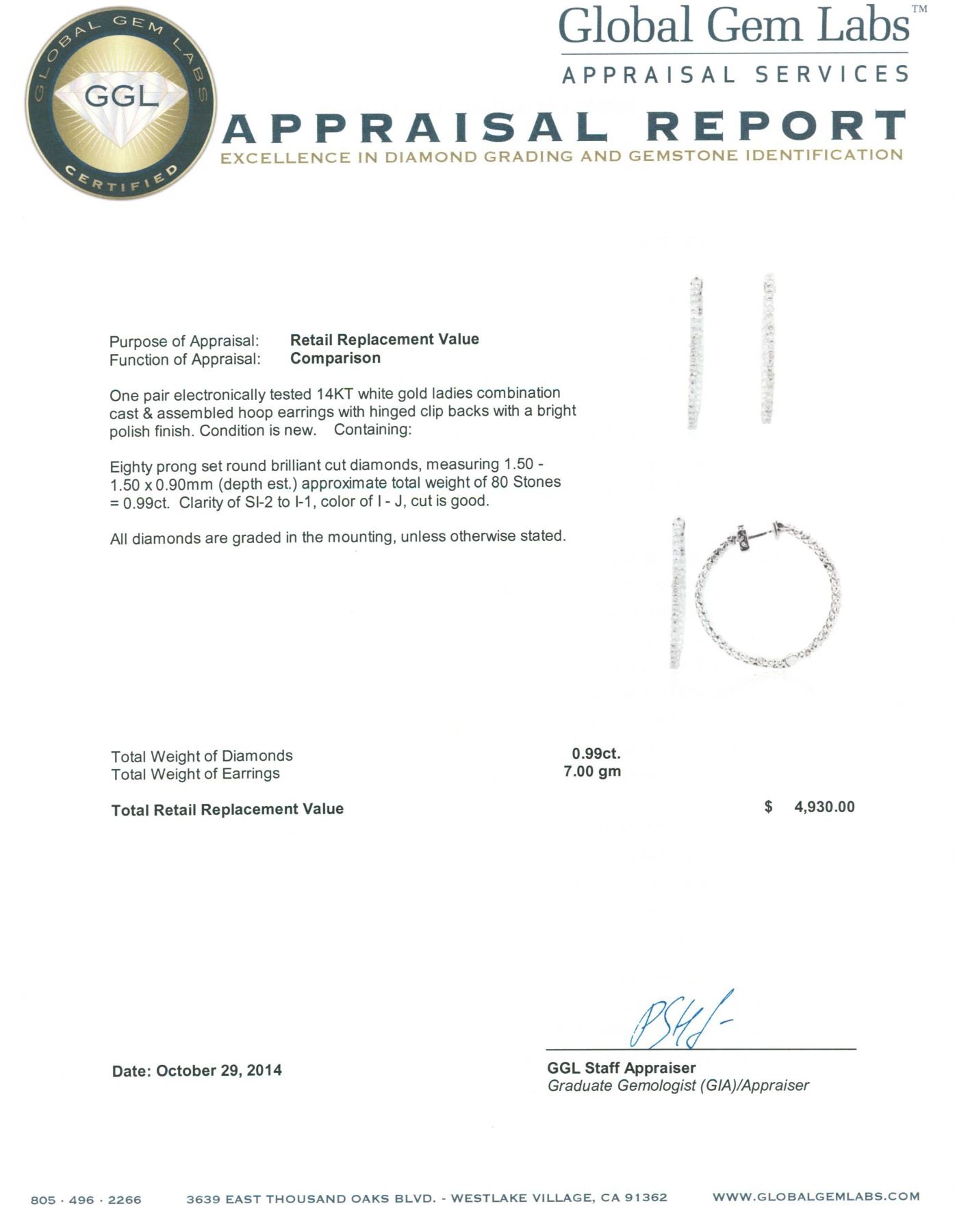 One pair electronically tested 14KT white gold ladies combination cast & assembled hoop earrings with hinged clip backs with a bright polish finish. Condition is new. Containing: Eighty prong set round brilliant cut diamonds, measuring 1.50 - 1.50 x 0.90mm (depth est.) approximate total weight of 80 Stones = 0.99ct. Clarity: SI-2 to I-1. Color: I - J, Cut is Good. All diamonds are graded in the mounting, unless otherwise stated. Total Weight of Diamonds 0.99ct. Total Weight of Earrings 7.00 grams. GGL Appraised.