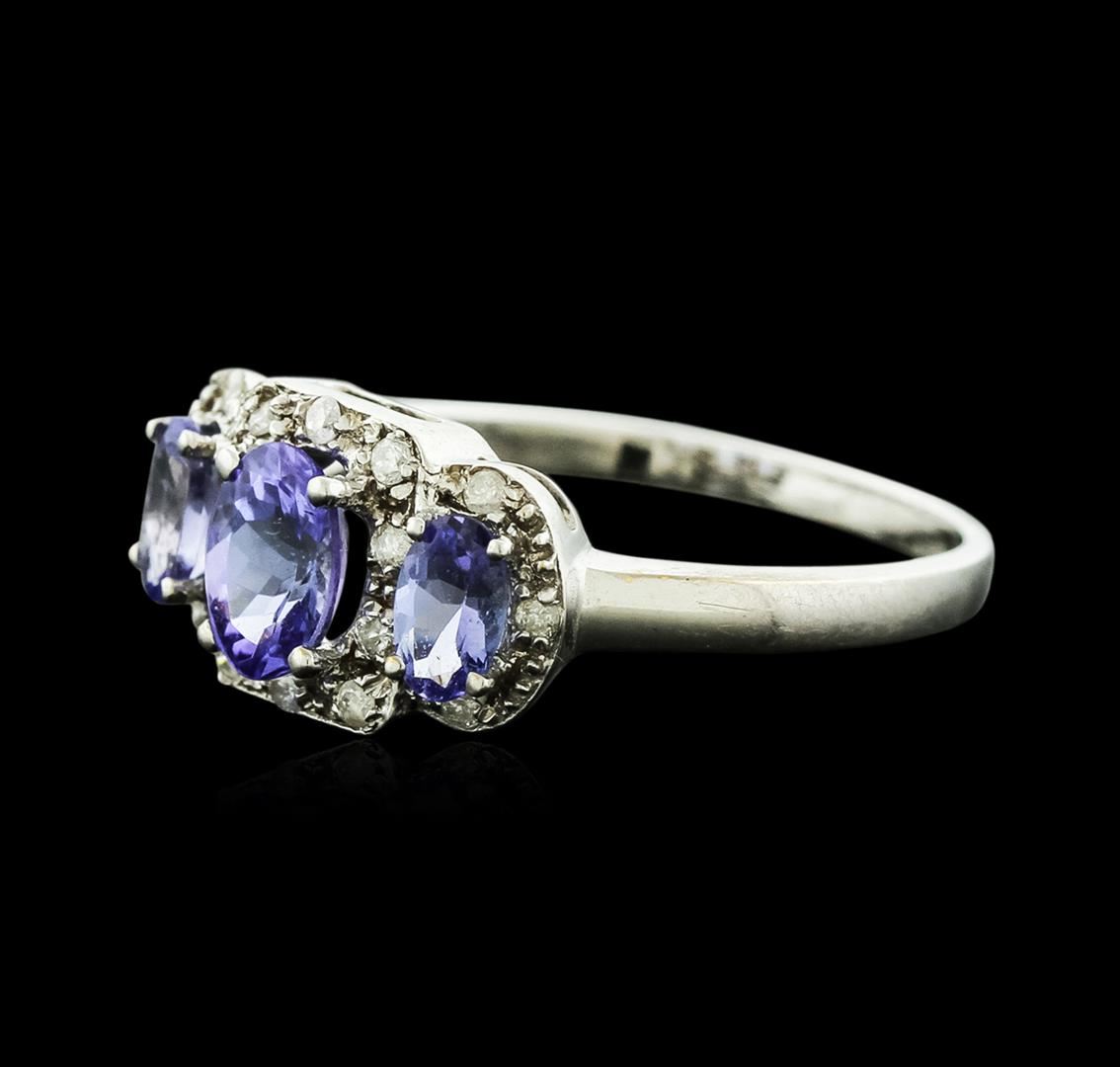 One electronically tested 14KT white gold ladies cast tanzanite and diamond ring with a bright polish finish. Identified with markings of "14K". Condition is new. Containing: One prong set oval modified brilliant cut natural tanzanite, measuring 6.40 x 4.50 x 2.93mm, approximate weight of 0.59ct., clarity is eye clean, type I, medium light, slightly grayish, violet color, (GIA V 4/2), cut is good. Two prong set oval modified brilliant cut natural tanzanites, measuring 4.90 x 3.00 x 1.95mm, approximate total weight of 0.40ct., clarity is eye clean, type I, medium light, slightly grayish, violet color, (GIA V 4/2), cut is good. Sixteen prong set round brilliant cut diamonds, measuring 1.30 - 1.30 x 0.78mm (depth est.) approximate total weight of 16 Stones = 0.13ct. Clarity: I-1 to I-2. Color: I - J. Colored gemstones are presumed to have been subjected to commonly used enhancement processes. Colored gemstones are presumed to have been subjected to commonly used enhancement processes. All diamonds and colored gemstones are graded in the mounting, unless otherwise stated. All diamonds and colored gemstones are graded in the mounting, unless otherwise stated. Total Weight of Colored Stones 0.99ct. Total Weight of Diamonds 0.13ct. Total Weight of Ring 3.30 grams. GGL Appraised at $1,670.00.