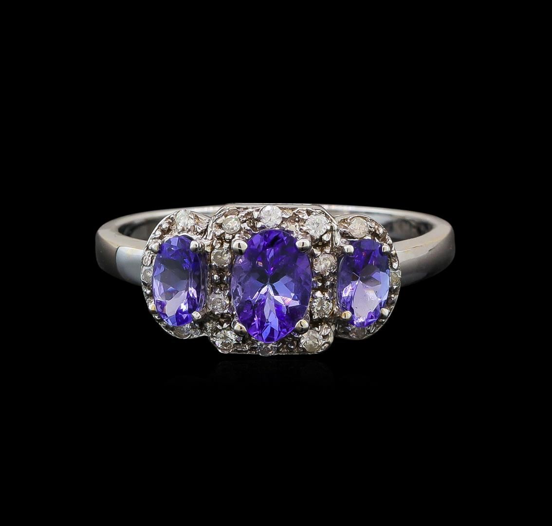 One electronically tested 14KT white gold ladies cast tanzanite and diamond ring with a bright polish finish. Identified with markings of "14K". Condition is new. Containing: One prong set oval modified brilliant cut natural tanzanite, measuring 6.40 x 4.50 x 2.93mm, approximate weight of 0.59ct., clarity is eye clean, type I, medium light, slightly grayish, violet color, (GIA V 4/2), cut is good. Two prong set oval modified brilliant cut natural tanzanites, measuring 4.90 x 3.00 x 1.95mm, approximate total weight of 0.40ct., clarity is eye clean, type I, medium light, slightly grayish, violet color, (GIA V 4/2), cut is good. Sixteen prong set round brilliant cut diamonds, measuring 1.30 - 1.30 x 0.78mm (depth est.) approximate total weight of 16 Stones = 0.13ct. Clarity: I-1 to I-2. Color: I - J. Colored gemstones are presumed to have been subjected to commonly used enhancement processes. Colored gemstones are presumed to have been subjected to commonly used enhancement processes. All diamonds and colored gemstones are graded in the mounting, unless otherwise stated. All diamonds and colored gemstones are graded in the mounting, unless otherwise stated. Total Weight of Colored Stones 0.99ct. Total Weight of Diamonds 0.13ct. Total Weight of Ring 3.30 grams. GGL Appraised at $1,670.00.