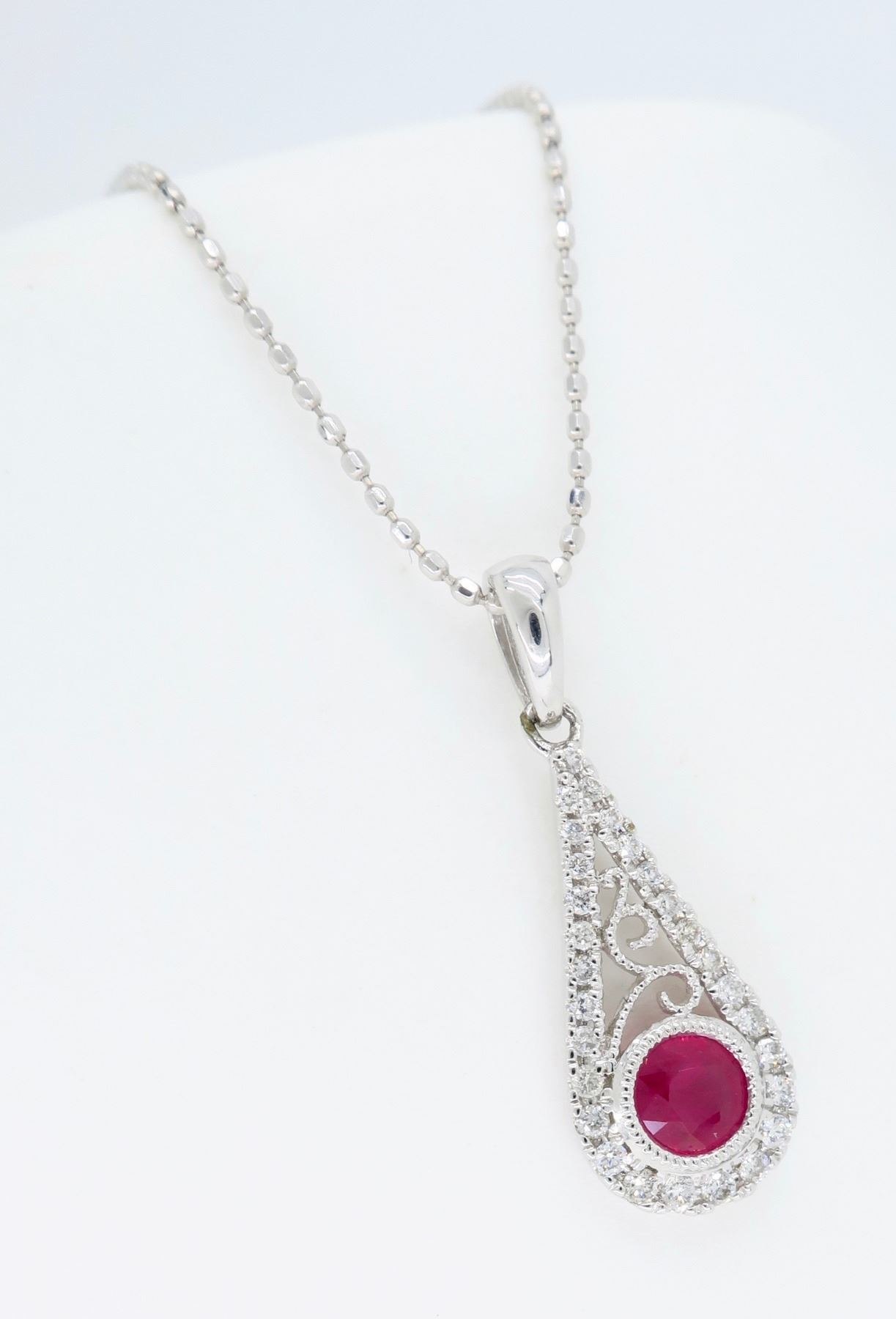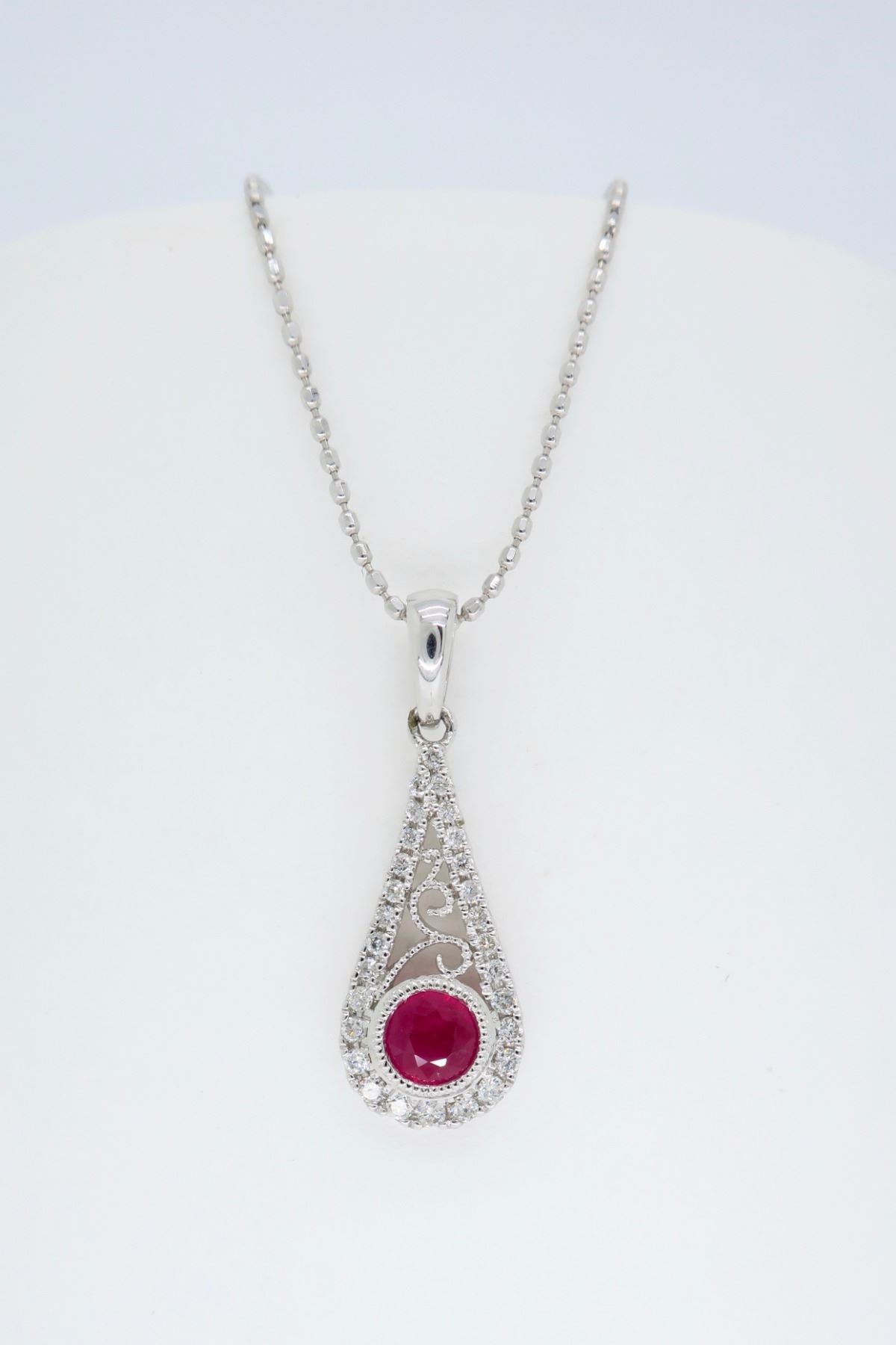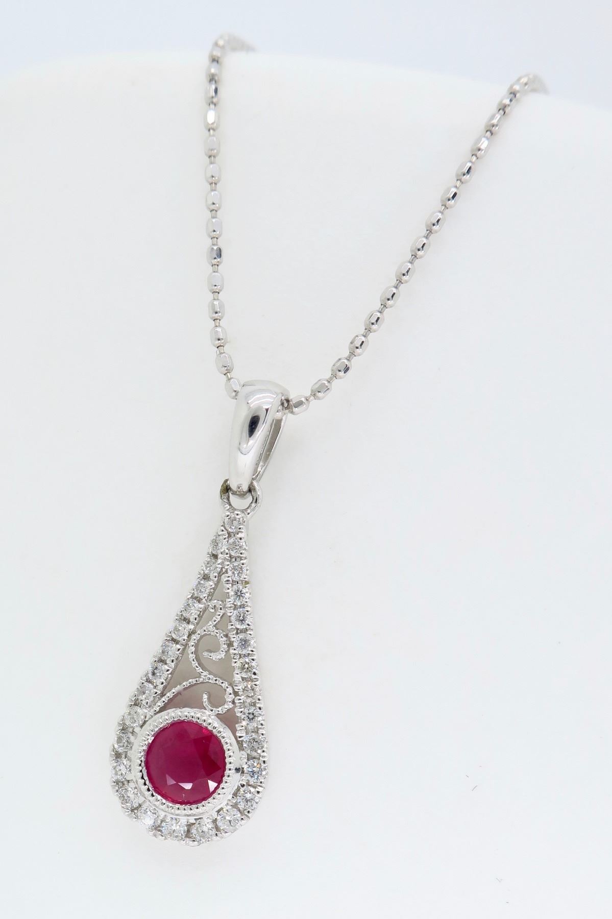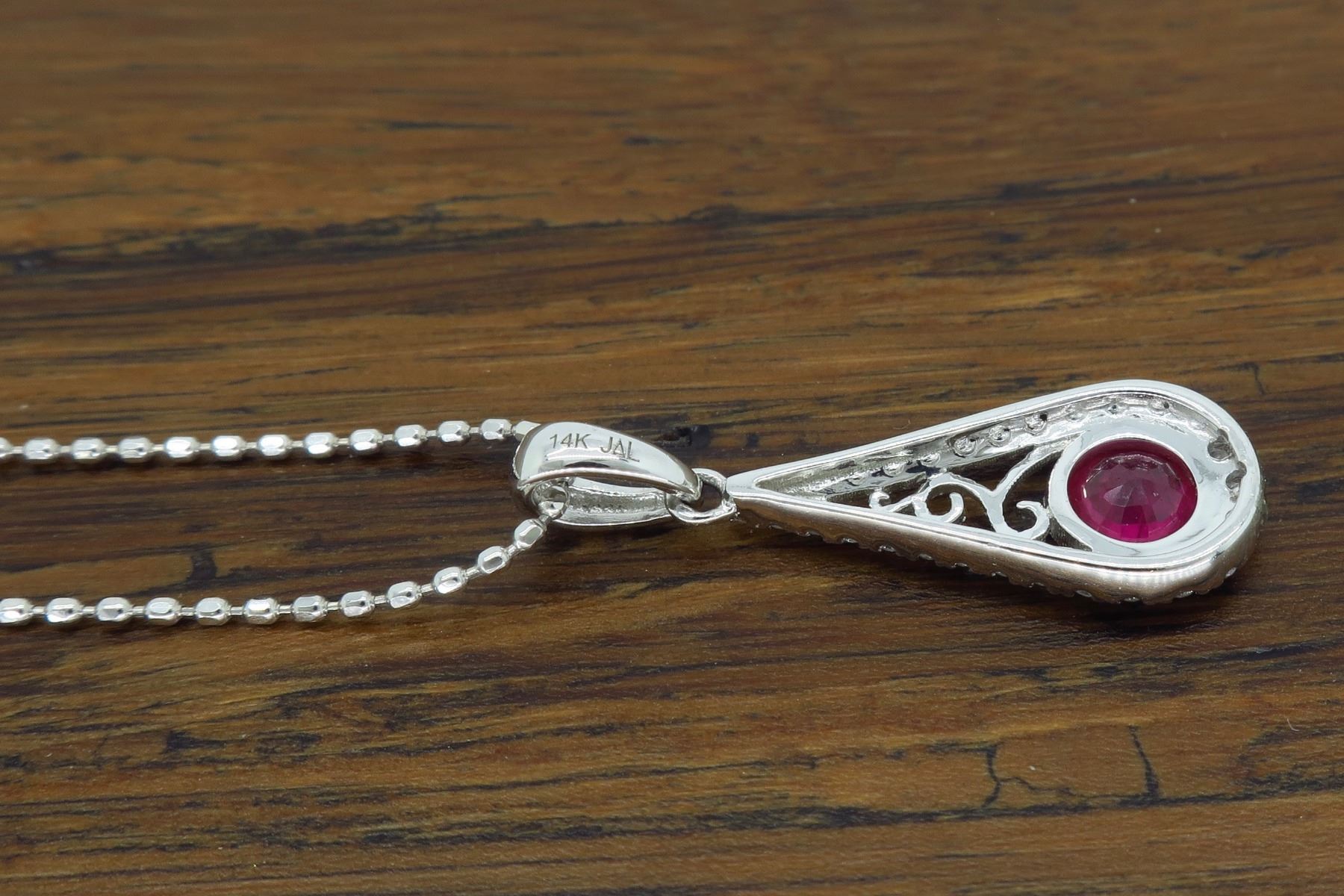 (1) Ruby with a total weight of 0.30cts. (28) round Diamonds with a total weight of 0.14cts with a color of G-I and clarity of SI-2. Total weight of this pendant is 3.1 grams. Total length of this chain is 16 inches.