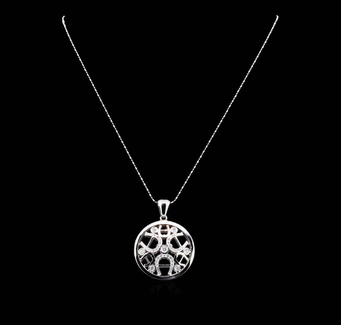 One electronically tested 14KT white gold ladies cast diamond pendant & chain 18.0" long, with a spring ring clasp with a bright polish finish. Identified with markings of "14K". Condition is new. Containing: One prong set round brilliant cut diamond, measuring 3.50 - 3.50 x 2.10mm (depth est.) approximate total weight of 0.16ct. Clarity: I-1. Color: H, Cut is Good. Six bezel set round brilliant cut diamonds, measuring 2.50 - 2.50 x 1.50mm (depth est.) approximate total weight of 6 Stones = 0.34ct. Clarity: SI-1 to I-1. Color: H - I, Cut is Good. Twenty-Seven prong set round brilliant cut diamonds, measuring 1.50 - 1.50 x 0.90mm (depth est.) approximate total weight of 27 Stones = 0.50ct. Clarity: SI-1 to I-1. Color: H - I, Cut is Good. All diamonds are graded in the mounting, unless otherwise stated. Total Weight of Diamonds 1.00ct. Total Weight of Pendant & Chain 13.46 grams. GGL Appraised at $4,205.00.
