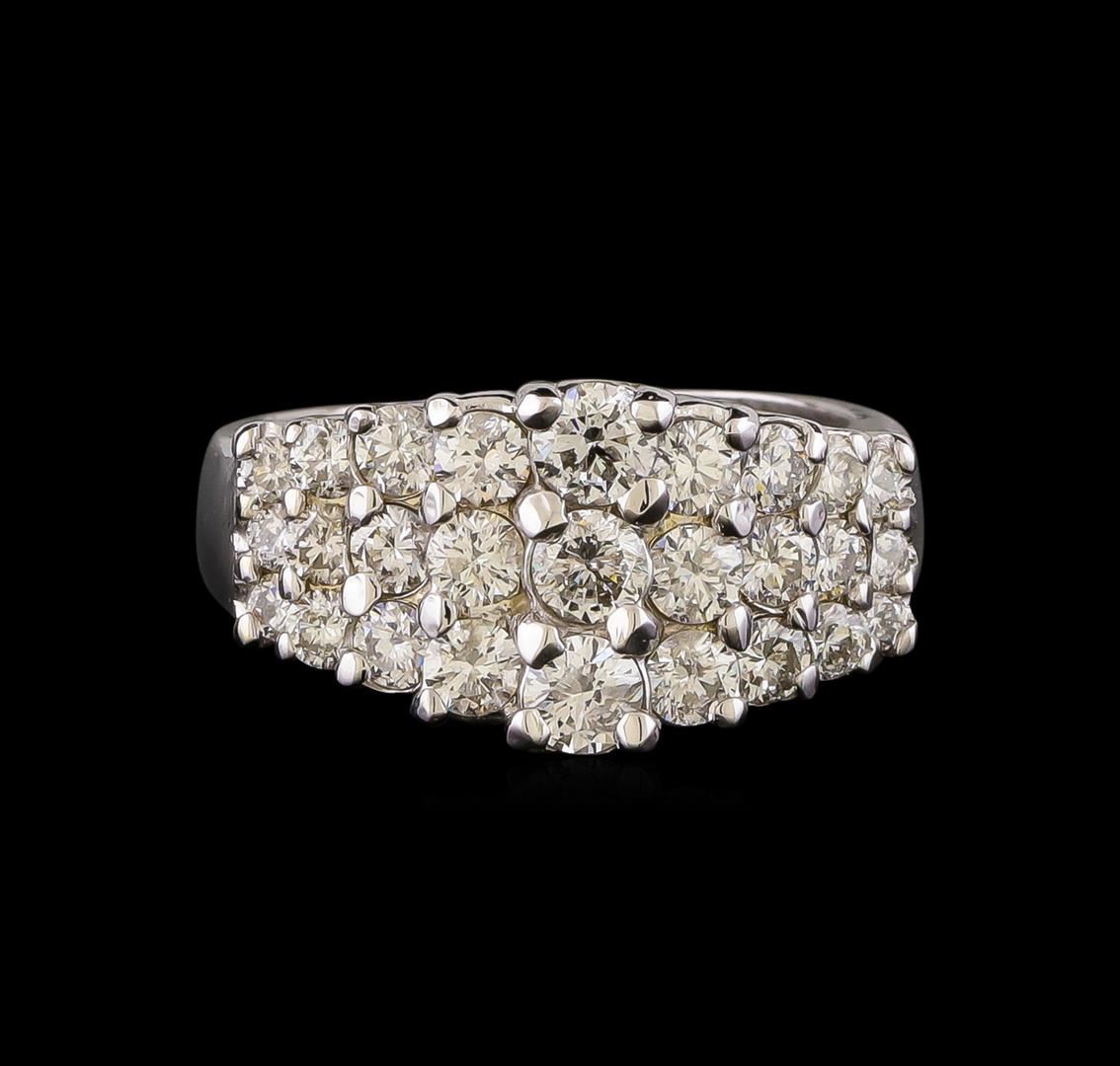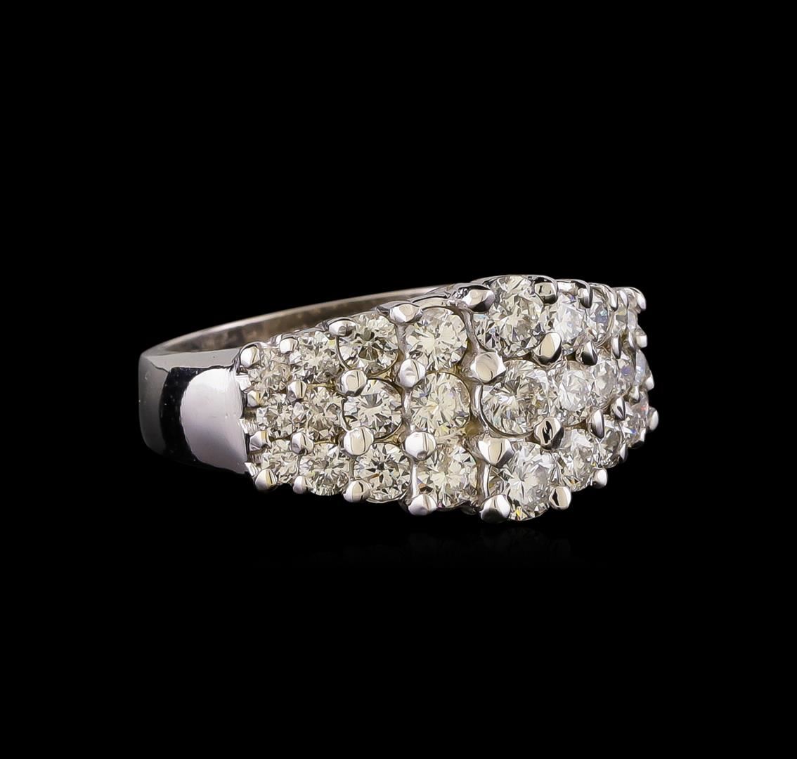 One electronically tested 14KT white gold ladies cast diamond ring with a flat shank with a bright polish finish. Identified with markings of "14K". Condition is new. Containing: Three prong set round brilliant cut diamonds, measuring 3.00 - 3.00 x 1.80mm (depth est.) approximate total weight of 3 Stones = 0.30ct. Clarity: SI-2 to I-1. Color: I - J, Cut is Good. Twenty-Four prong set round brilliant cut diamonds, measuring 2.50 - 1.50 x 1.20mm (depth est.) approximate total weight of 24 Stones = 0.70ct. Clarity: SI-1 to SI-2. Color: I - J, Cut is Good. All diamonds are graded in the mounting, unless otherwise stated. Total Weight of Diamonds 1.00ct. Total Weight of Ring 6.70 grams. GGL Appraised at $4,300.00.