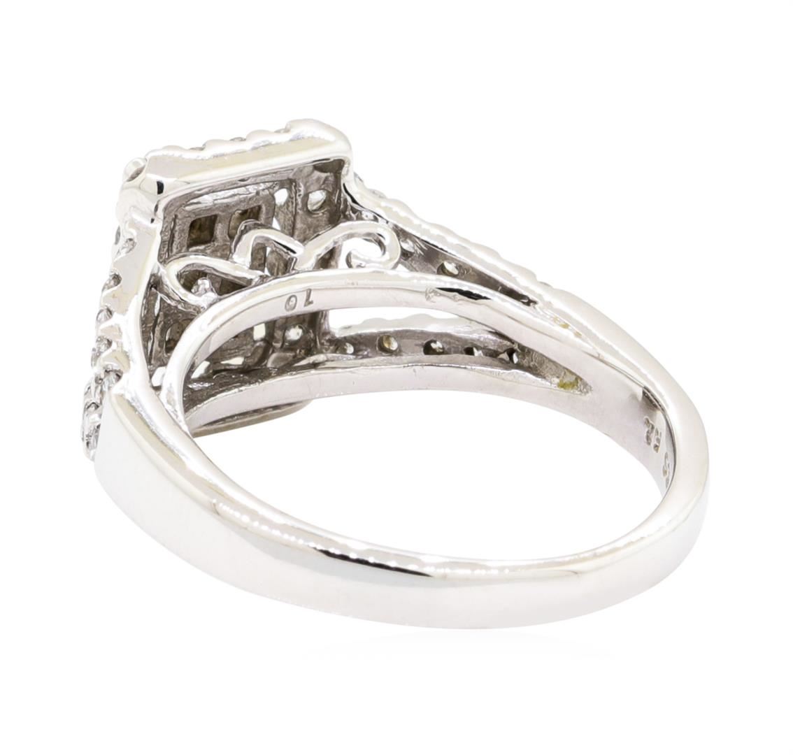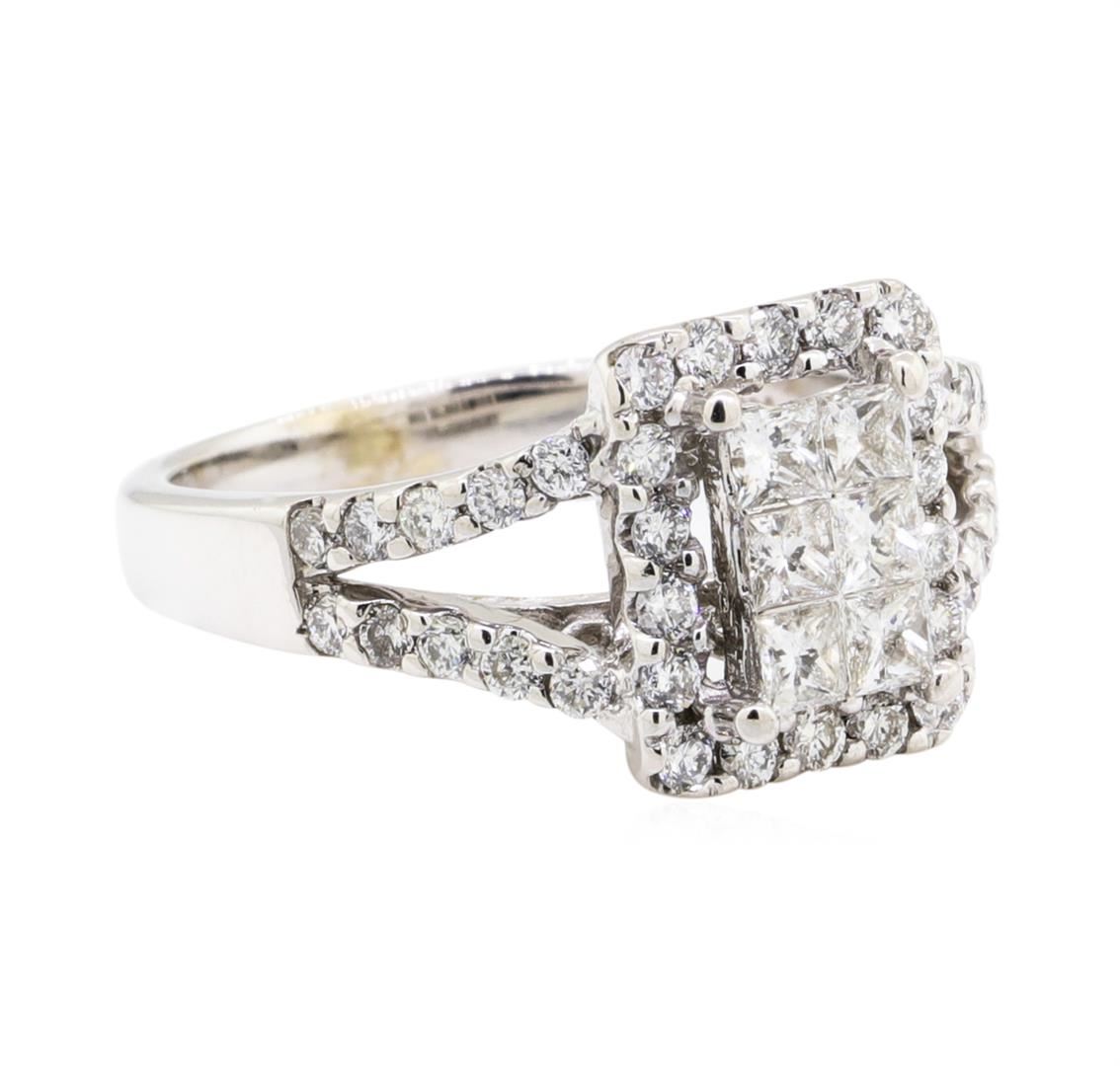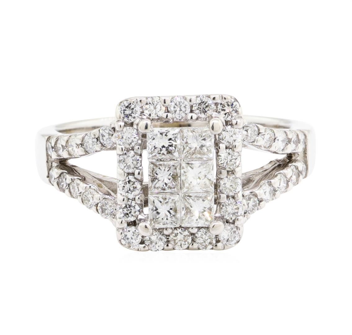 One electronically tested 14KT white gold lady's cast fashion ring with a split shank halo with a bright polish finish. The featured lady's ring has a shank measuring 2.30 millimeters wide. Identified with markings of '14K'. Condition is new, good workmanship. Containing: Six invisible set princess cut diamonds, measuring 2.30 x 2.25 x 1.69mm (depth est.) approximate total weight of 6 Stones = 0.45ct. Graded in the setting. Color H - I Clarity SI-2 to I-1 Cut Good Thirty-Eight prong set round brilliant cut diamonds, measuring 1.60 - 1.50 x 0.96mm (depth est.) approximate total weight of 38 Stones = 0.55ct. Graded in the setting. Color H - I Clarity SI-1 to SI-2 Cut Good. Total Weight of Diamonds 1.00ct. Total Weight of Ring 4.40gm. GAS Appraised.