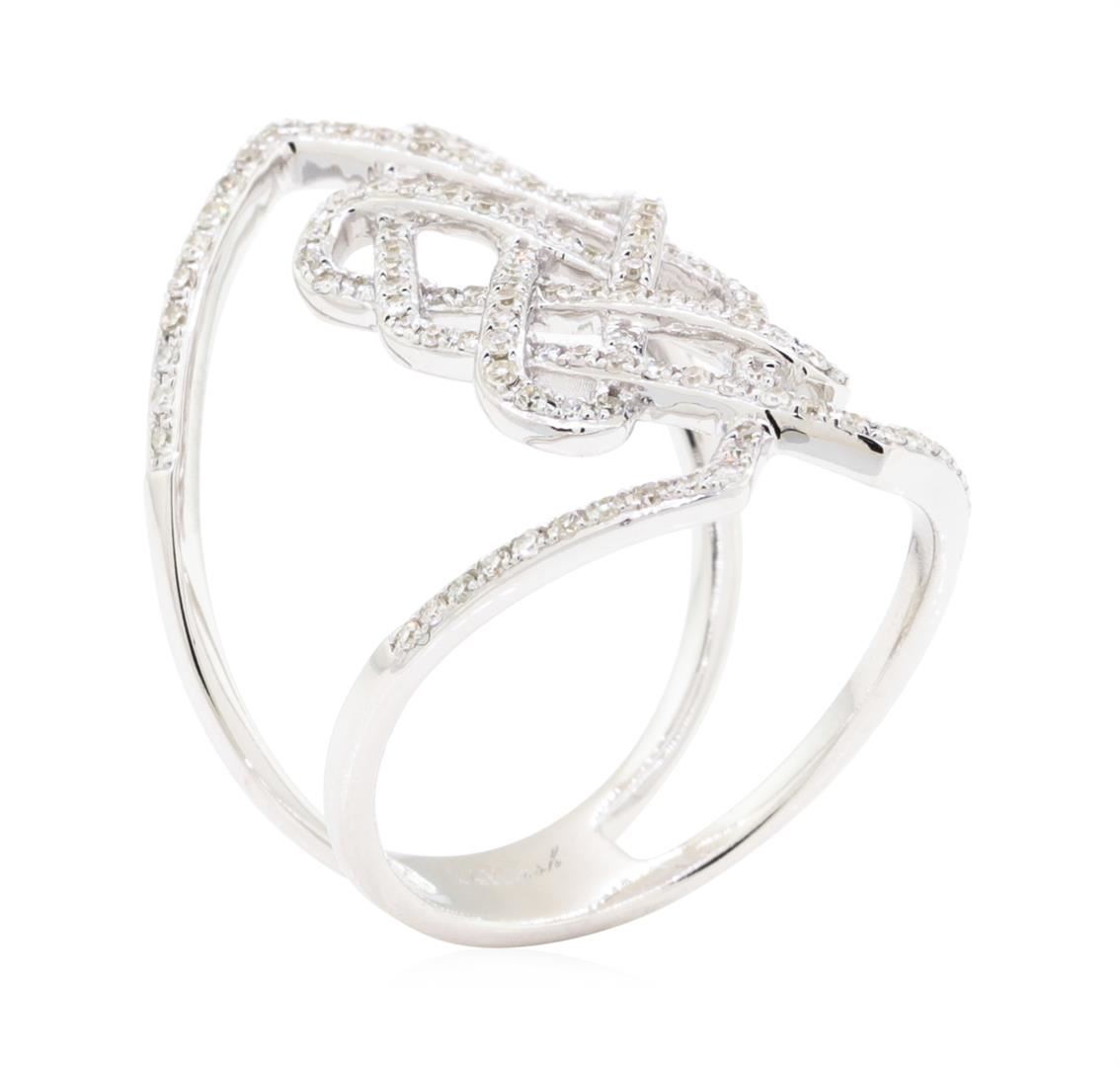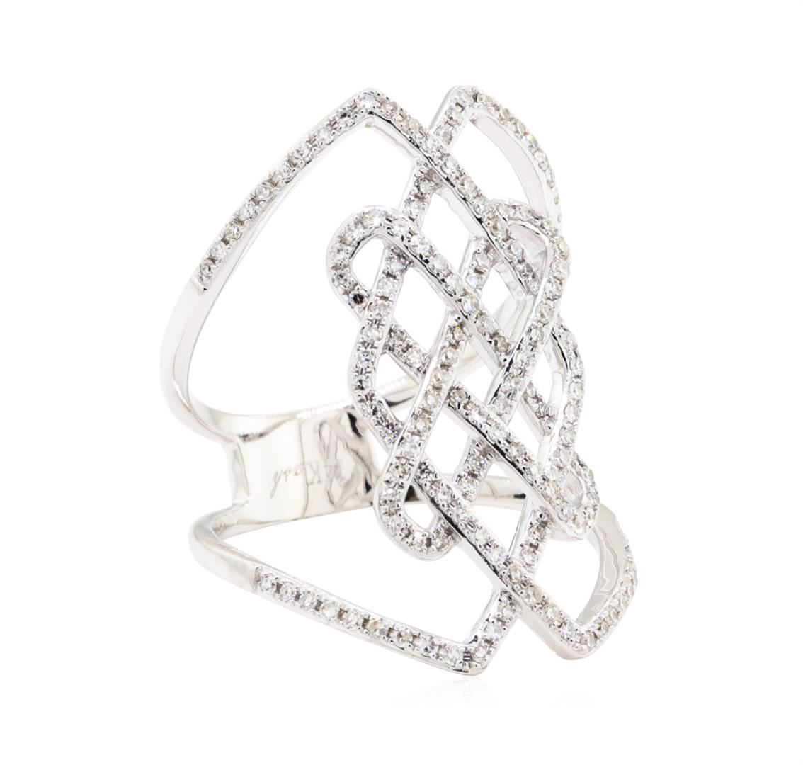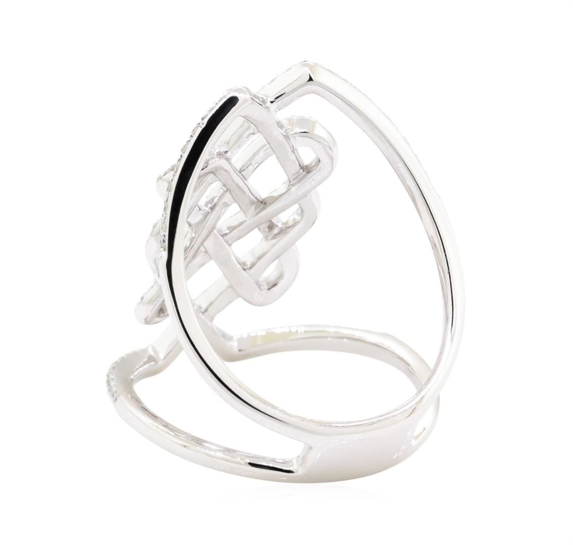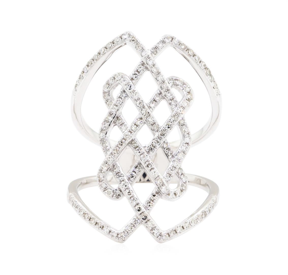 One wide band geometric crossover ring featuring: 14KT white gold weighing 5.5 grams containing diamonds weighing 1.00ctw. The ring is a size 7.