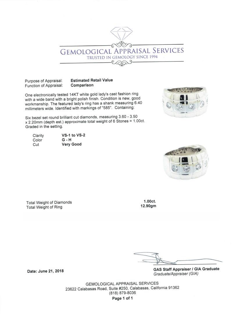 One electronically tested 14KT white gold lady's cast fashion ring with a wide band with a bright polish finish. The featured lady's ring has a shank measuring 6.40 millimeters wide. Identified with markings of '585'. Condition is new, good workmanship. Containing: Six bezel set round brilliant cut diamonds, measuring 3.60 - 3.50 x 2.20mm (depth est.) approximate total weight of 6 Stones = 1.00ct. Graded in the setting. Color G - H Clarity VS-1 to VS-2 Cut Very Good. Total Weight of Diamonds 1.00ct. Total Weight of Ring 12.90gm. GAS Appraised.