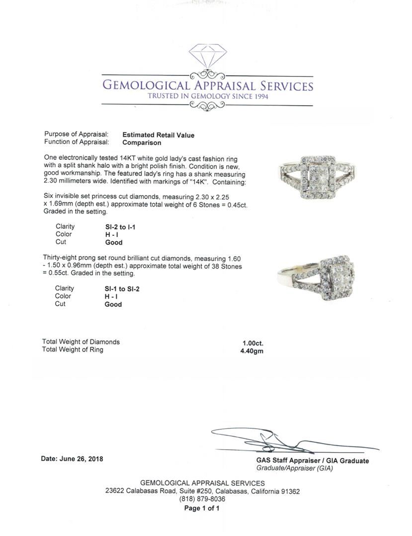 One electronically tested 14KT white gold lady's cast fashion ring with a split shank halo with a bright polish finish. The featured lady's ring has a shank measuring 2.30 millimeters wide. Identified with markings of '14K'. Condition is new, good workmanship. Containing: Six invisible set princess cut diamonds, measuring 2.30 x 2.25 x 1.69mm (depth est.) approximate total weight of 6 Stones = 0.45ct. Graded in the setting. Color H - I Clarity SI-2 to I-1 Cut Good Thirty-Eight prong set round brilliant cut diamonds, measuring 1.60 - 1.50 x 0.96mm (depth est.) approximate total weight of 38 Stones = 0.55ct. Graded in the setting. Color H - I Clarity SI-1 to SI-2 Cut Good. Total Weight of Diamonds 1.00ct. Total Weight of Ring 4.40gm. GAS Appraised.