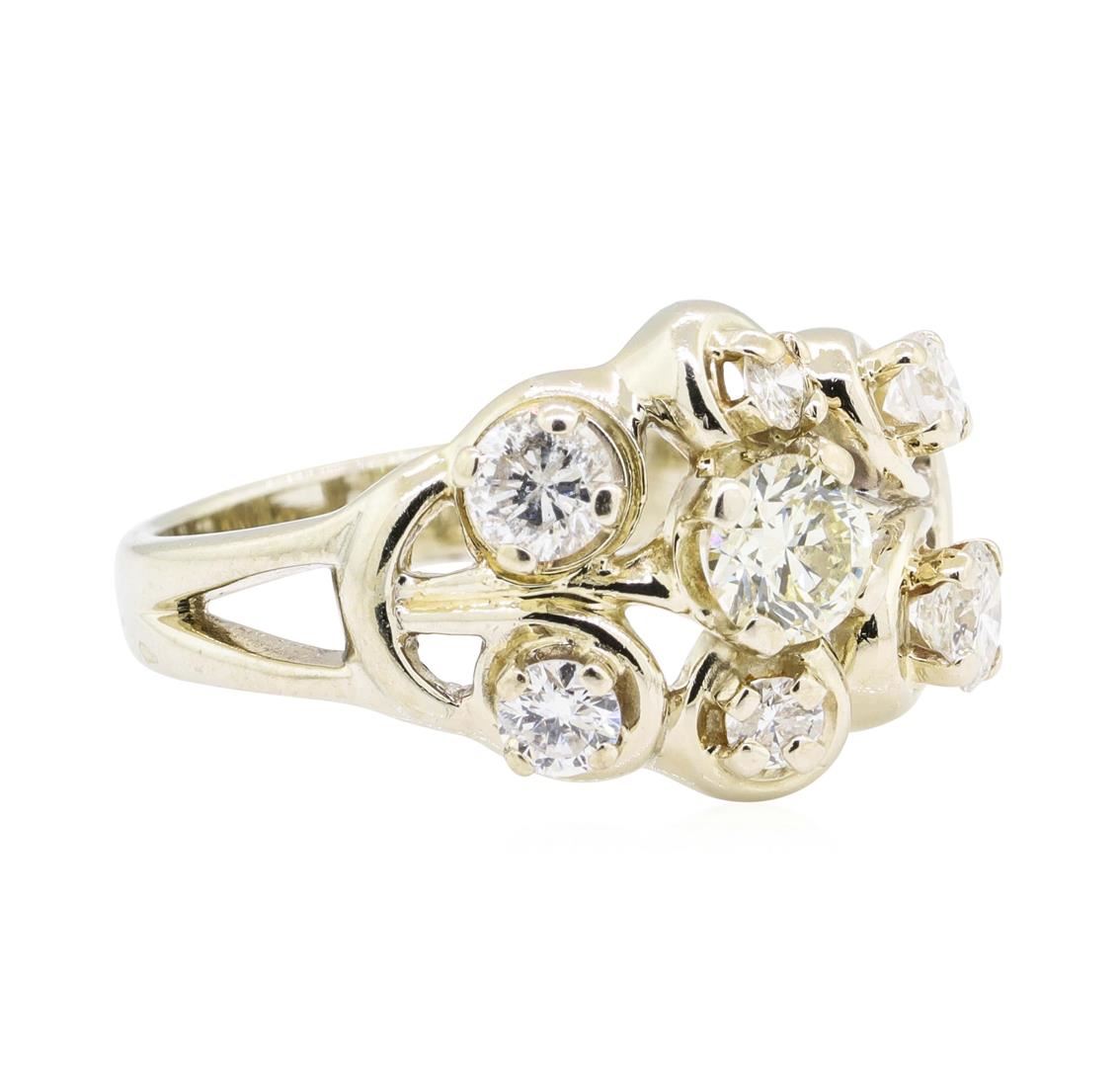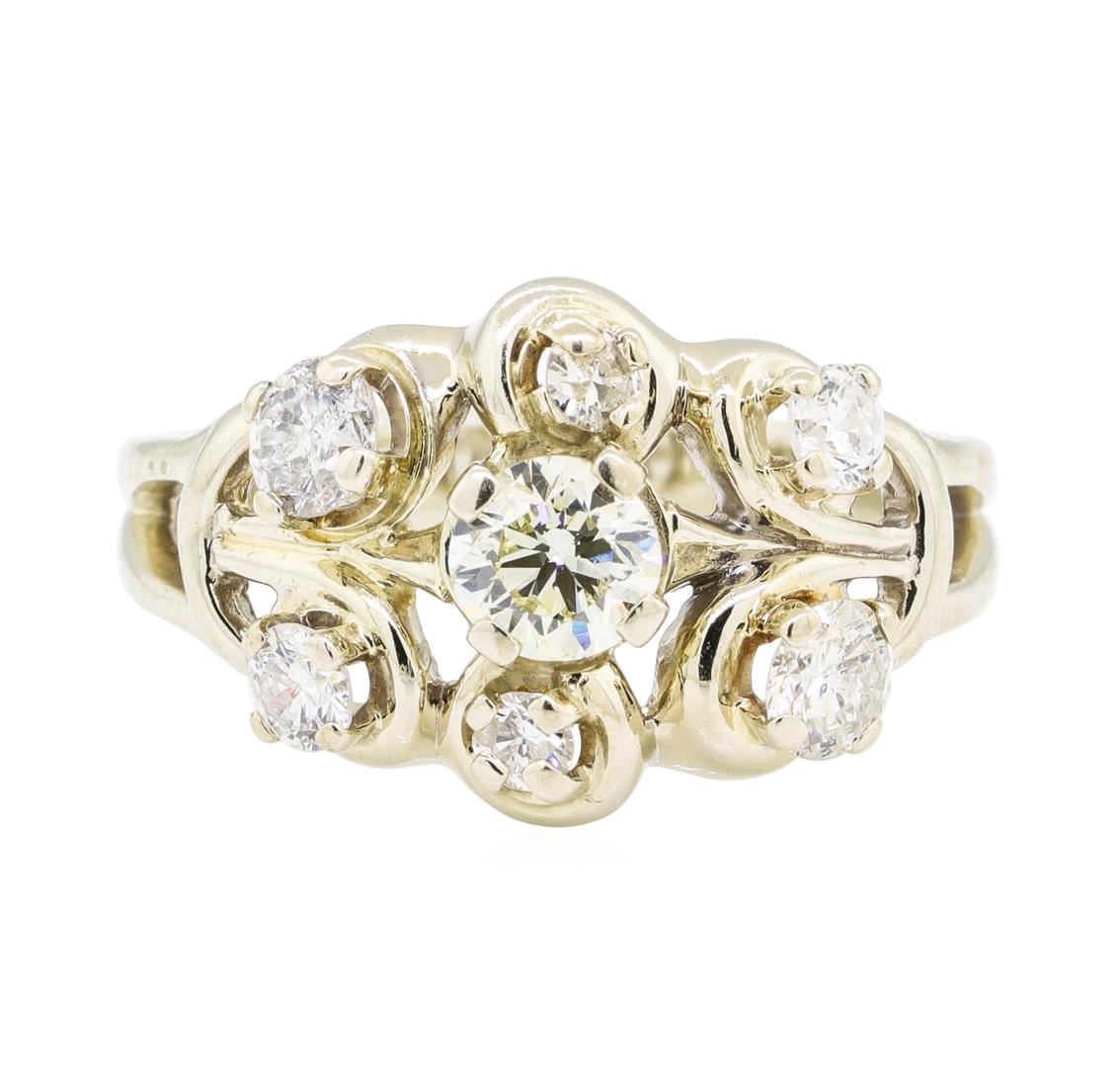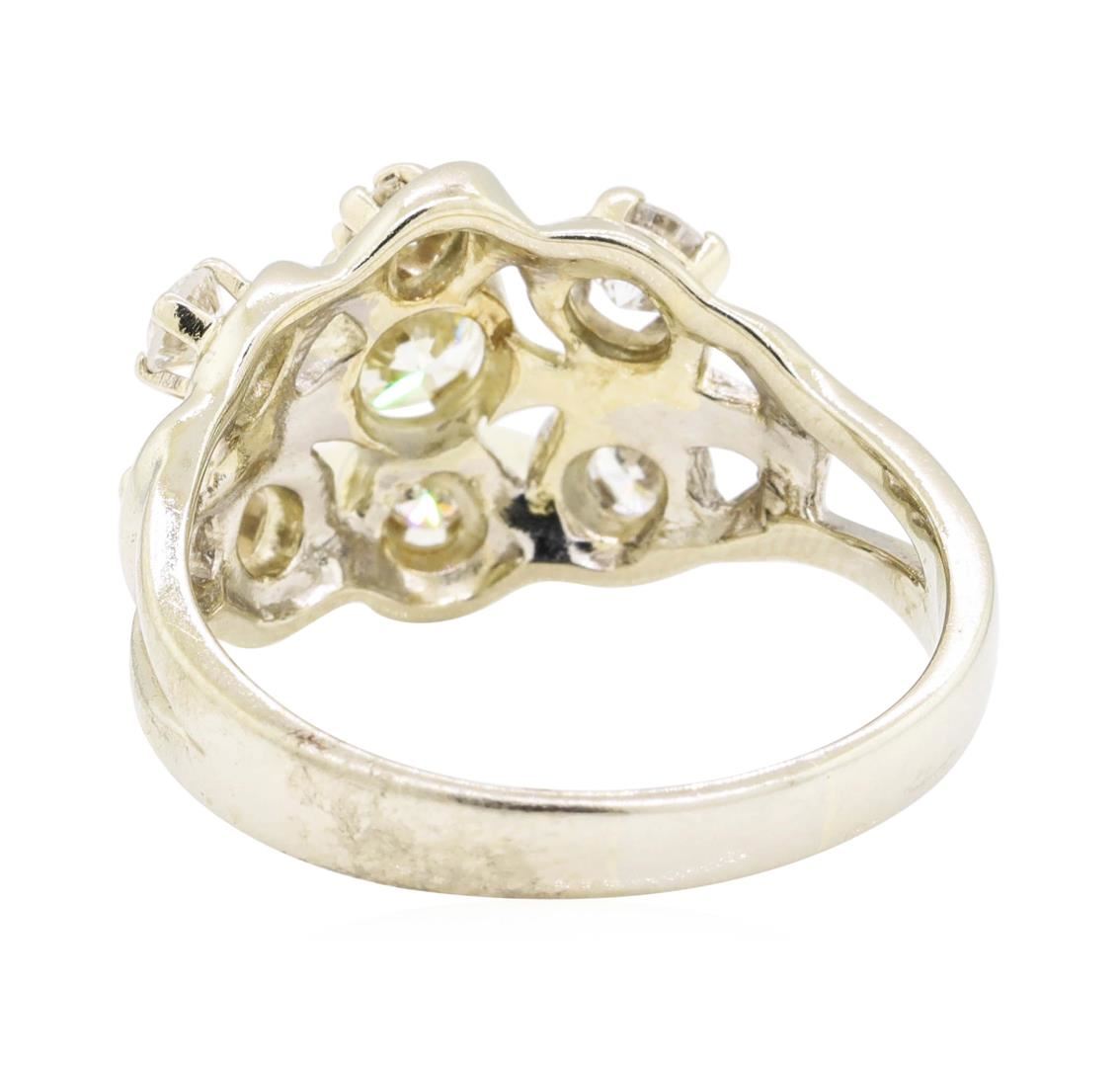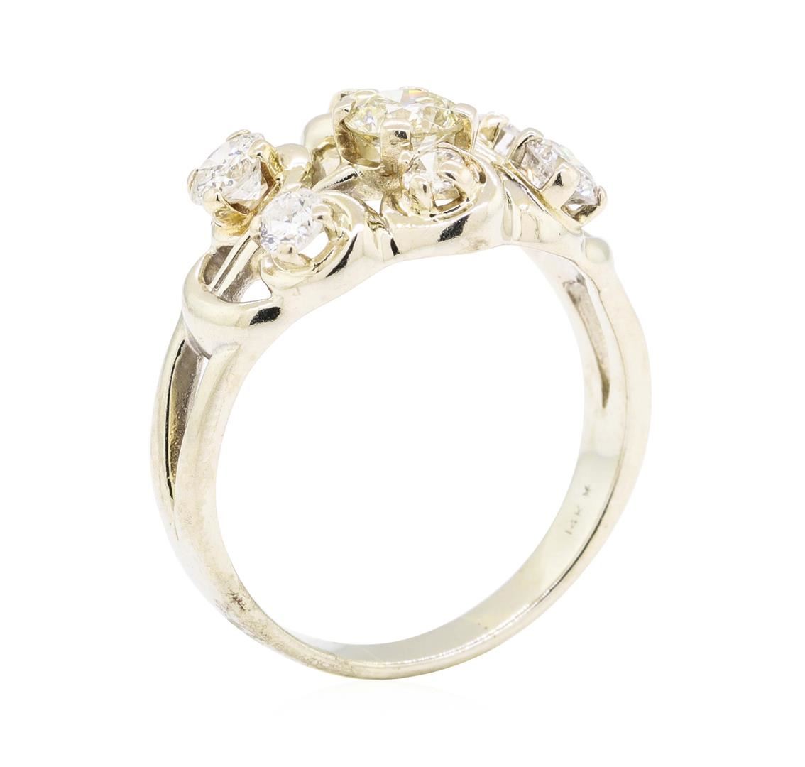 One electronically tested 14KT white gold lady's cast fashion ring with a split shank with a bright polish finish. The featured lady's ring has a scroll pattern top and a shank measuring 3.00 millimeters wide. Identified with markings of '14K'. Condition is used, good workmanship. Containing: One prong set round brilliant cut diamond, measuring 5.13 - 5.10 x 3.10mm (depth est.) approximate weight of 0.50ct. Graded in the setting. Color J - K Clarity VS-2 Cut Very Good Two prong set round brilliant cut diamonds, measuring 4.10 - 4.05 x 2.49mm (depth est.) approximate total weight of 2 Stones = 0.50ct. Graded in the setting. Color H - I Clarity SI-2 to I-1 Cut Good Two prong set round brilliant cut diamonds, measuring 3.20 - 3.10 x 1.95mm (depth est.) approximate total weight of 2 Stones = 0.24ct. Graded in the setting. Color G - I Clarity VS-2 to SI-1 Cut Good Two prong set round brilliant cut diamonds, measuring 2.70 - 2.60 x 1.64mm (depth est.) approximate total weight of 2 Stones = 0.14ct. Graded in the setting. Color H - I Clarity SI-1 to SI-2 Cut Good. Total Weight of Diamonds 1.38ct.. Total Weight of Ring 5.60gm. GAS Appraised.