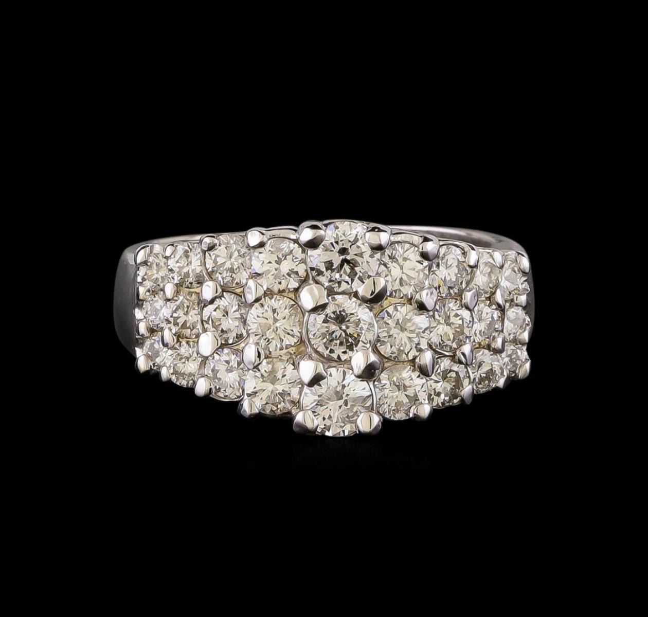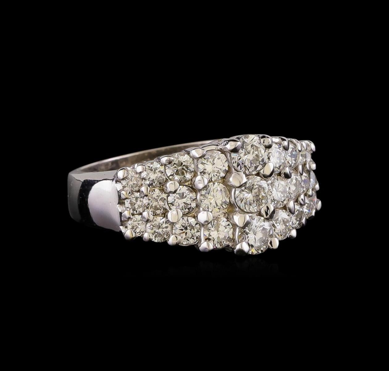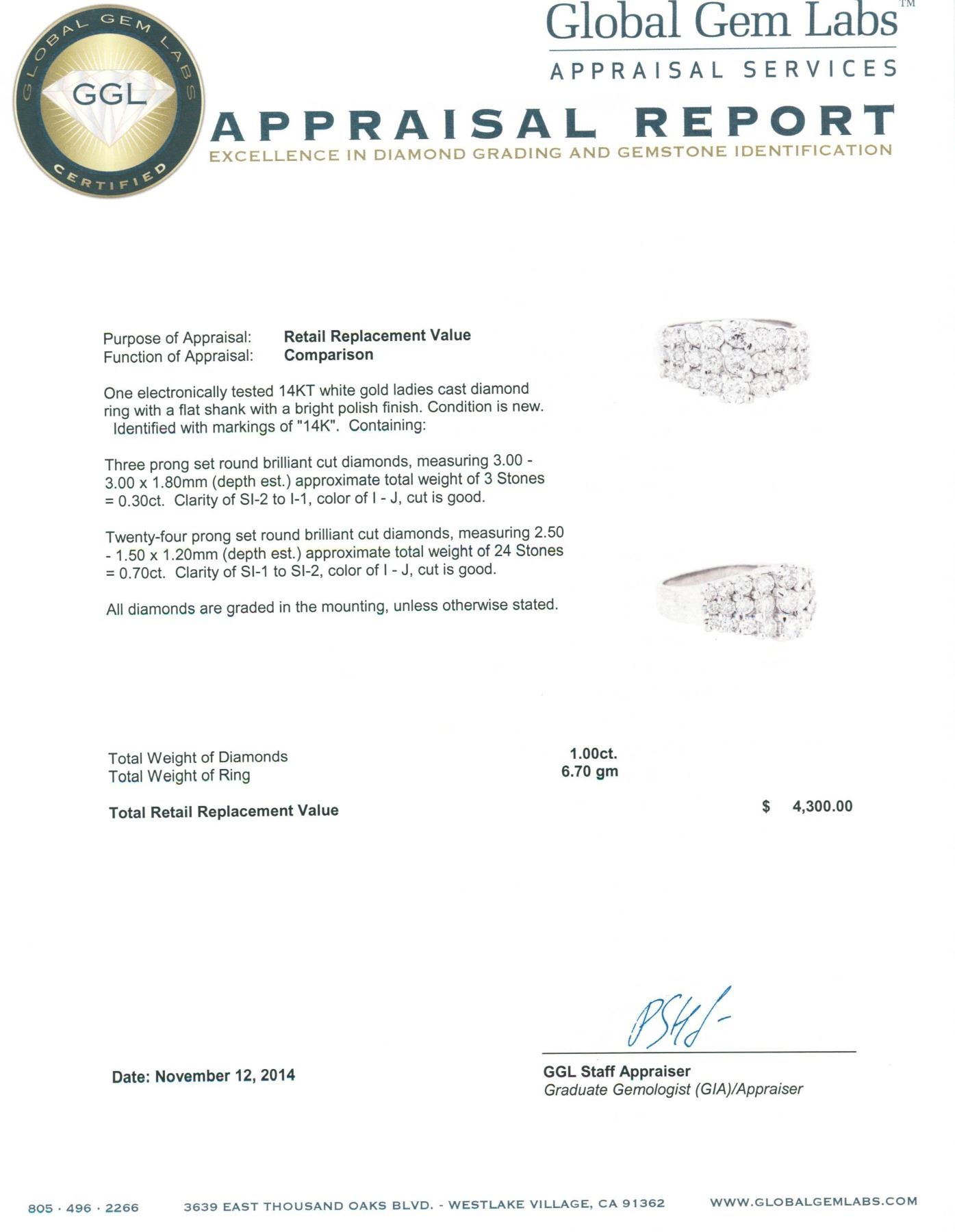 One electronically tested 14KT white gold ladies cast diamond ring with a flat shank with a bright polish finish. Identified with markings of "14K". Condition is new. Containing: Three prong set round brilliant cut diamonds, measuring 3.00 - 3.00 x 1.80mm (depth est.) approximate total weight of 3 Stones = 0.30 ct. Clarity: SI-2 to I-1. Color: I - J, Cut is Good. Twenty-Four prong set round brilliant cut diamonds, measuring 2.50 - 1.50 x 1.20mm (depth est.) approximate total weight of 24 Stones = 0.70 ct. Clarity: SI-1 to SI-2. Color: I - J, Cut is Good. All diamonds are graded in the mounting, unless otherwise stated. Total Weight of Diamonds 1.00 ct. Total Weight of Ring 6.70 grams. GGL Appraised.