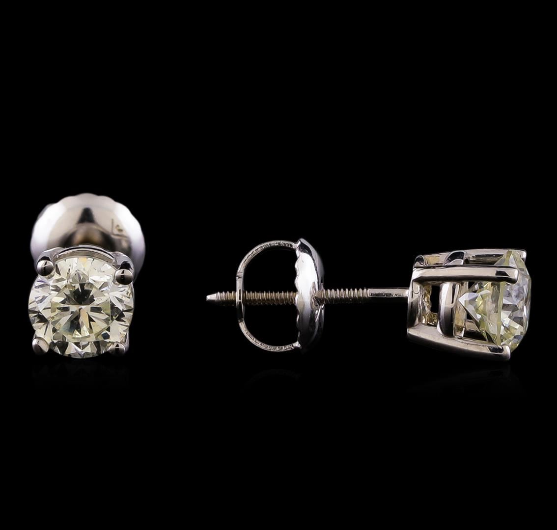 One pair electronically tested 14KT white gold cast & assembled diamond solitaire earrings with screw backs. Condition is new, good workmanship. Containing: One prong set round brilliant cut diamond, measuring 5.03 - 5.01 x 3.31mm (depth est.), 2.00% GTCF approximate weight of 0.52ct with a very strong blue fluorescence. Graded in the setting. Clarity: SI-2. Color: 65.9%. Table 53.4%. One prong set round brilliant cut diamond, measuring 4.83 - 4.80 x 3.01mm (depth est.), 10.00% GTCF approximate weight of 0.48ct with a very strong blue fluorescence. Graded in the setting. Clarity: SI-2. Color: K. Depth 62.5%. Table 61.2%. Total Weight of Diamonds 1.00ct. Total Weight of Earrings 1.00 grams. AIG Appraised at $4,200.00.